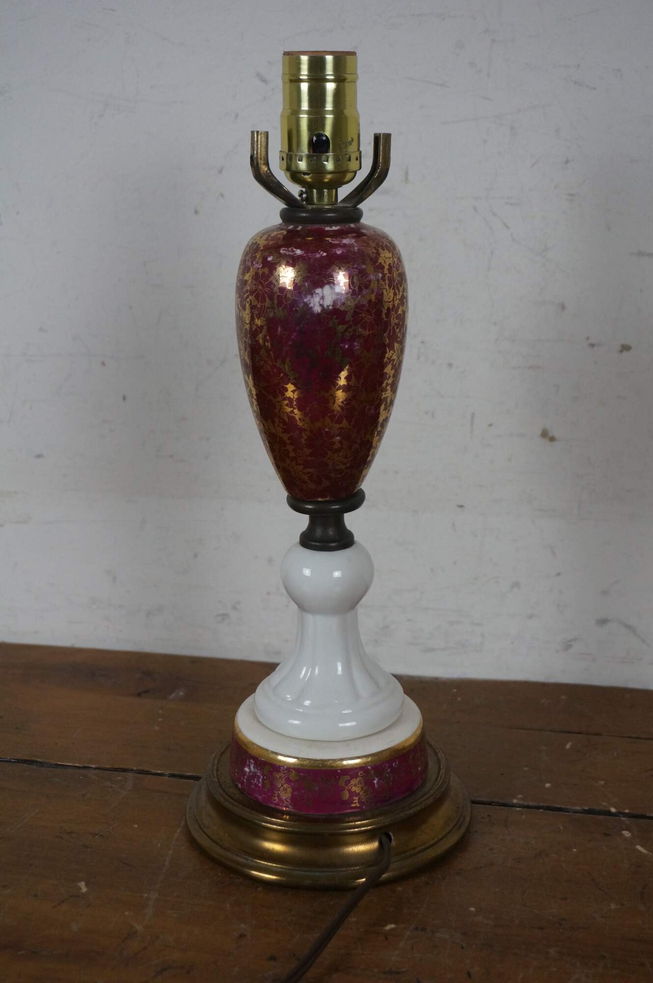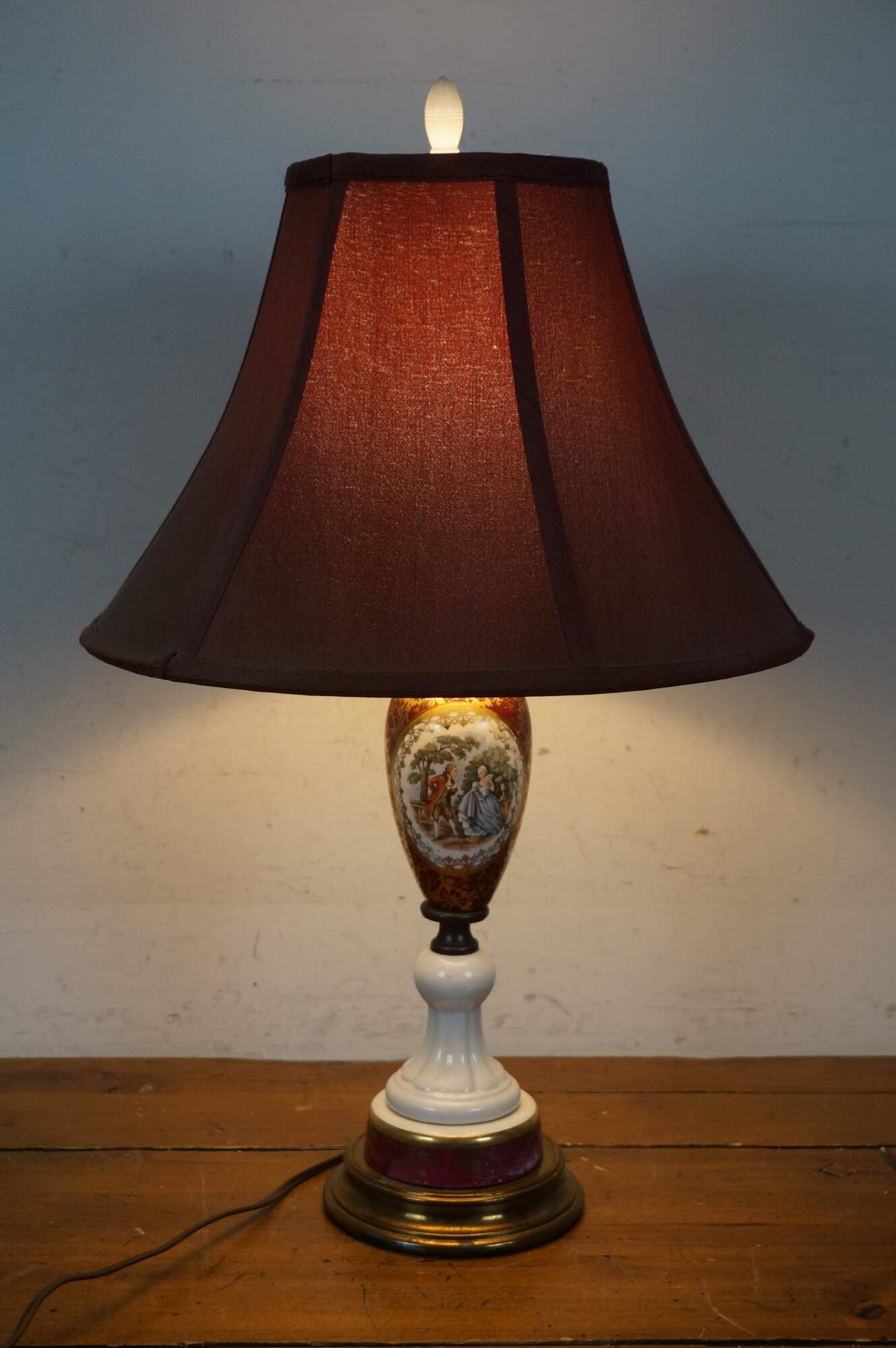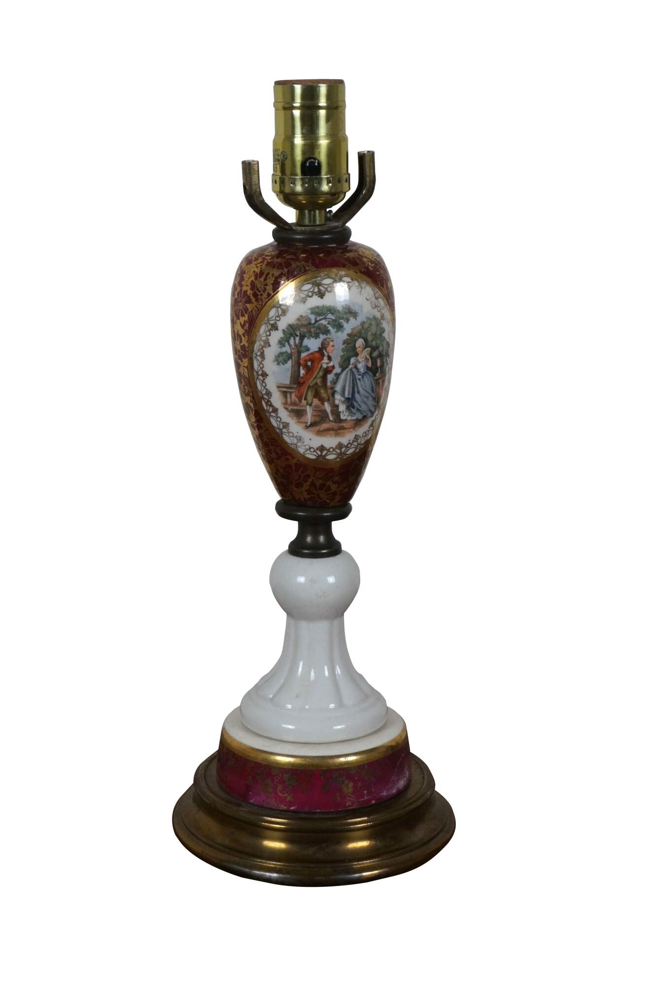 Mid century Sevres style porcelain table / vanity / boudoire mantel urn lamp with brass base, painted in burgundy overlaid with a gilt floral pattern surrounding an image of a French Provinical / Neoclassical couple on a stone veranda. Includes harp, white plastic finial, and burgundy fabric shade.