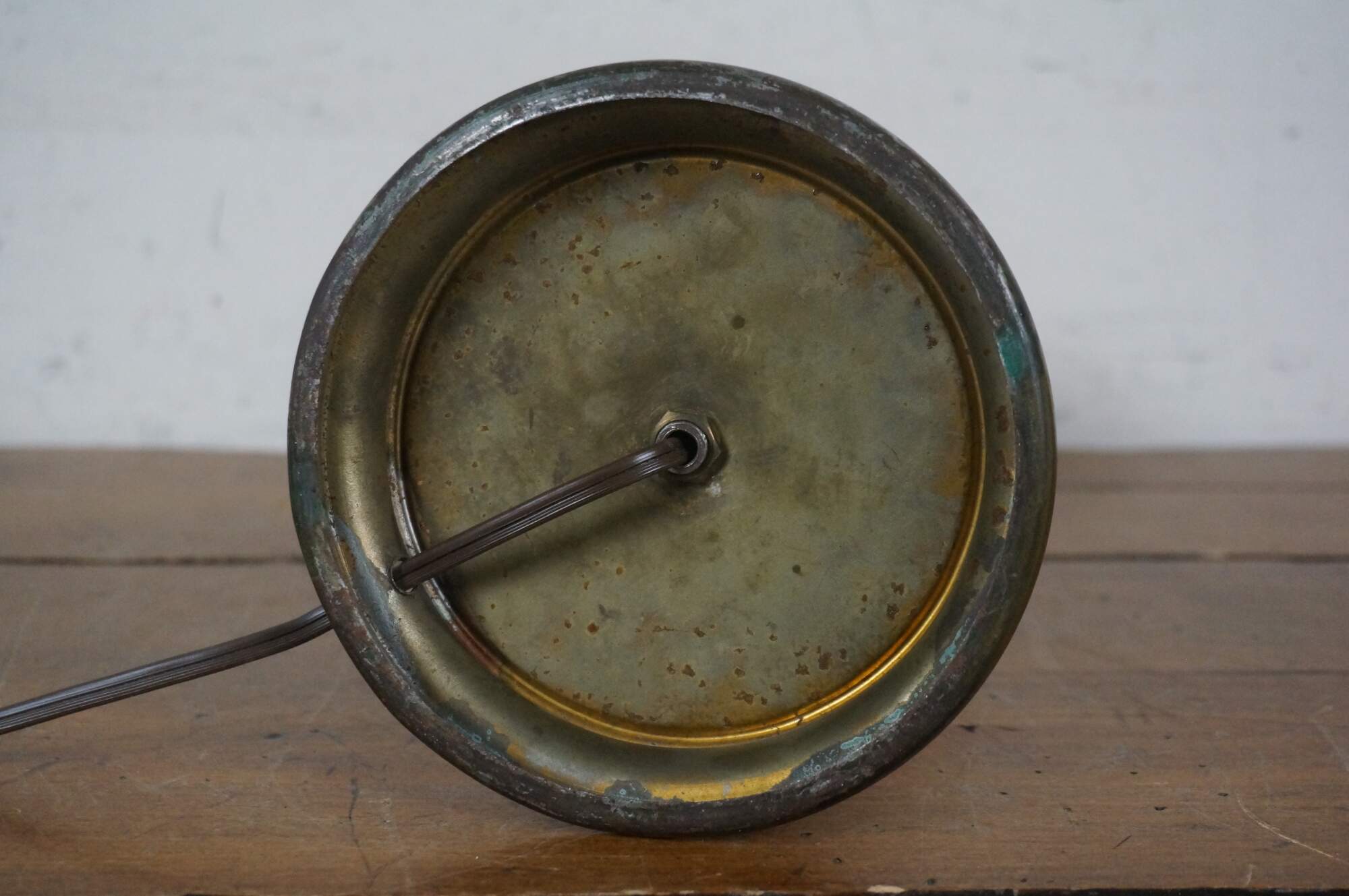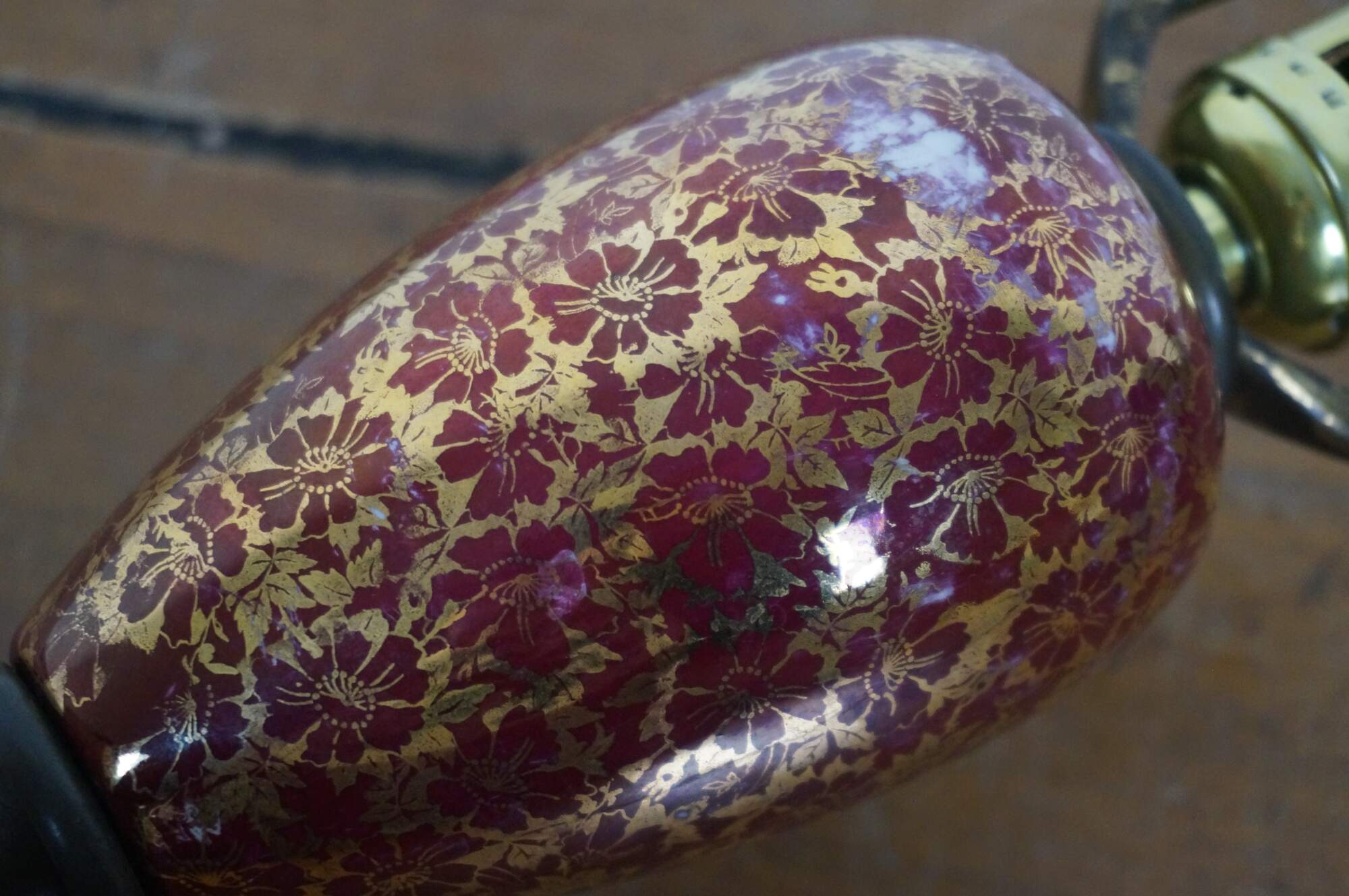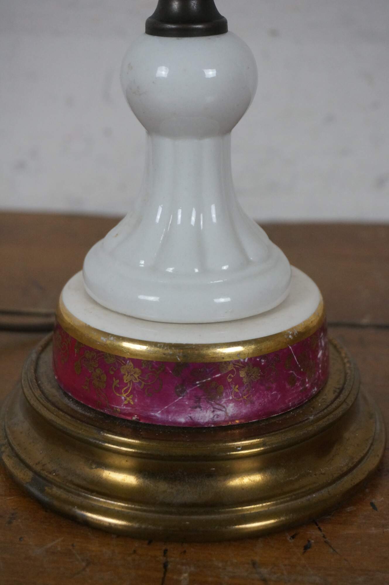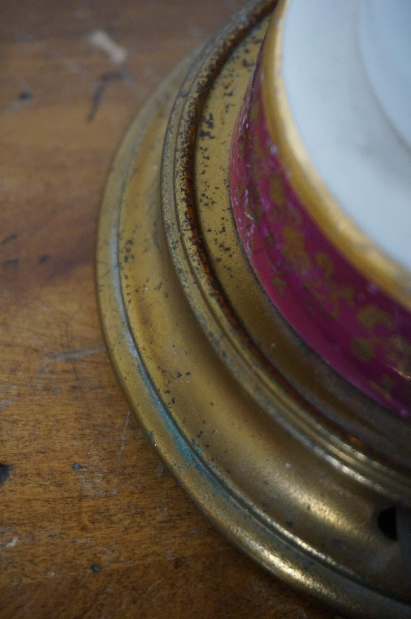 Mid century Sevres style porcelain table / vanity / boudoire mantel urn lamp with brass base, painted in burgundy overlaid with a gilt floral pattern surrounding an image of a French Provinical / Neoclassical couple on a stone veranda. Includes harp, white plastic finial, and burgundy fabric shade.