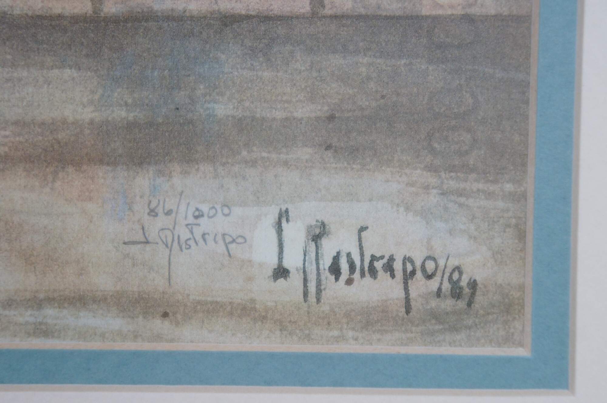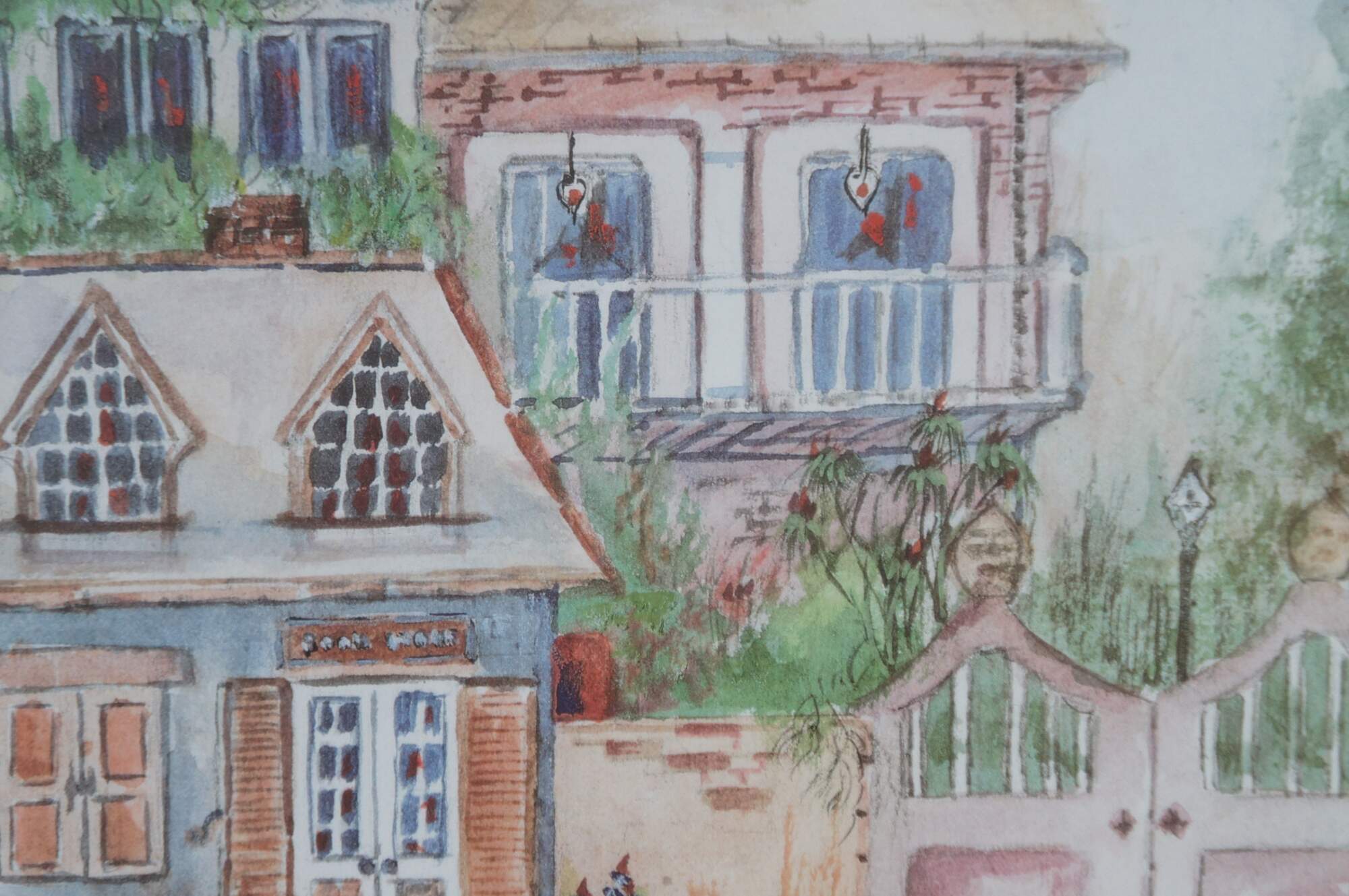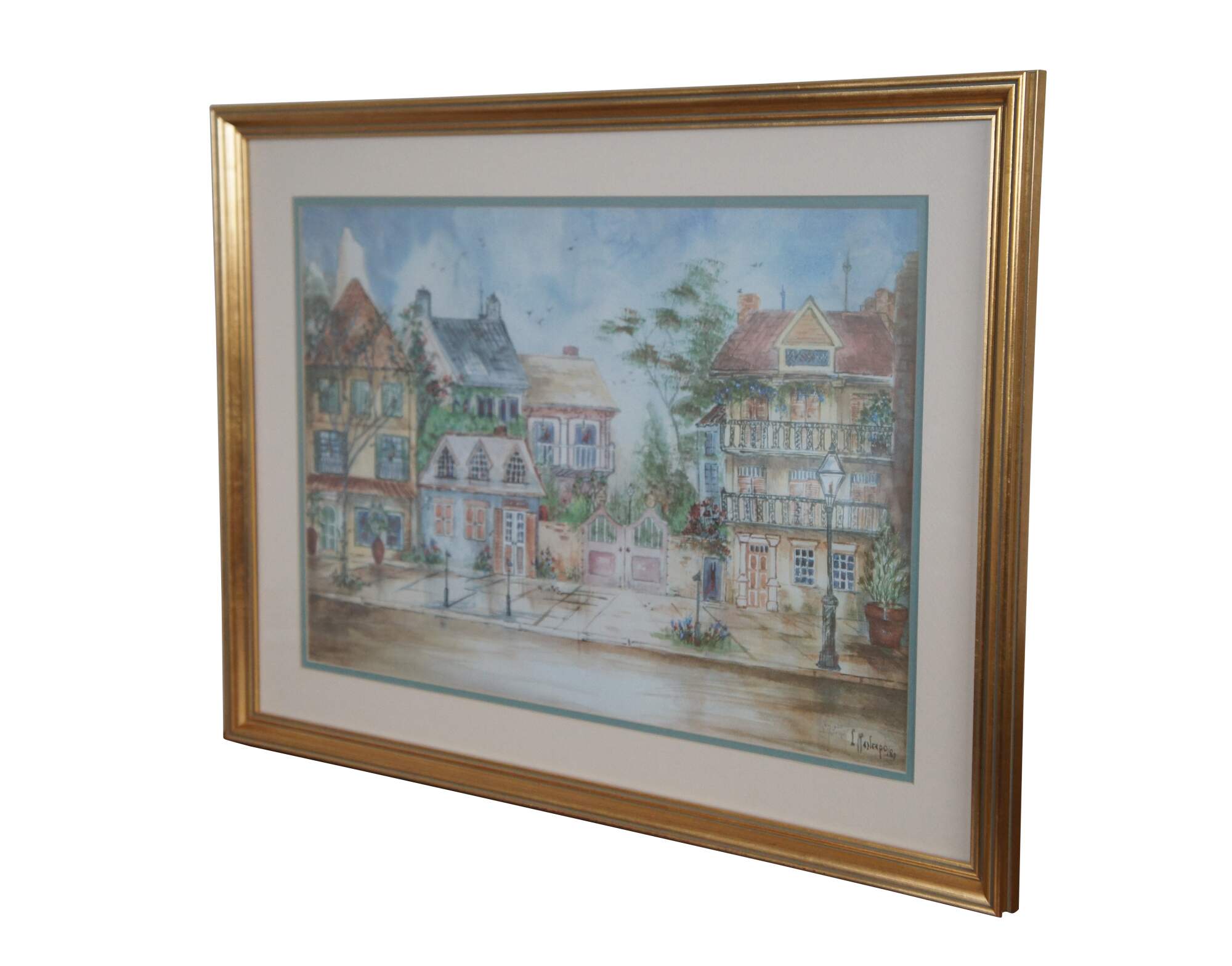 Mid century limited edition signed cityscape print by Lucretia Restrepo, produced by Siena Fine Arts of Wheeling West Virginia. Depicts a sunny city street with lush foliage amidst the buildings, one of which sports the intricate wrought iron balcony railings popular in New Orleans. Pencil signed lower right corner. Numbered 86/1000. Beveled gilt wood frame; layered white and blue mat.