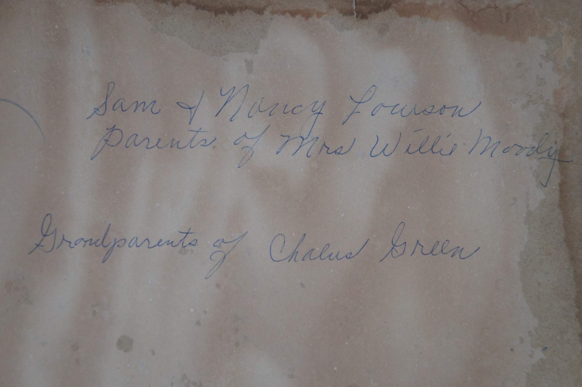 Pair of late 19th to early 20th century black and white charcoal portraits, identified on reverse as Sam & Nancy Jourson, Parents of Mrs Willie Moody, Grandparents of Chalus Green. Both depict a man and wife in Victorian era clothing. Unframed.