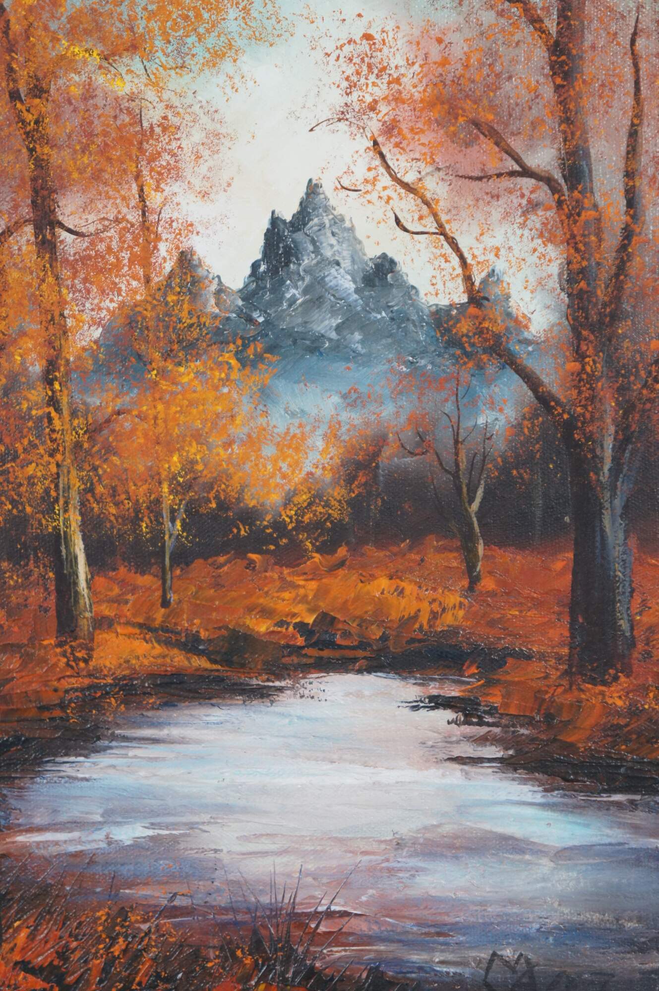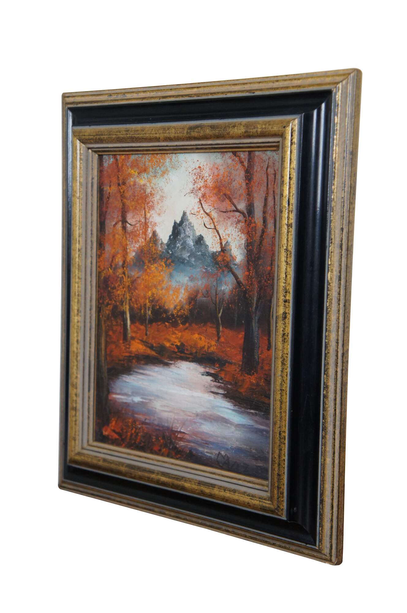Vintage Autumn Forest Mountain Pond Landscape Oil Painting 17"