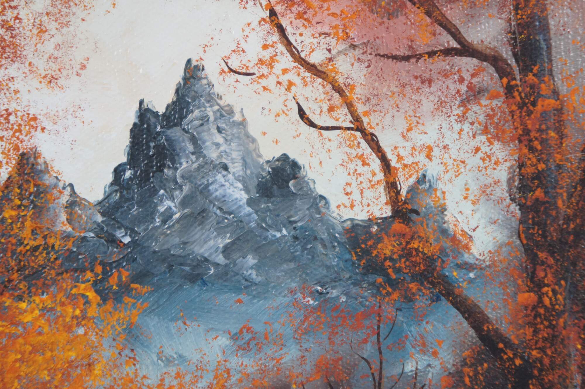 Late 20th-century oil painting on canvas depicting a richly colored impressionist-style autumn forest of red and orange trees around a small pond, with a bare mountain in the distance. Signed at lower right edge. Beveled giltwood frame with black painted detail.