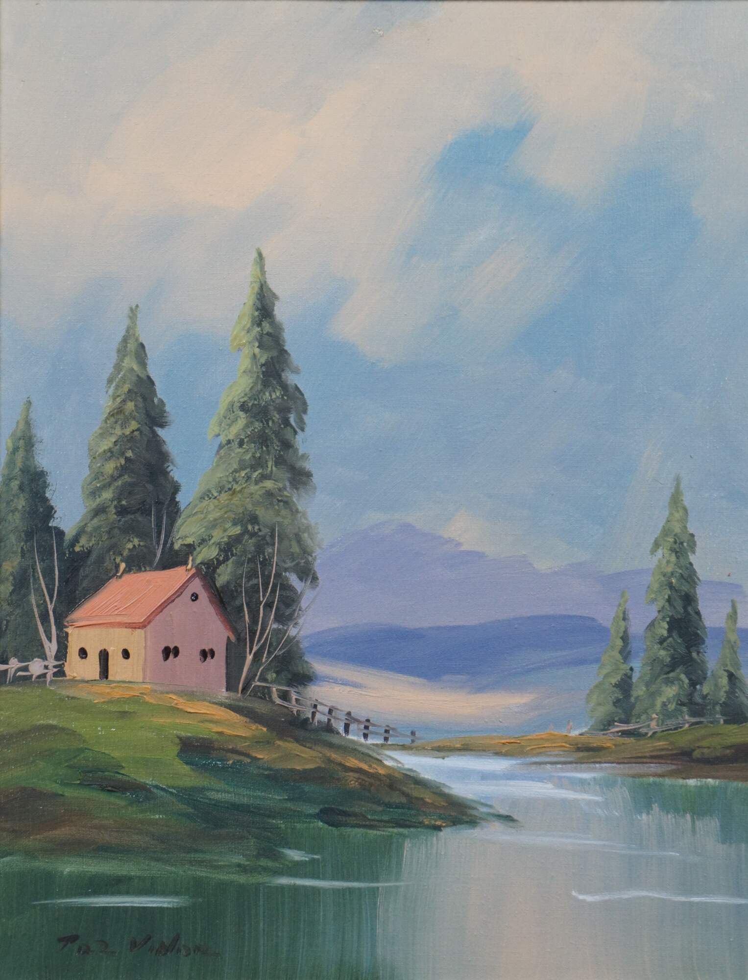 Late 20th century landscape oil painting on canvas depicting a cottage backed with pines, at the edge of a lake with hazy mountains in the background. Signed Taz in lower left corner. Carved and beveled giltwood frame; white linen mat.