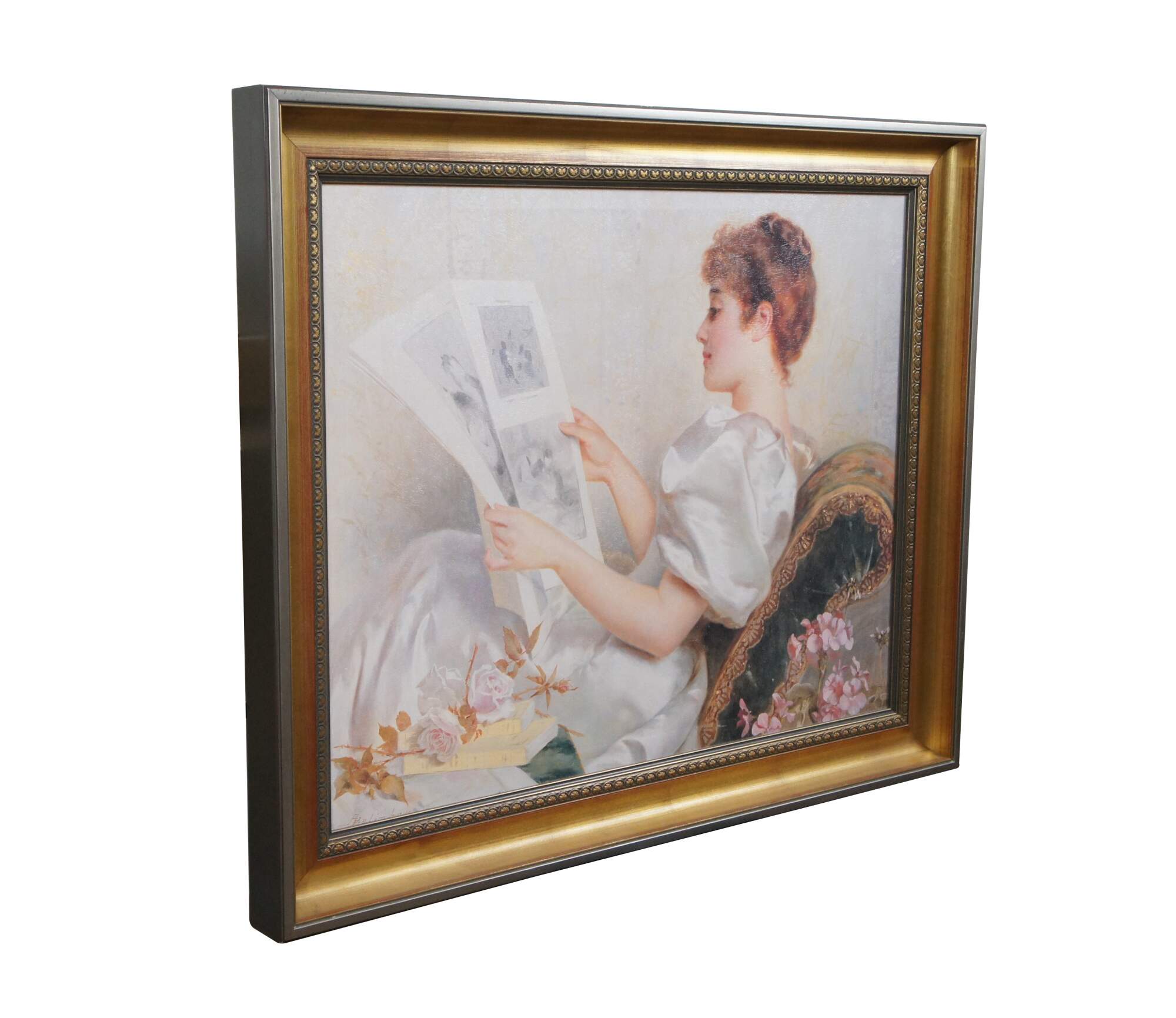 Late 20th century vintage print on canvas, finished with a lightly textured varnish, of "Lady Looking at Drawings, 1894" by Adolfo Belimbau. Depicts a woman in a white satin dress, reclining on a green and gold velvet chaise, looking at a set of engravings / etchings. Beveled giltwood frame with carved detail. JC Penny Exclusive Framed Art.