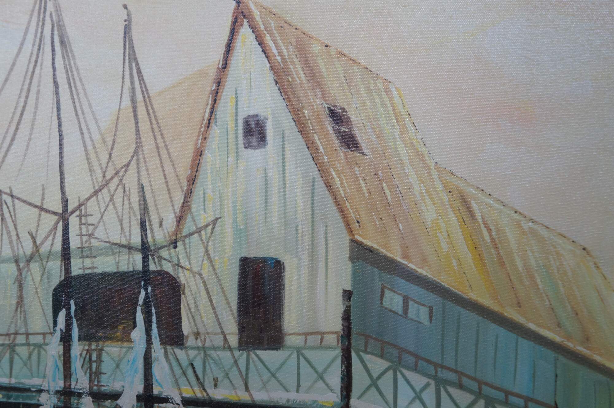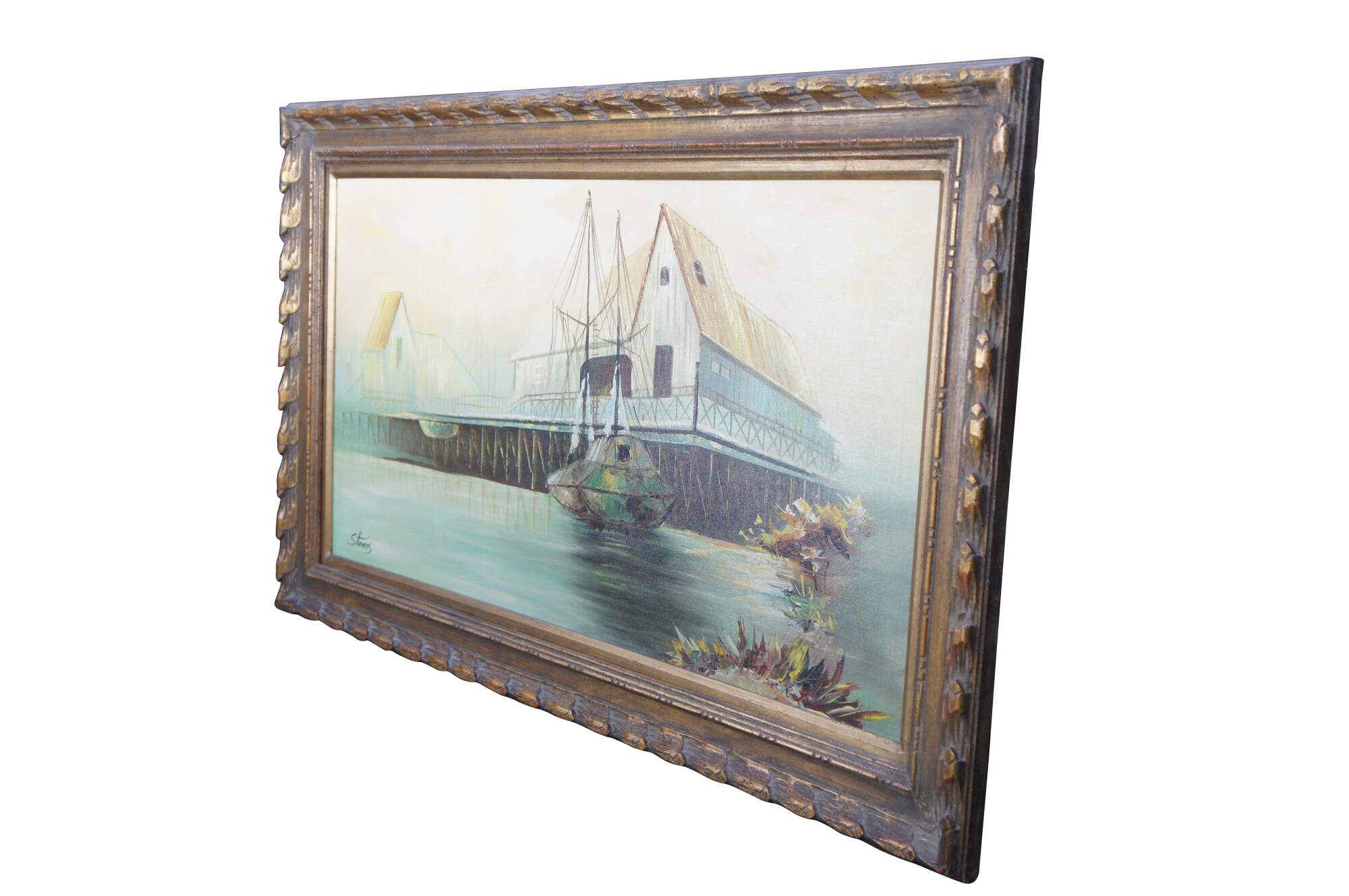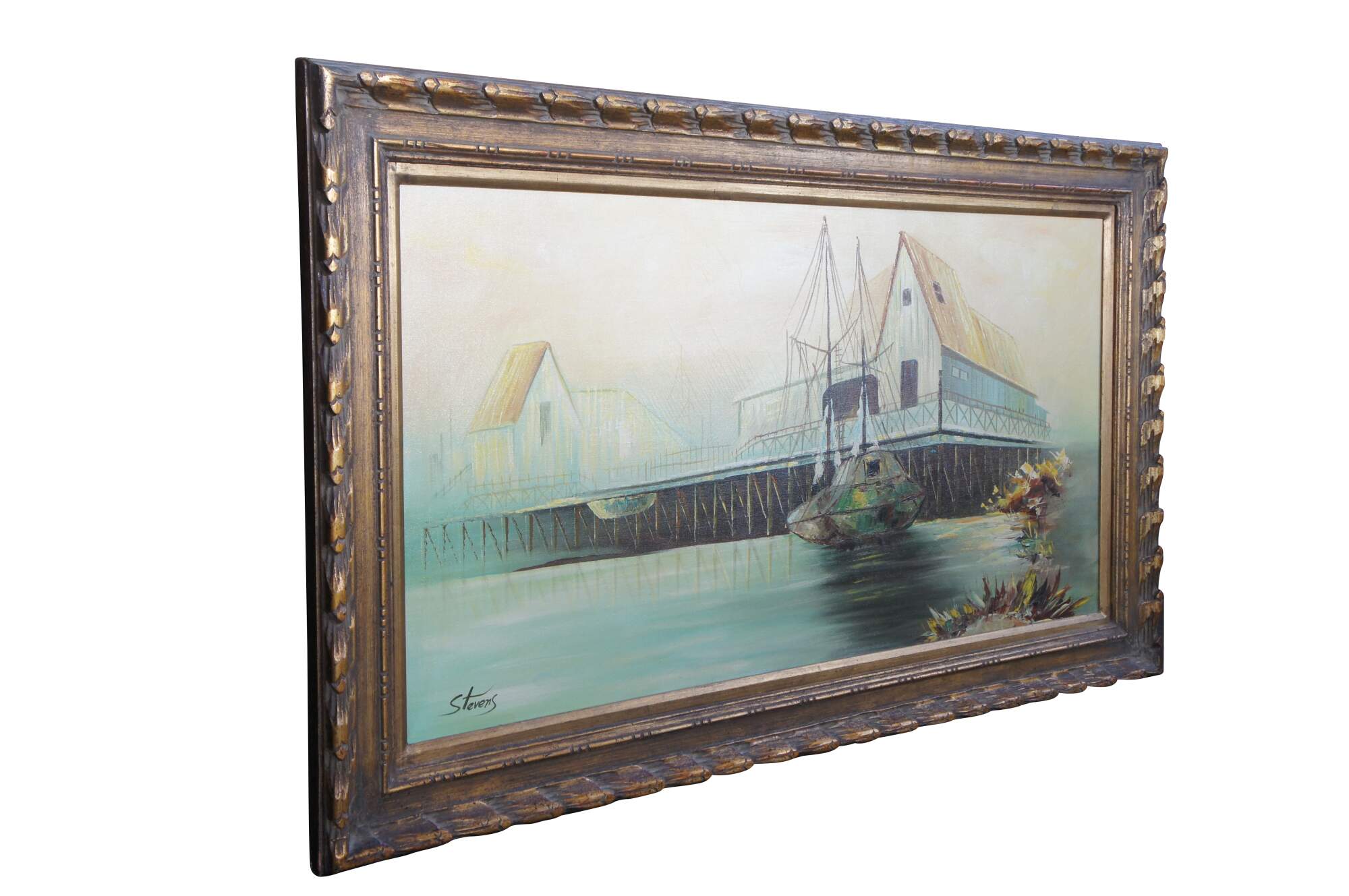 1970s oil painting on canvas, signed Stevens. Features a harbow dock view with buildings and a sailboat. Signed Stevens on the lower left. The painting is framed in wood by Andrew Kolb & Son Ltd.