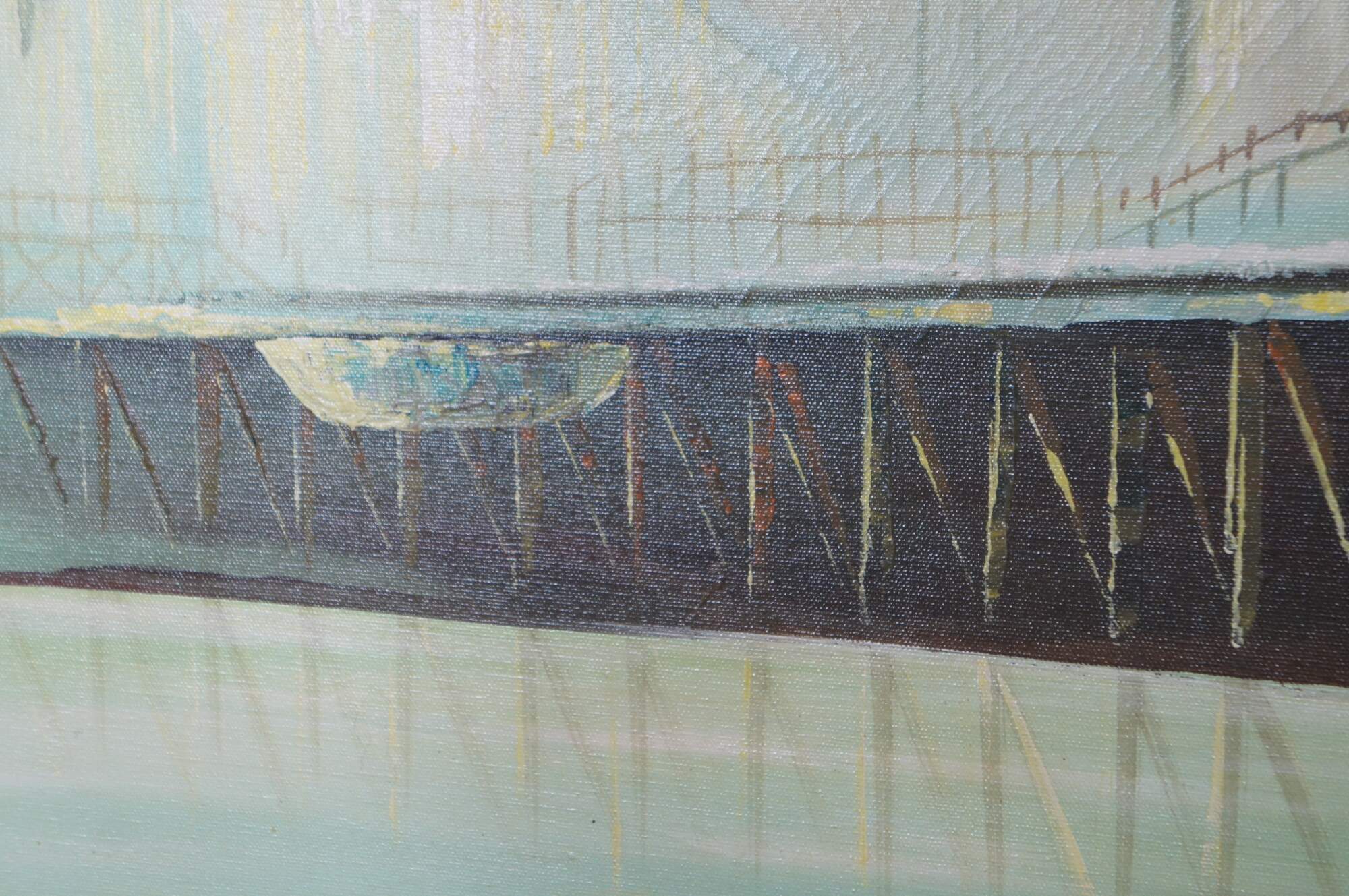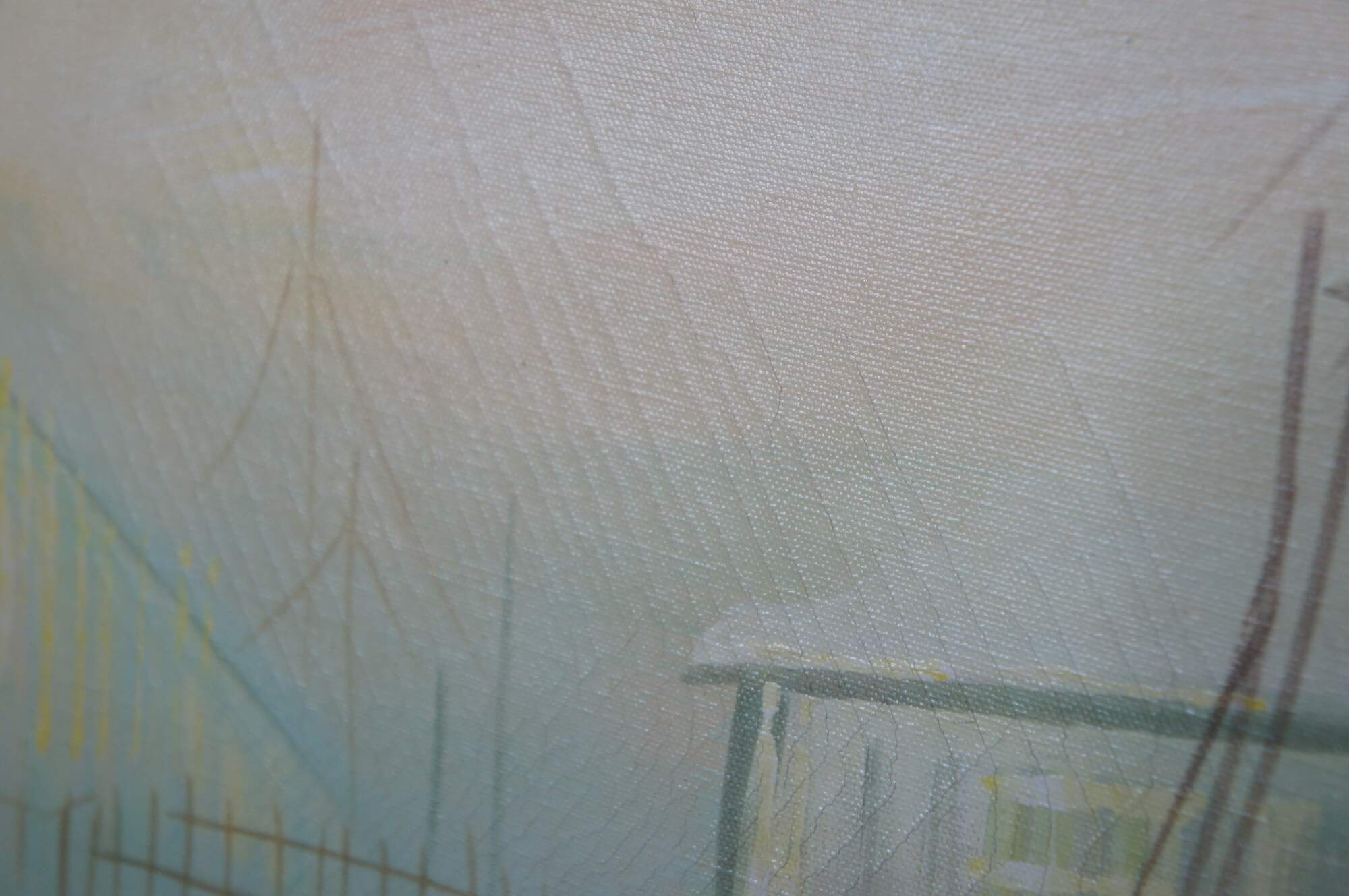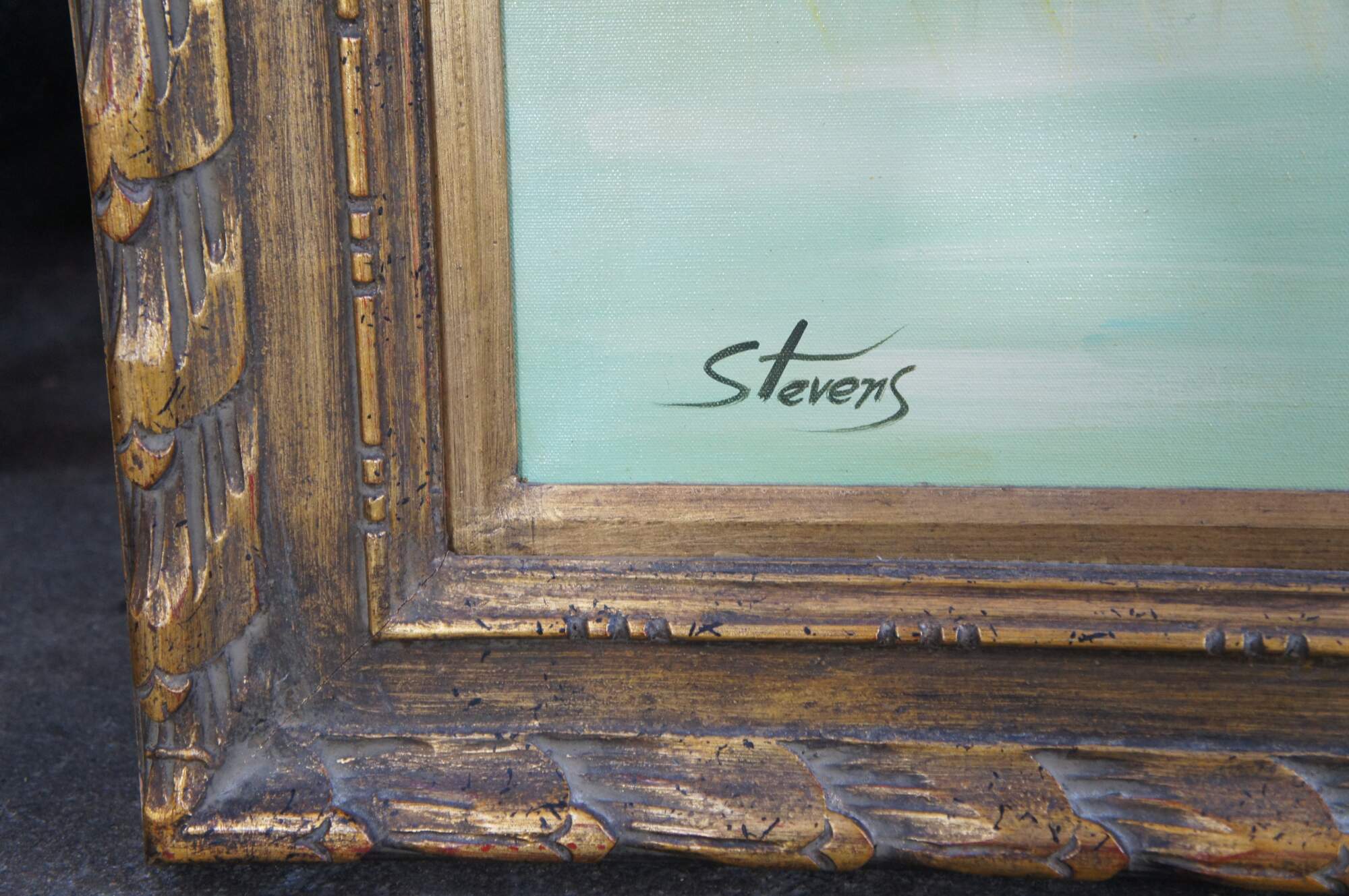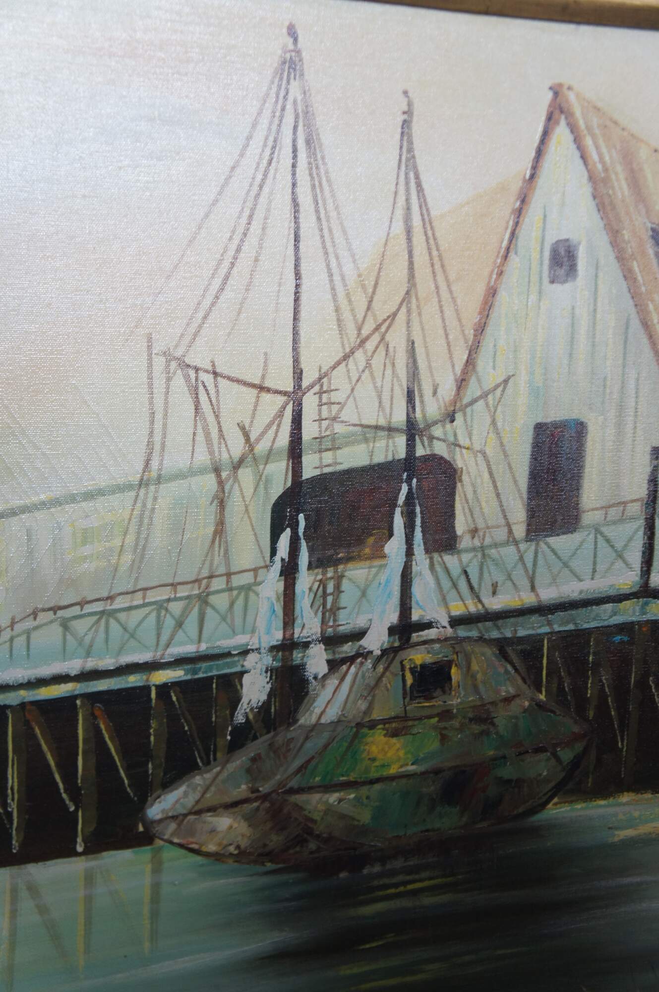 1970s oil painting on canvas, signed Stevens. Features a harbow dock view with buildings and a sailboat. Signed Stevens on the lower left. The painting is framed in wood by Andrew Kolb & Son Ltd.
