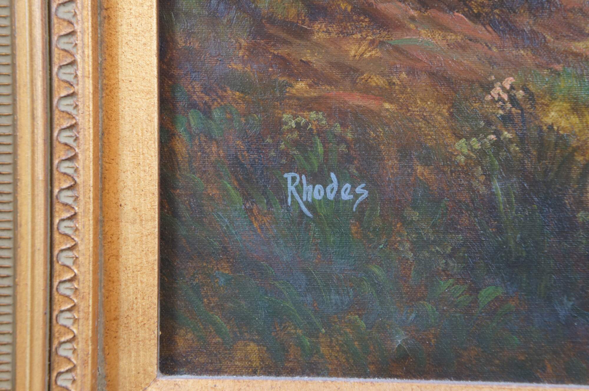 A beautiful vintage european landscape oil painting, circa 1970s. Features a castle perched on the hillside with a waterfall below. A trail to the castle can be seen towards the left with tire tracks leading up to it. The painting is framed in wood with a gold finish. Signed rhodes lower left.