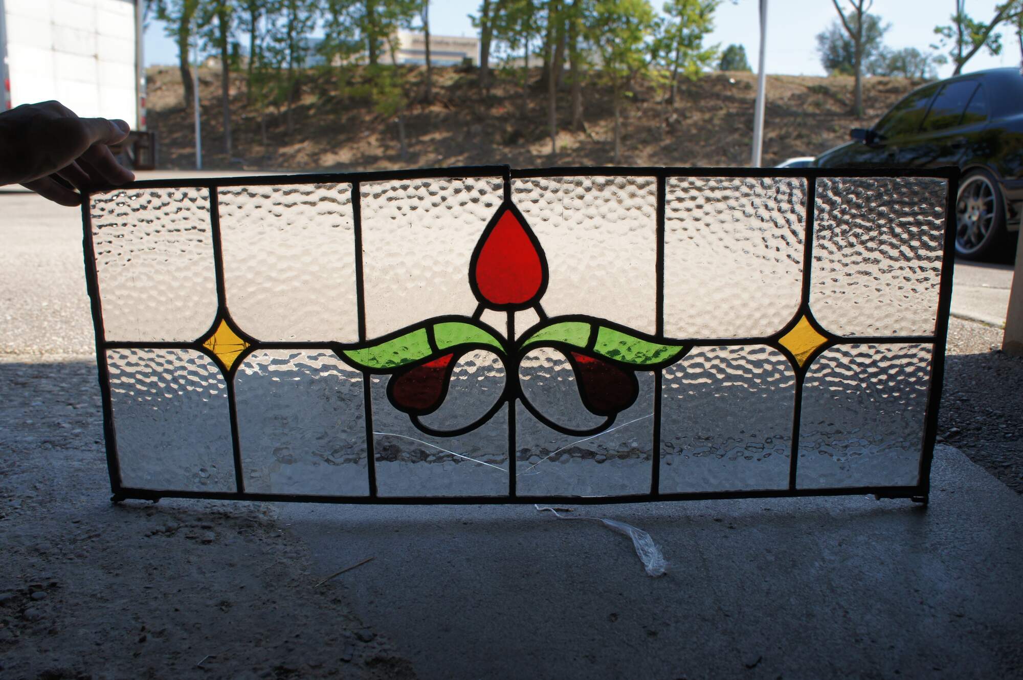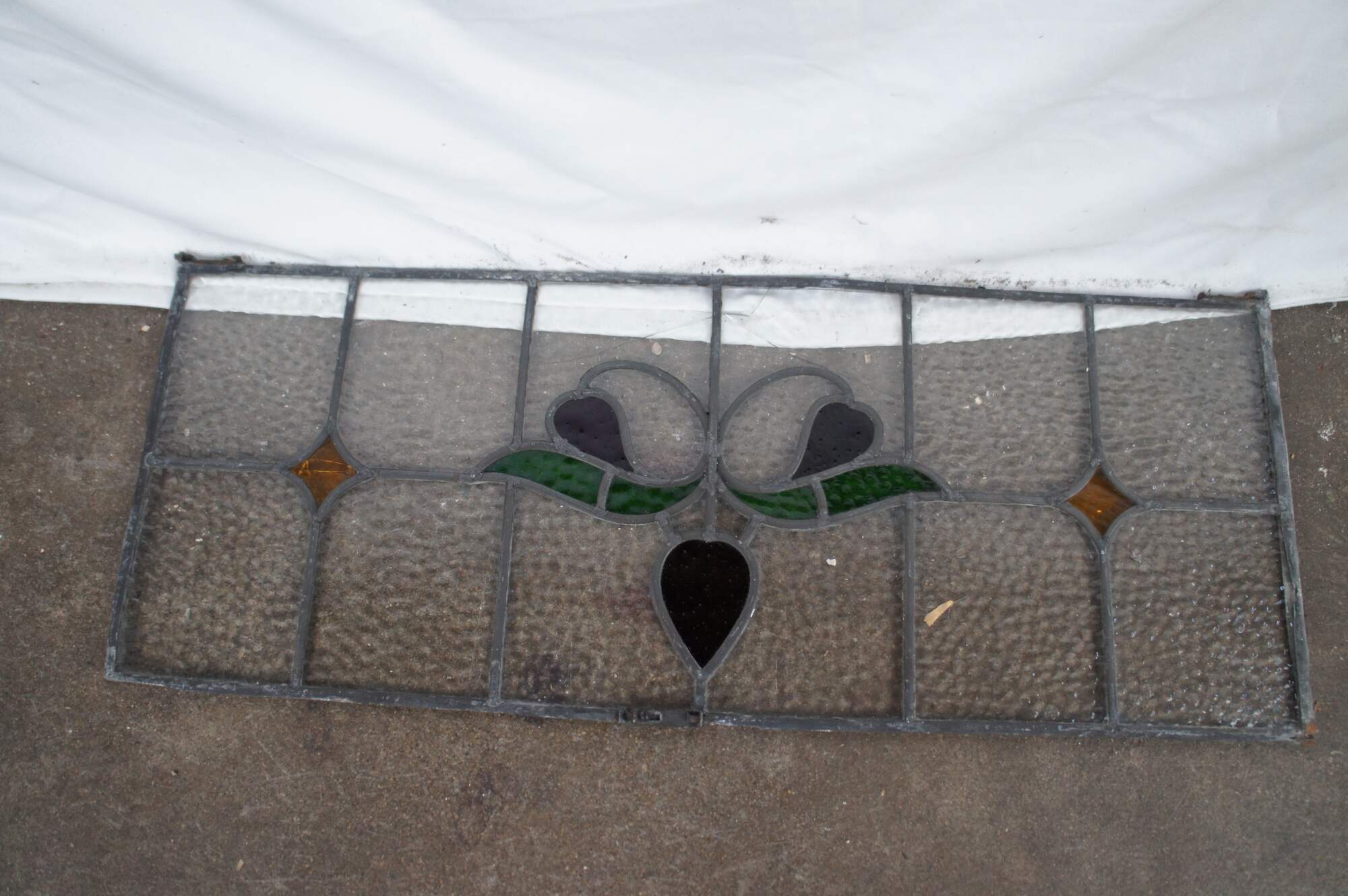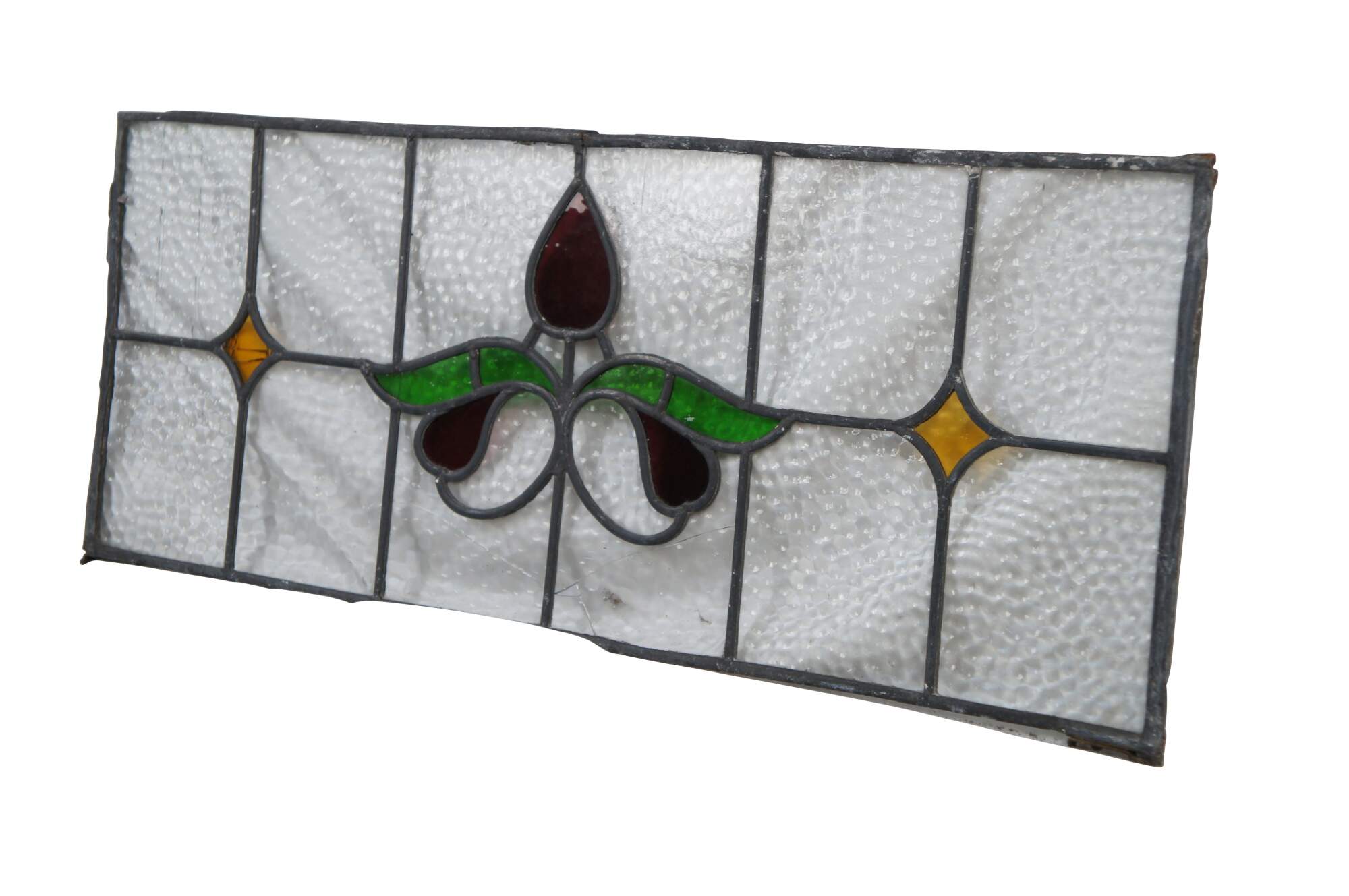 Beautiful antique leaded stained glass Art Nouveau transom window. Features a floral design at the center in a ruby tone with green leaves flanked by amber colored diamonds and a pebbled glass foreground. Perfect for use over a doorway.