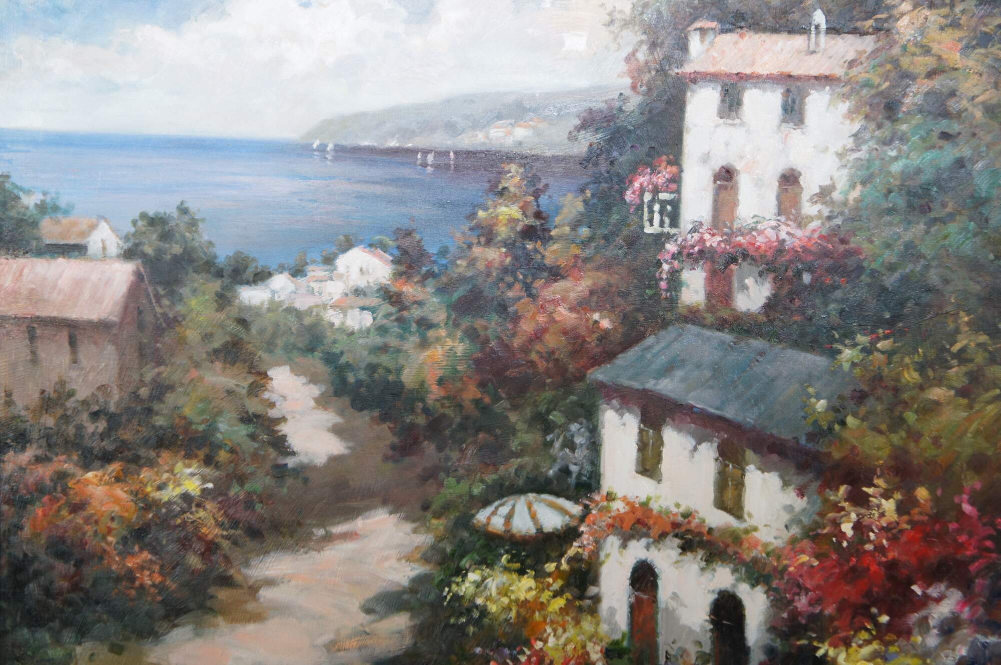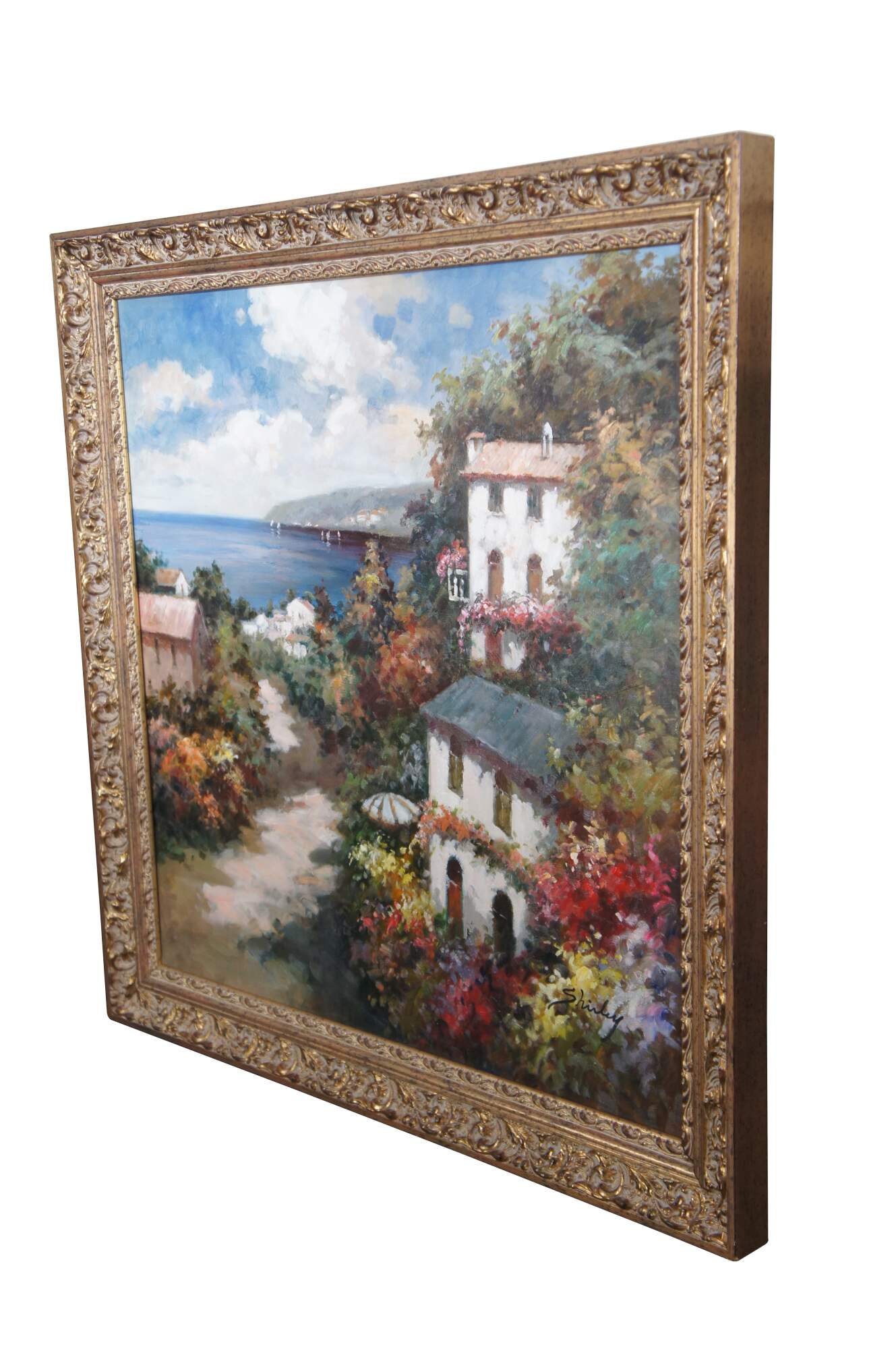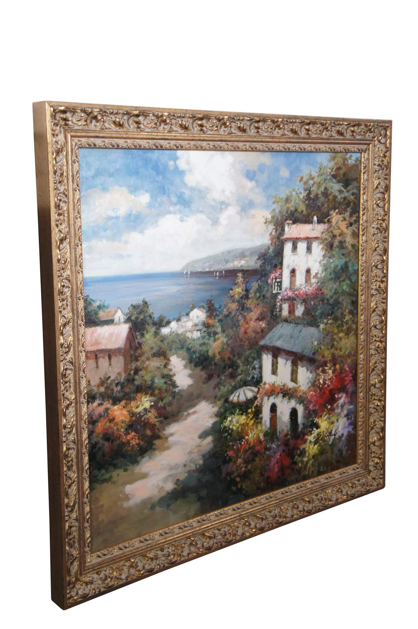 A large impressionist seascape or harbor view in Tuscany. Signed Shirley, cira late 20th century. The oil painting is on canvas and features a view down the hillside on a crisp afternoon with floral sprays amidst houses with a view towards the water. The painting is framed in with with gold finish and foliate relief.