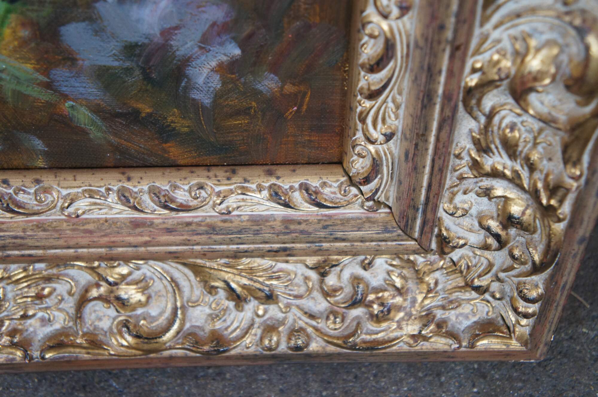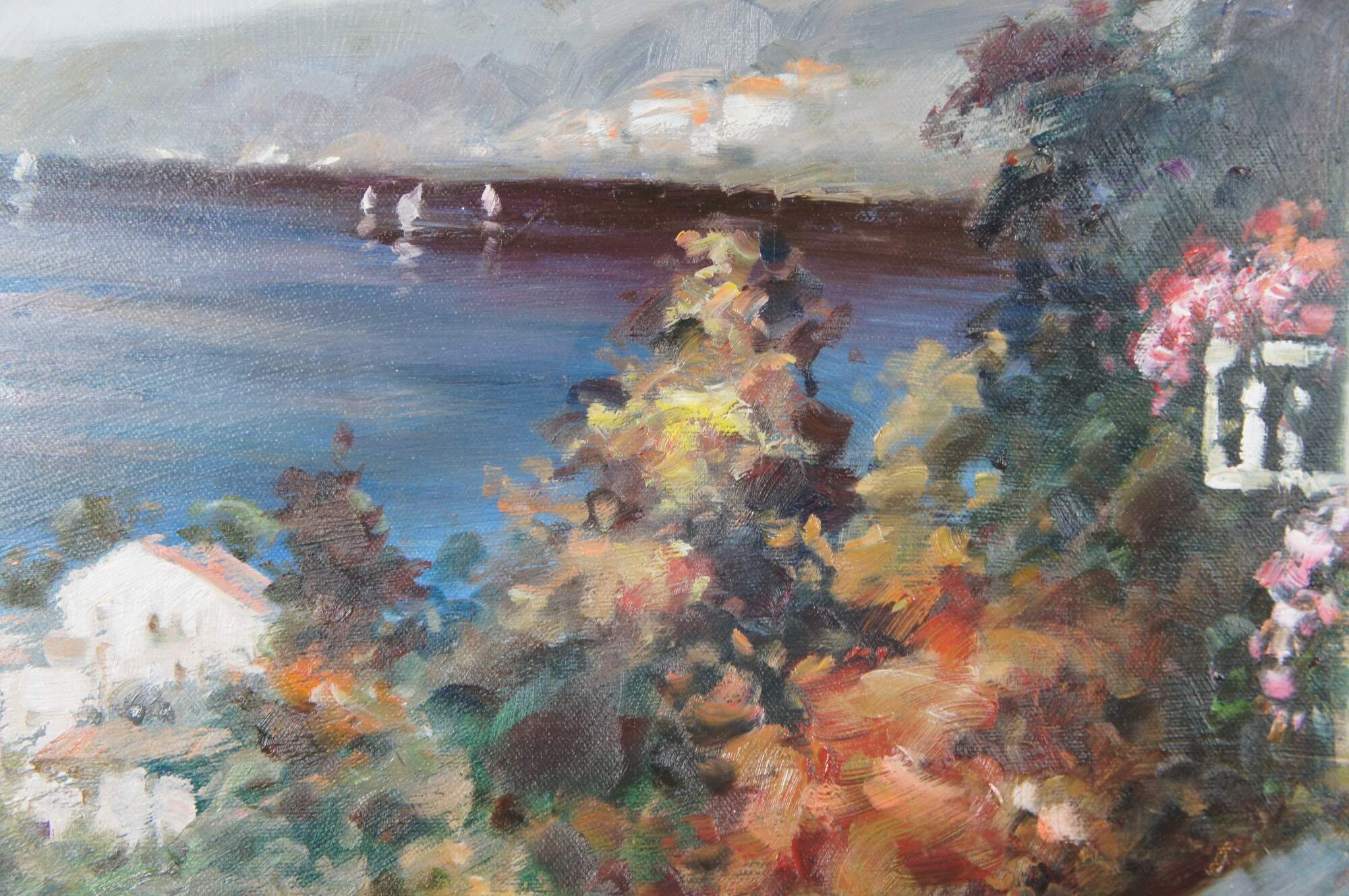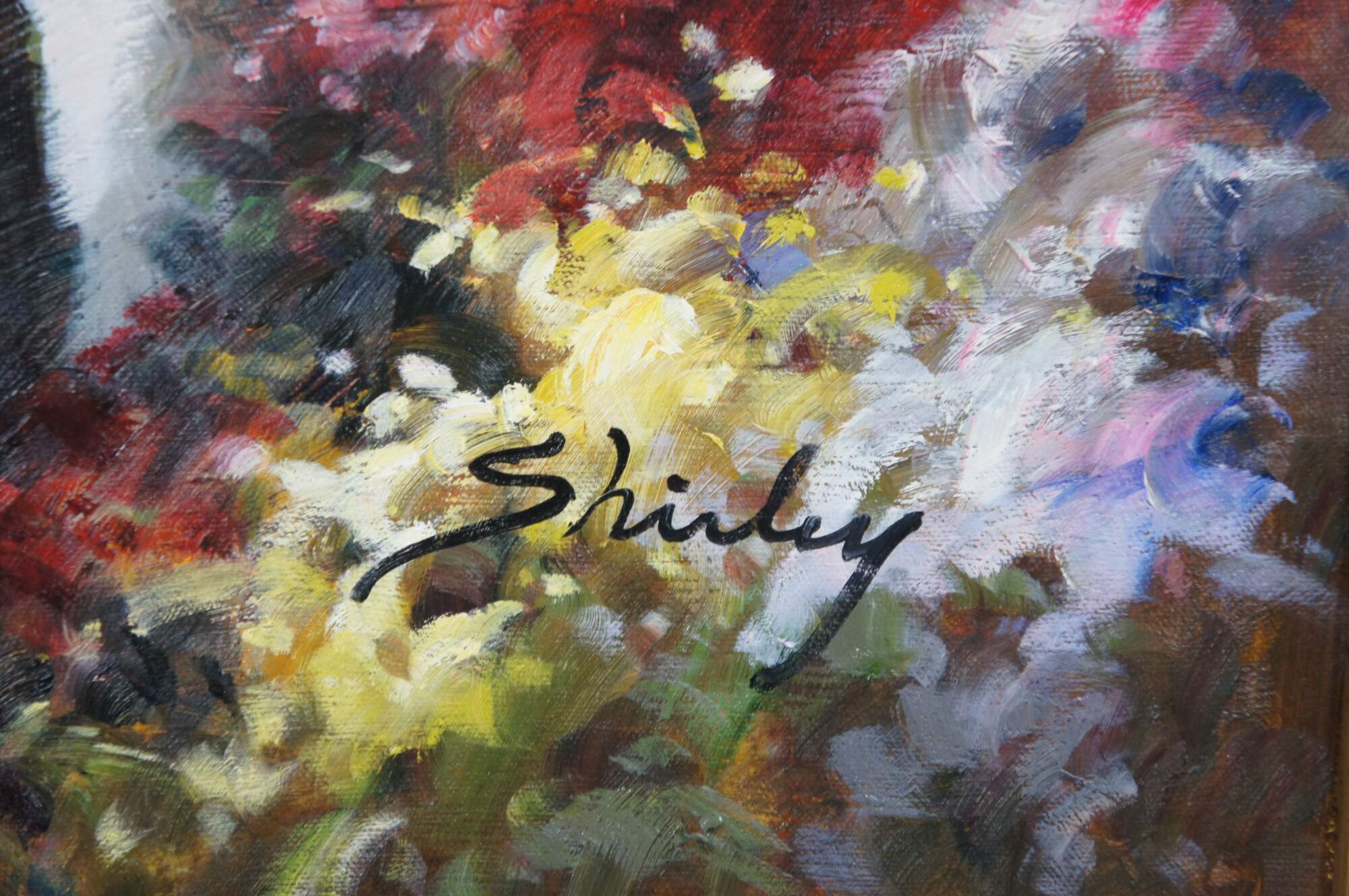 A large impressionist seascape or harbor view in Tuscany. Signed Shirley, cira late 20th century. The oil painting is on canvas and features a view down the hillside on a crisp afternoon with floral sprays amidst houses with a view towards the water. The painting is framed in with with gold finish and foliate relief.