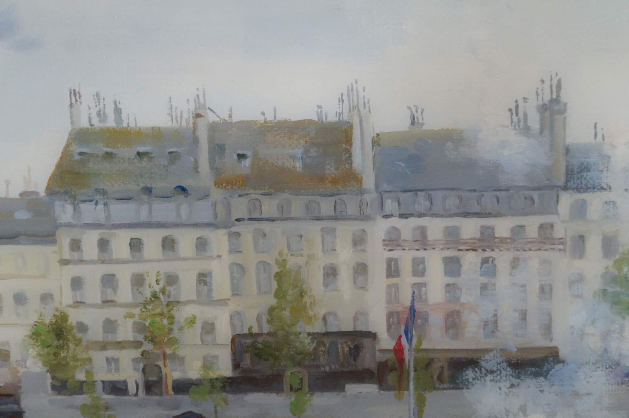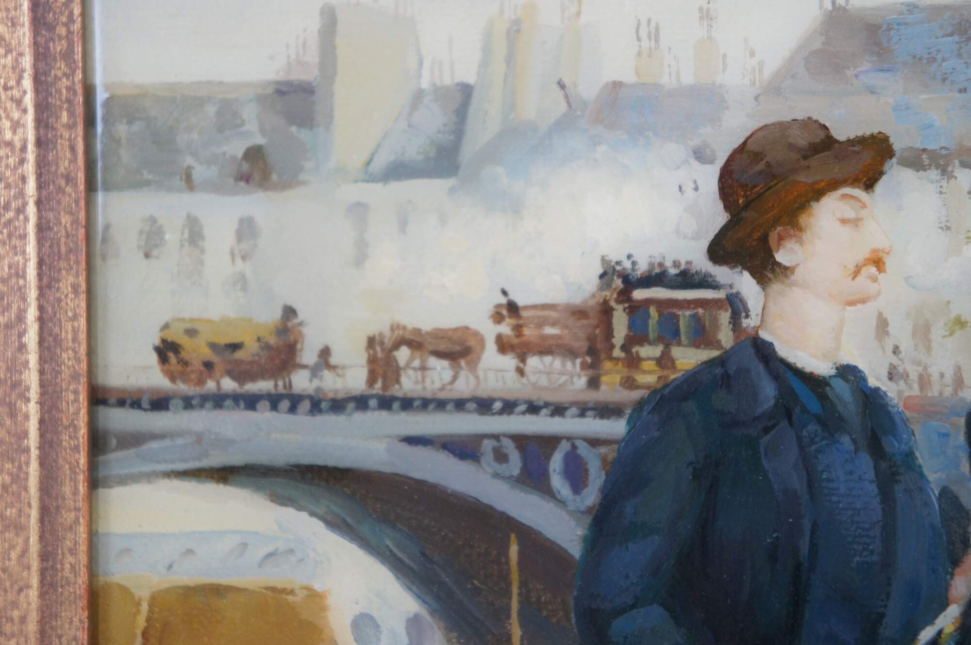Children with a toy seller on the Quai du Louvre, after Jean Béraud. Oil painting sealed with resin giving a high gloss finish. This beautiful painting after Jean Beraud showcases the hustle and bustle of the famous thoroughfare (Quai du Louvre) with a neat mix of interesting figures amongst the unique architectural backdrop across the river. Circa last quarter 20th century. Framed in Baroque manner