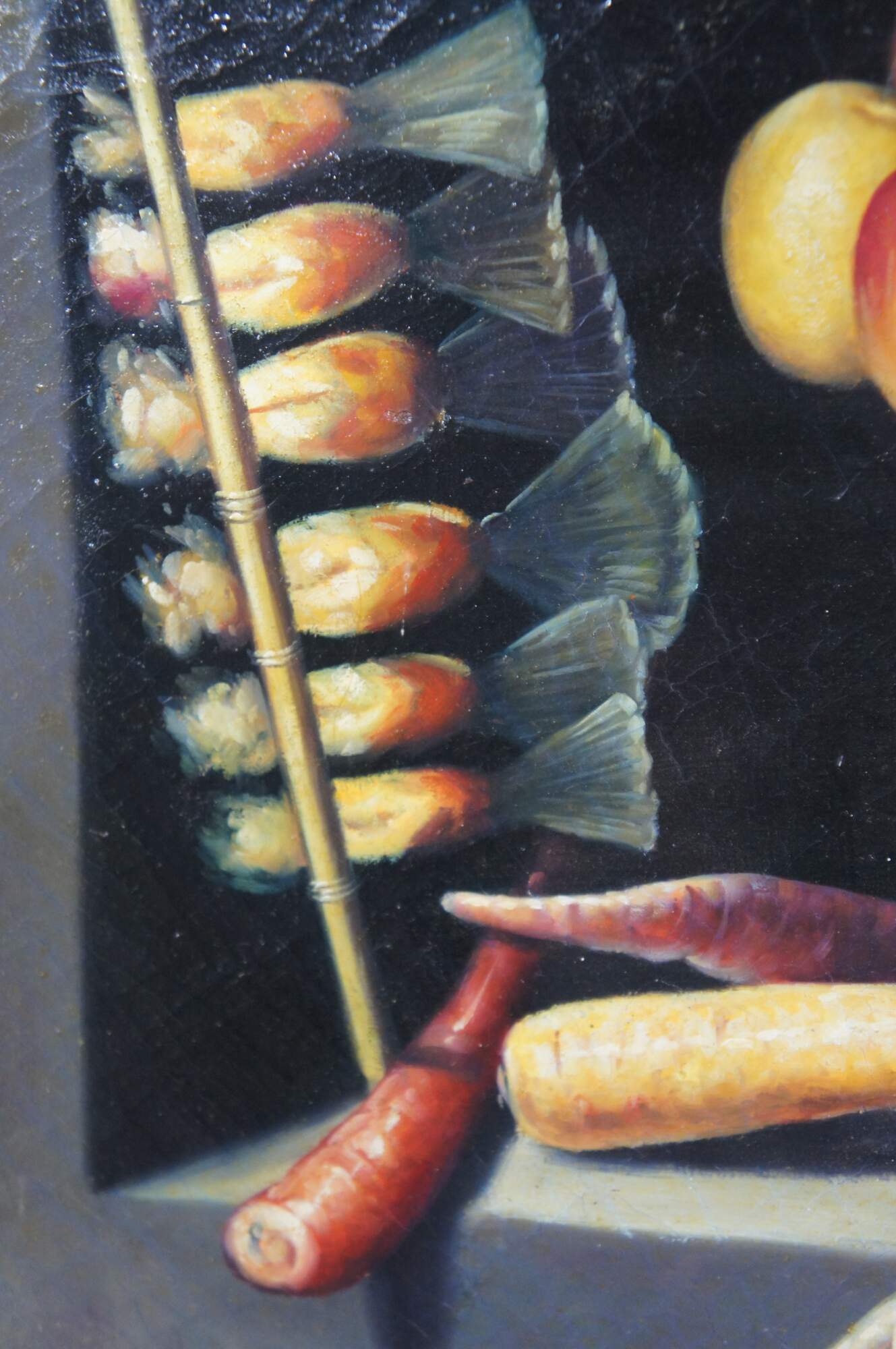 Late 20th century still life featuring watefowl, fruit and vegetables. An oil on craquelure canvas. Ornately framed in Baroque manner