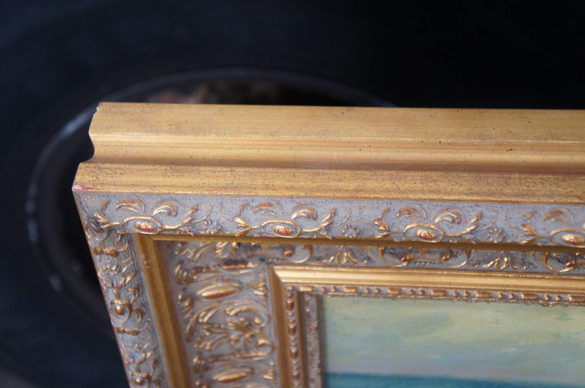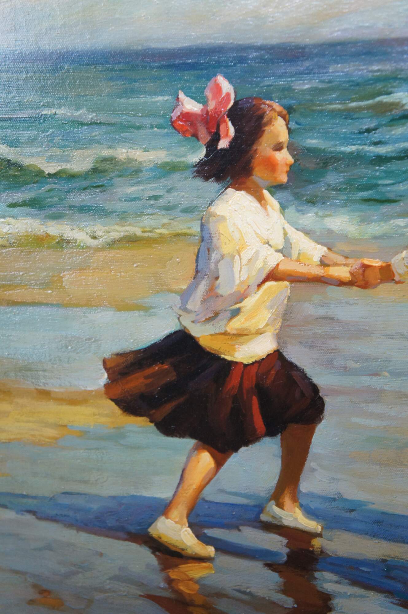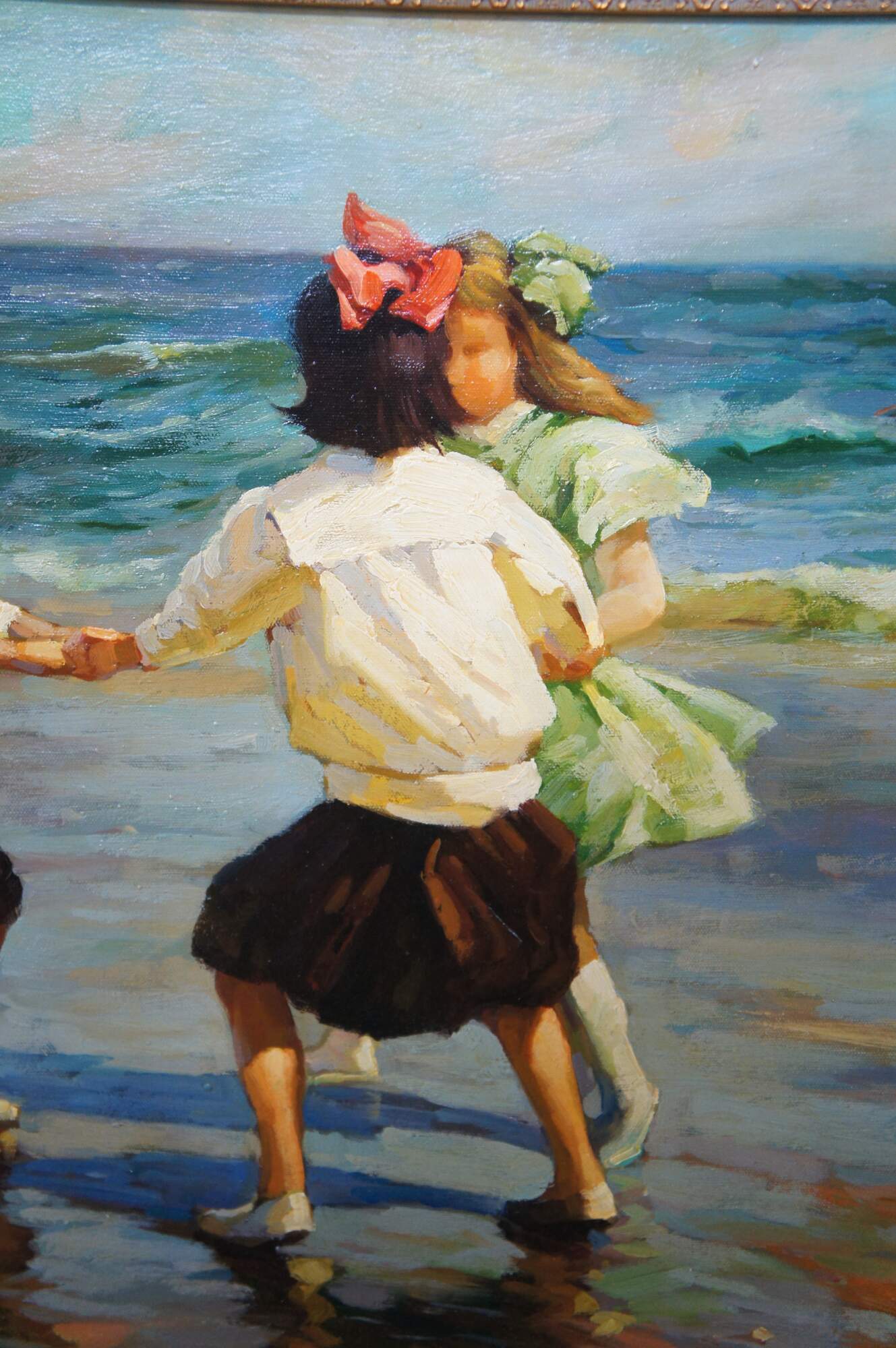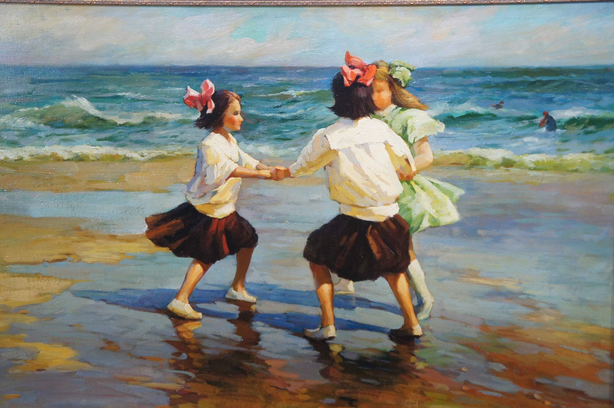 A large Impresionist original oil painting Titled Ring Around The Rosie, After Edward Potthast, circa late 20th century. The oil painting is on canvas and features three girls playing ring around the rosie on the beach in front of crashing ocean waves. The painting is framed in wood with gold finish.