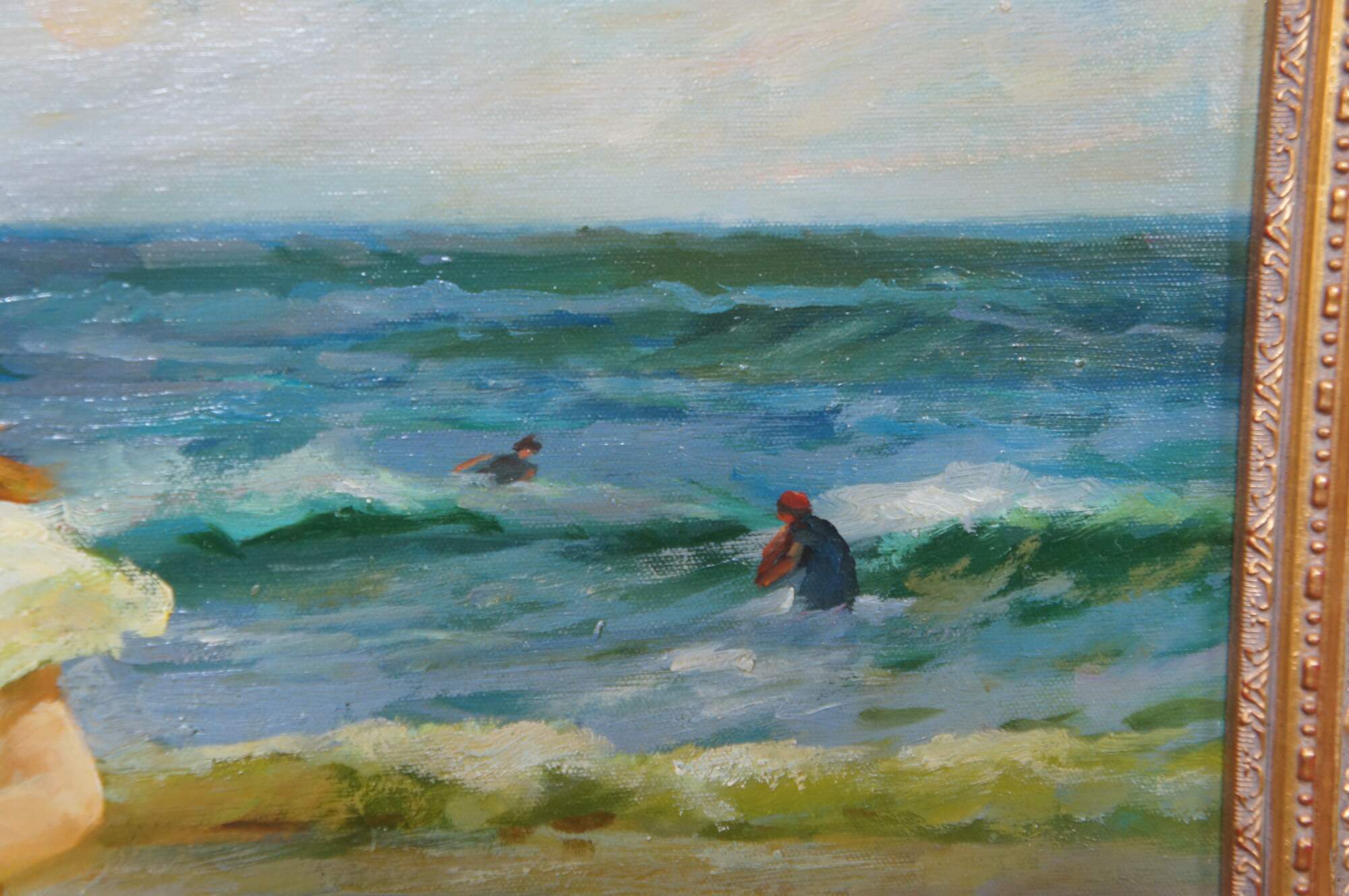 After his move to New York, Potthast made scenes of people enjoying leisurely holidays at the beach and rocky harbor views his specialty. He spent summer months in any one of a number of seaside art colonies, including Gloucester, Rockport and Cape Cod in Massachusetts, and Ogunquit and Monhegan Island, Maine. Such was his love of the beach that, when he resided in New York, he would journey out on fair days to Coney Island or Far Rockaway with his easel, paintbox, and a few panels.