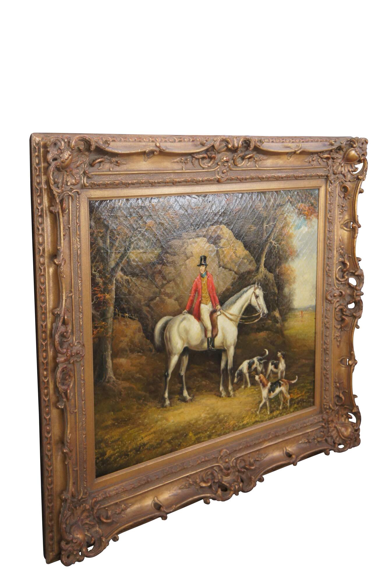 A distinguished 20th century Portrait of Rowland, Viscount Hill on his grey hunter, with the Shropshire hunt in the distance. After Rhicard Jones British (1767-1840). An oil on painting on canvas with natural craquelure, framed in baroque manner with gold finish.
