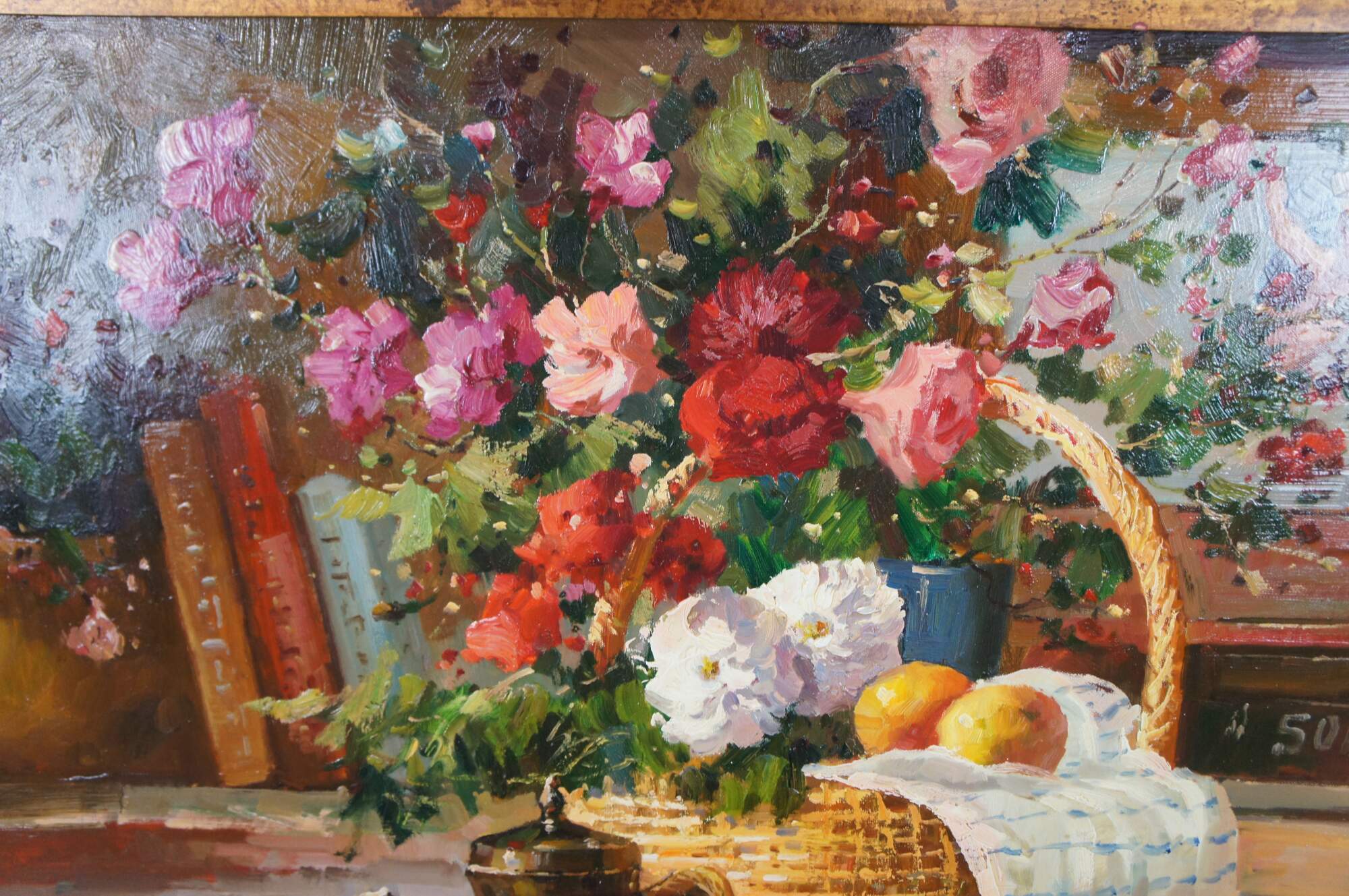 A beautiful still life painting featuring a table setting with a basket of flowers, apples, oranges, cherries, a tea pot and a Violin over a tablecloth. The setting is infront of a bookshelf with piece of art showing a Cherub. The painting is signed lower right Antauny. Framed in wood with a mottled gold finish.