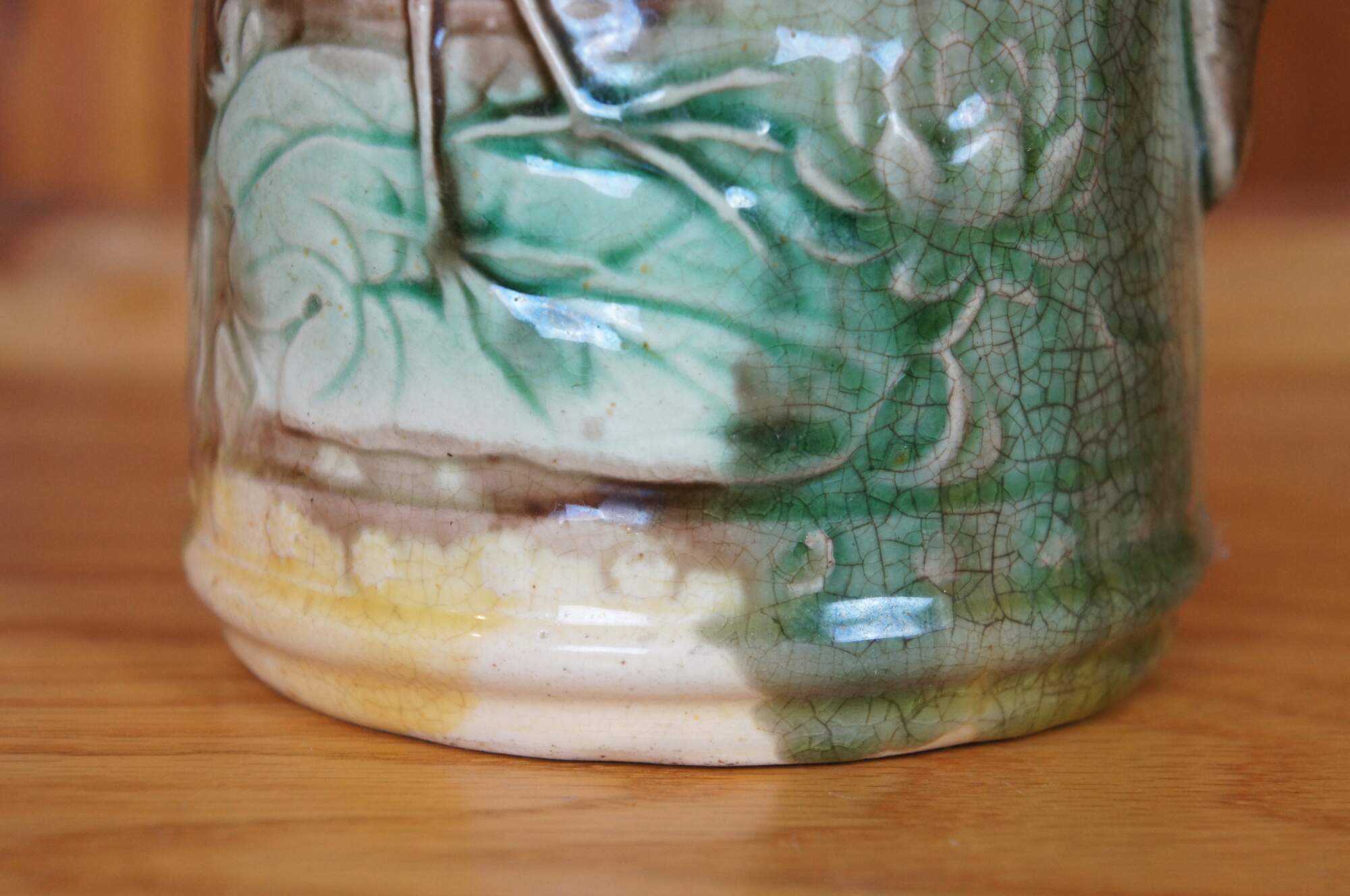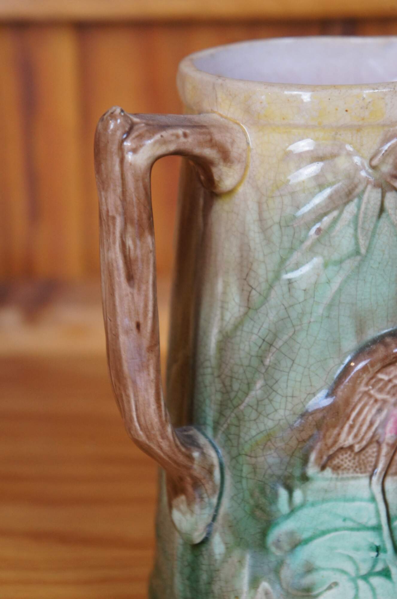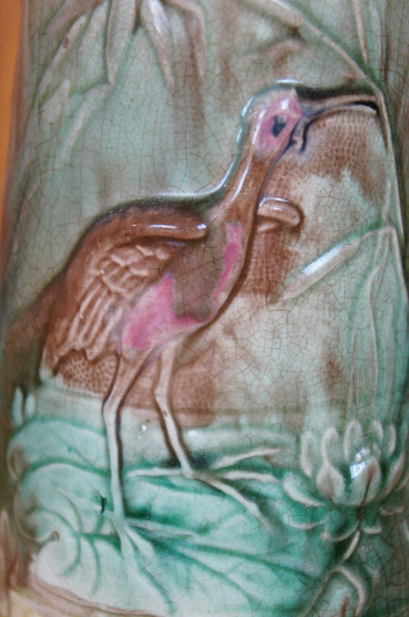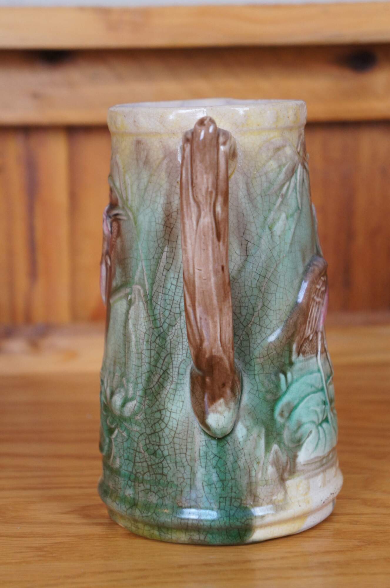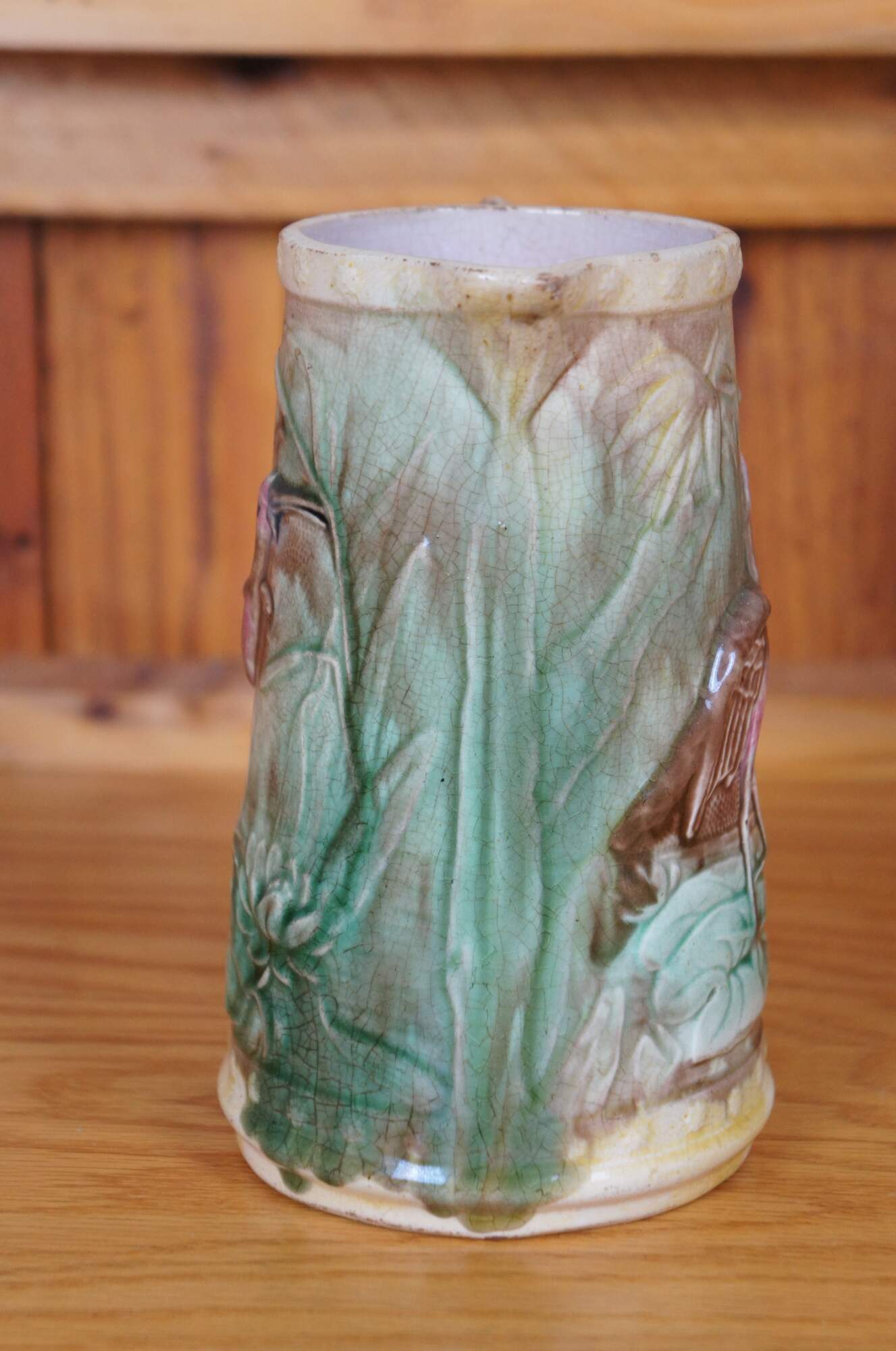 Antique Majolica Heron / Crane / Stork creamer pitcher/jug featuring the bird eating a fish on a water lily pad.