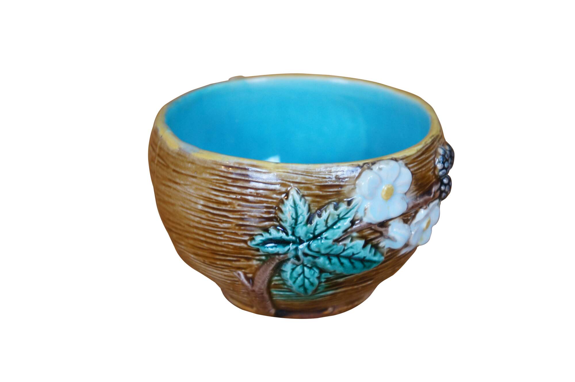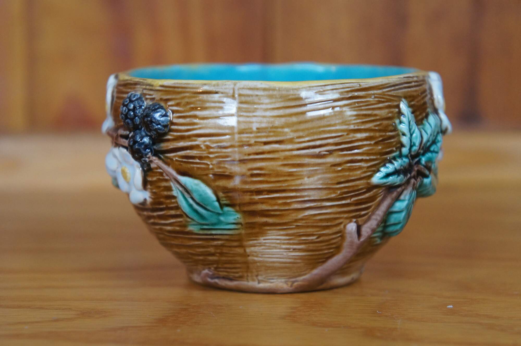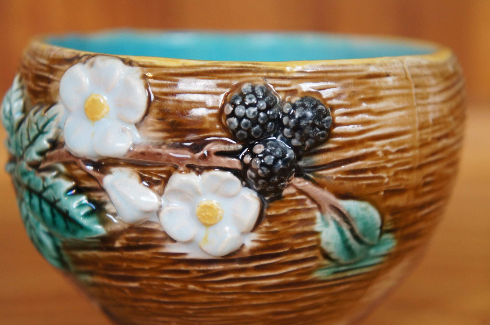 Antique Wedgwood Majolica fruit / sugar bowl / compote featuring a high relief blackberry and flower motif against a bark ground, turquoise interior. Circa November, 1877.