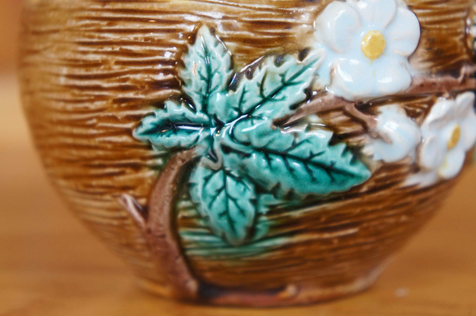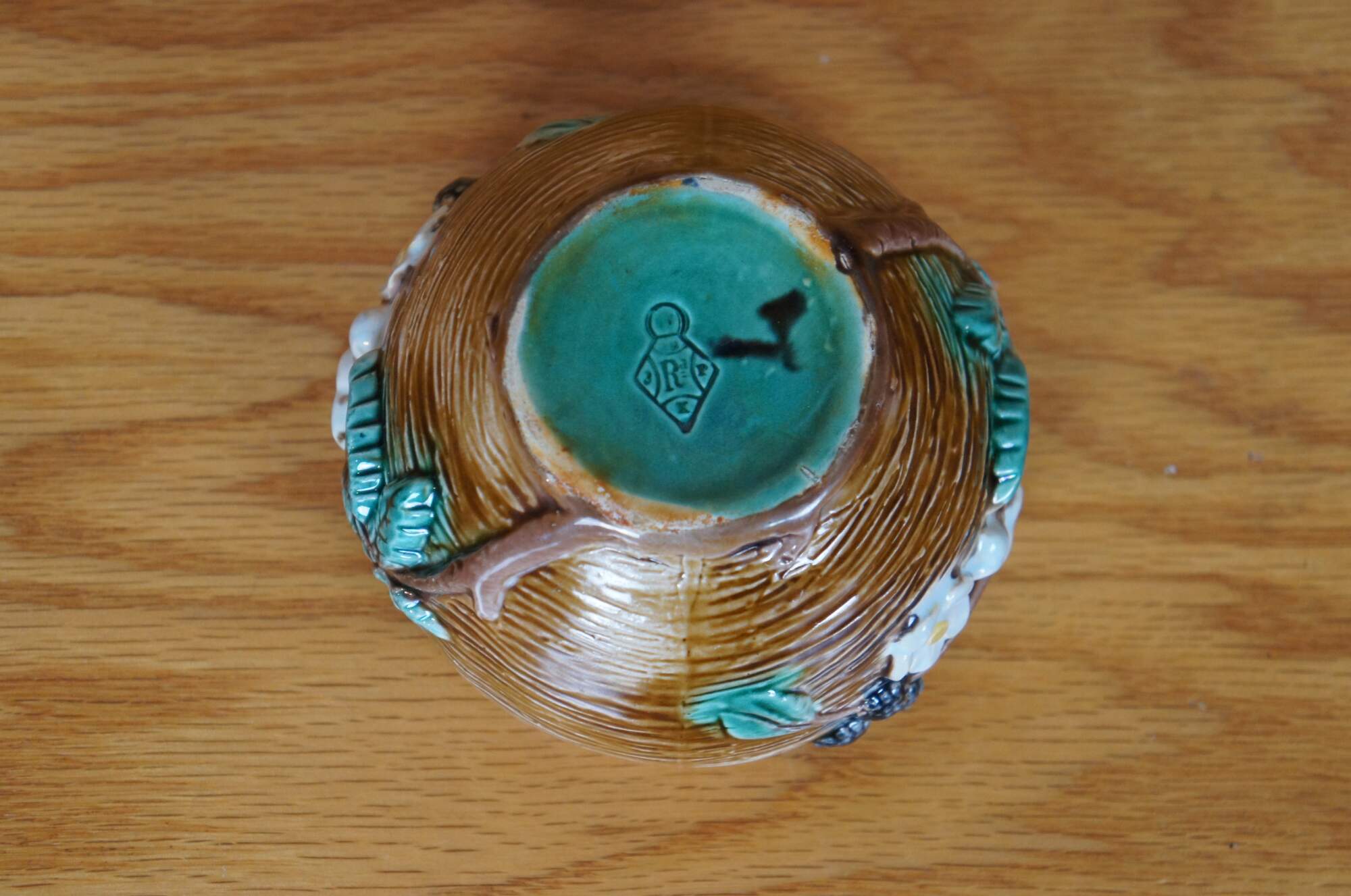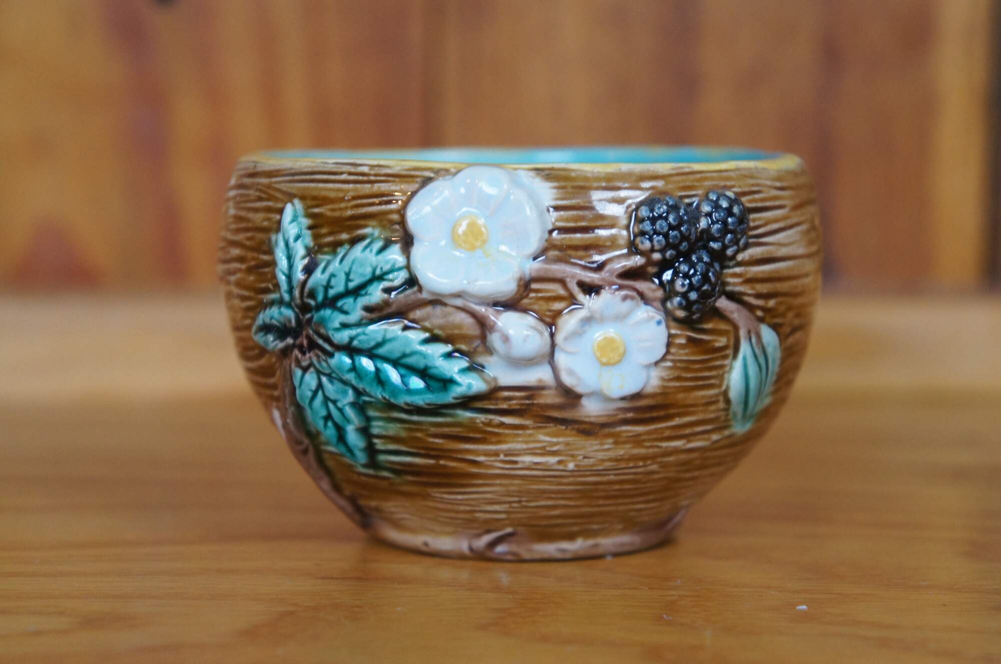 Antique Wedgwood Majolica fruit / sugar bowl / compote featuring a high relief blackberry and flower motif against a bark ground, turquoise interior. Circa November, 1877.