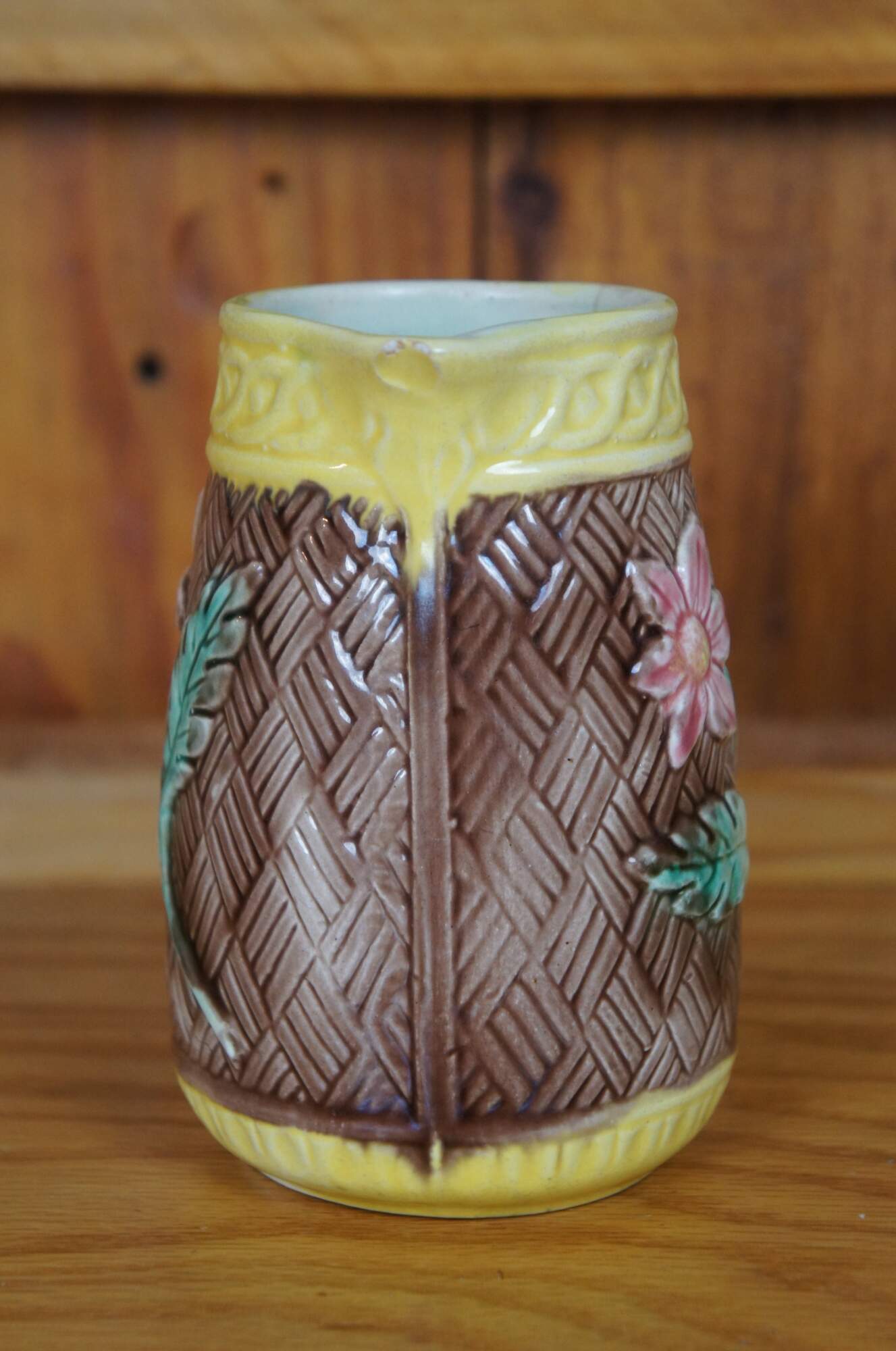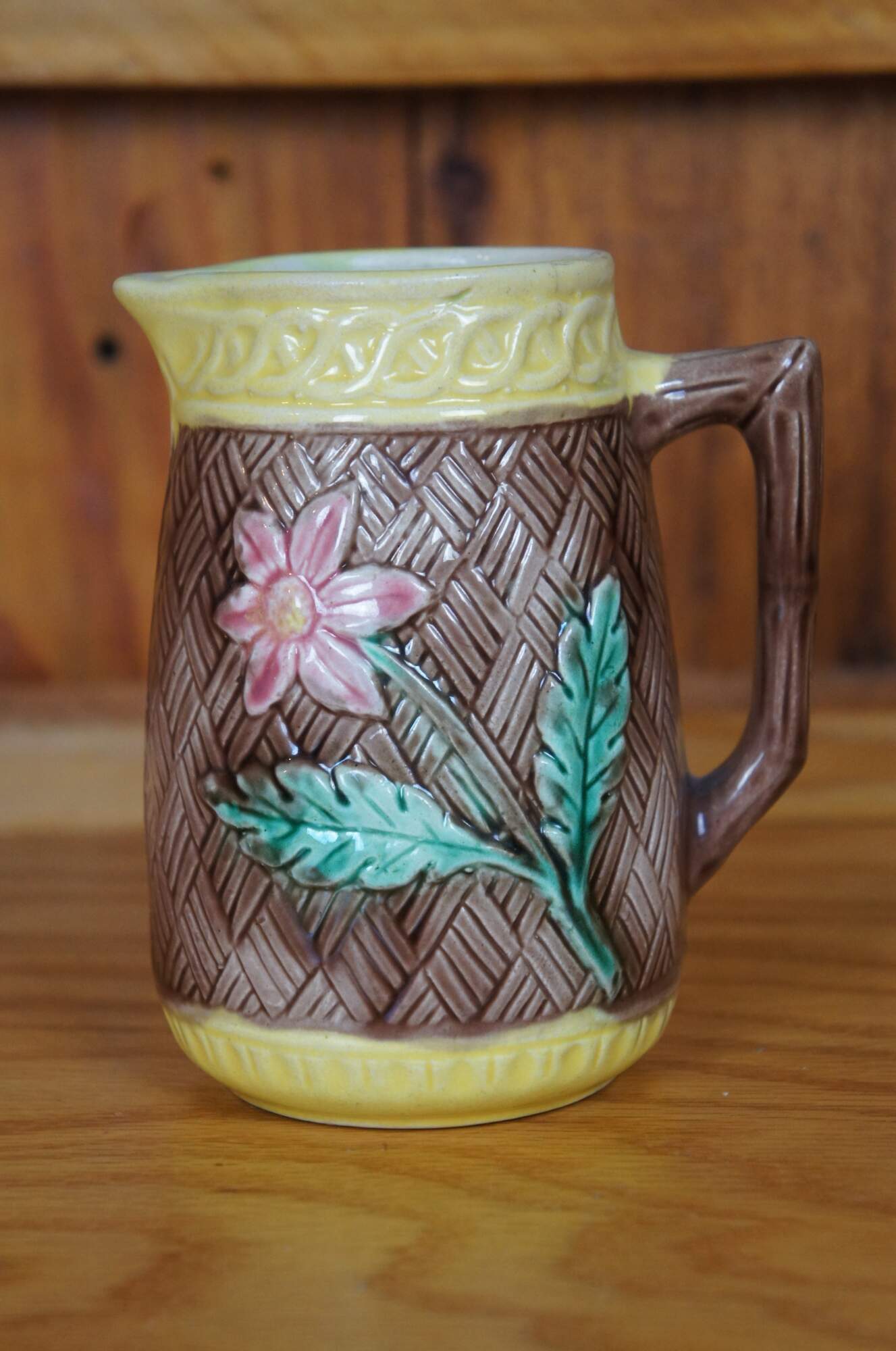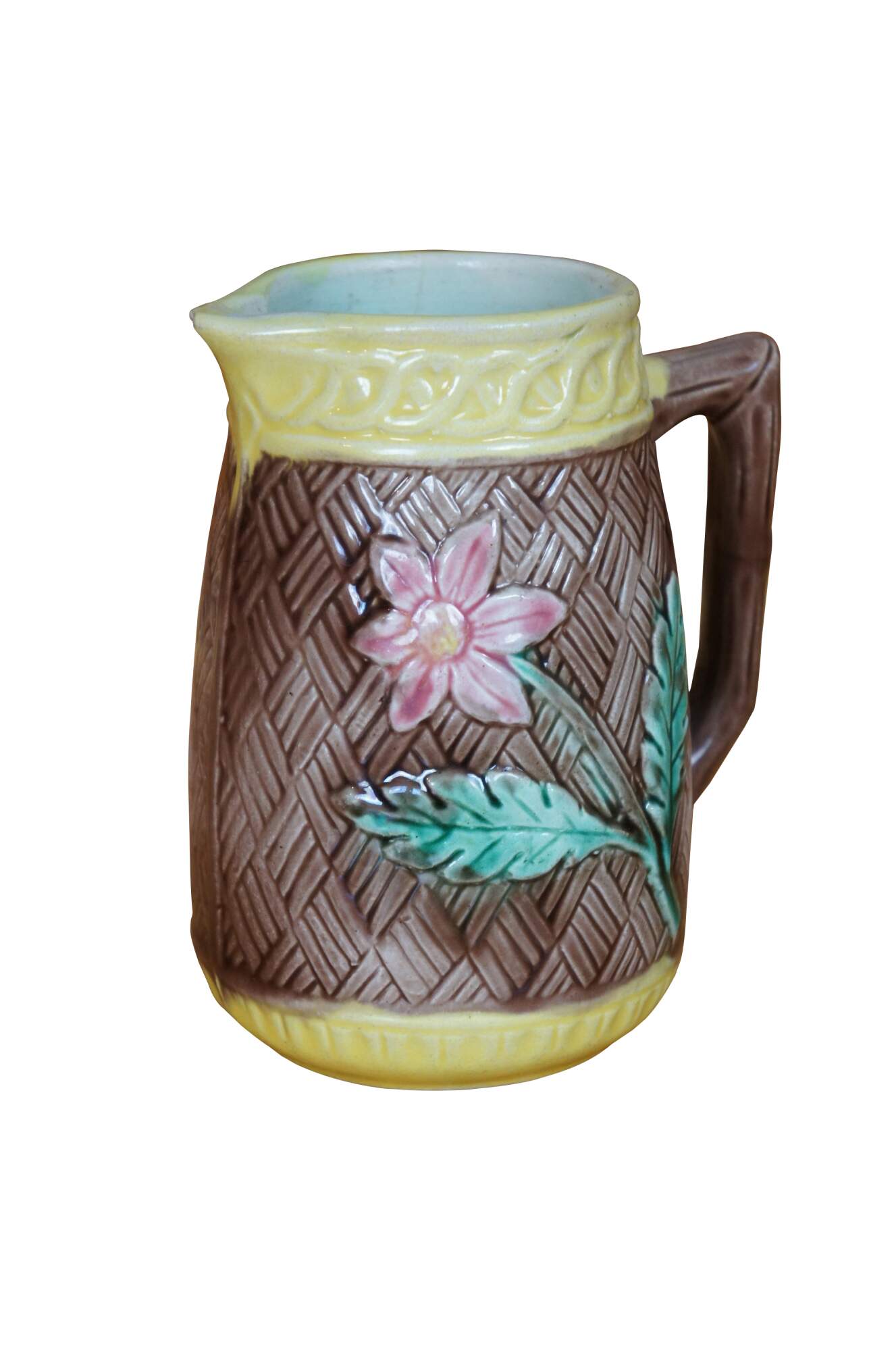 Antique Majolica creamer pitcher featuring a brown basketweave and flower design.