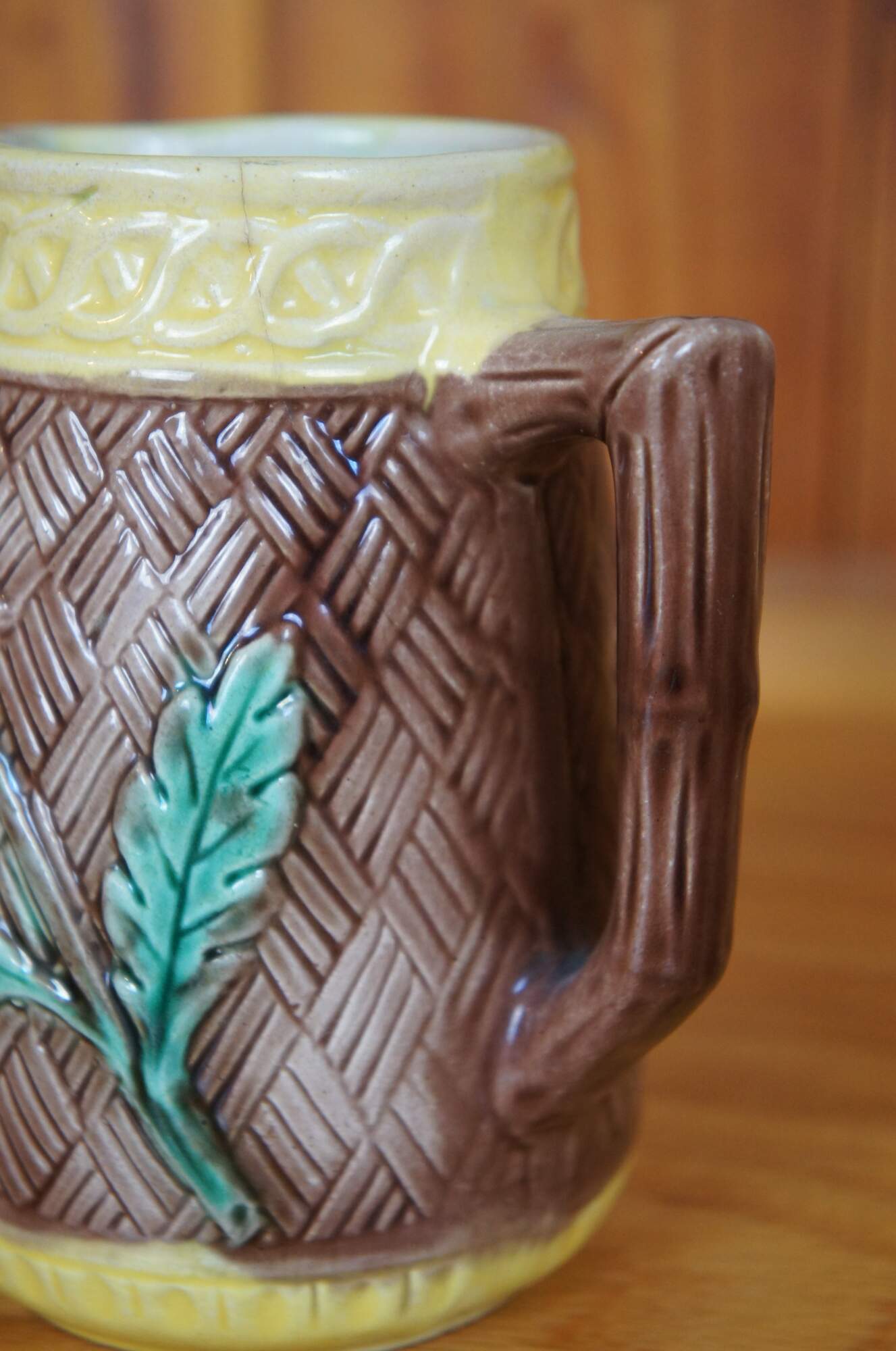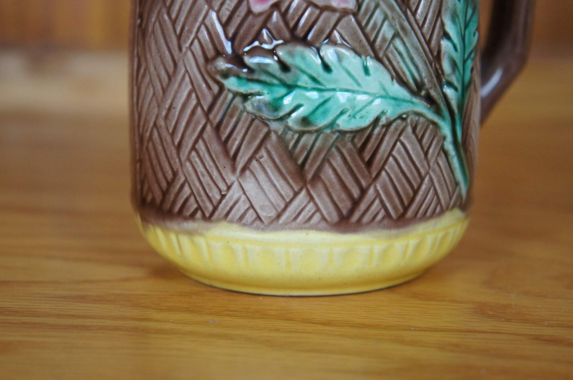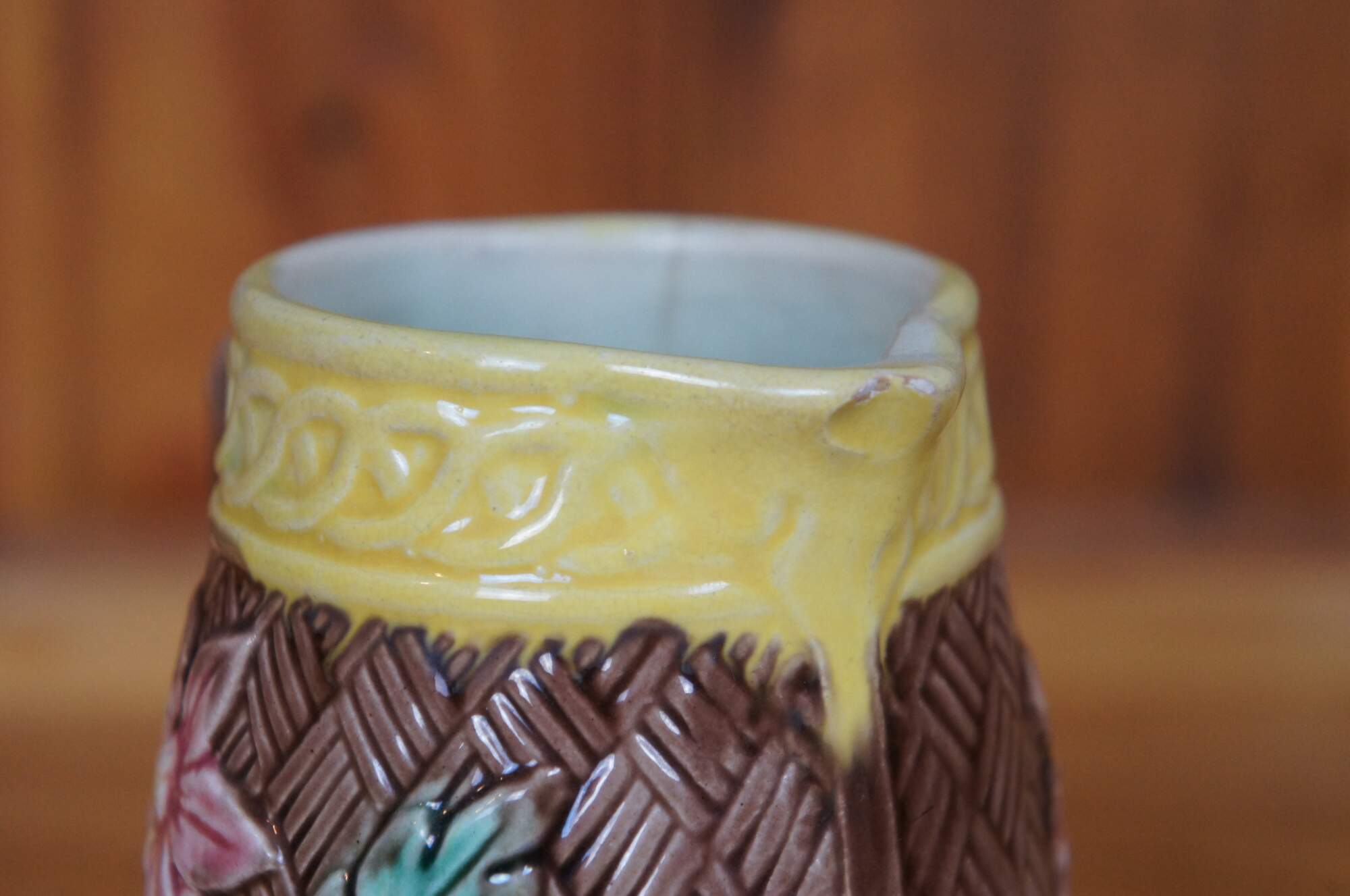 Antique Majolica creamer pitcher featuring a brown basketweave and flower design.