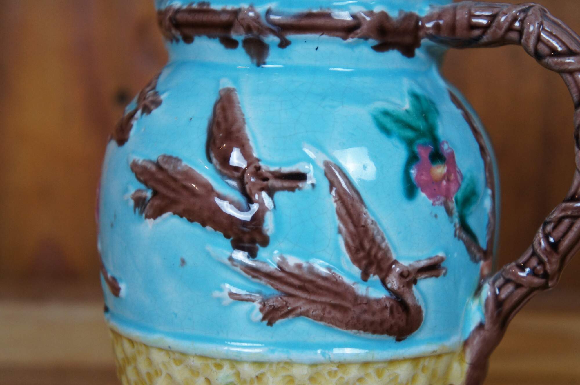 Antique Majolica creamer pitcher or jug featuring a basketweave motif with Cranes and Dogwood flowers against a turquoise sky. Attributed to Thomas Forester.