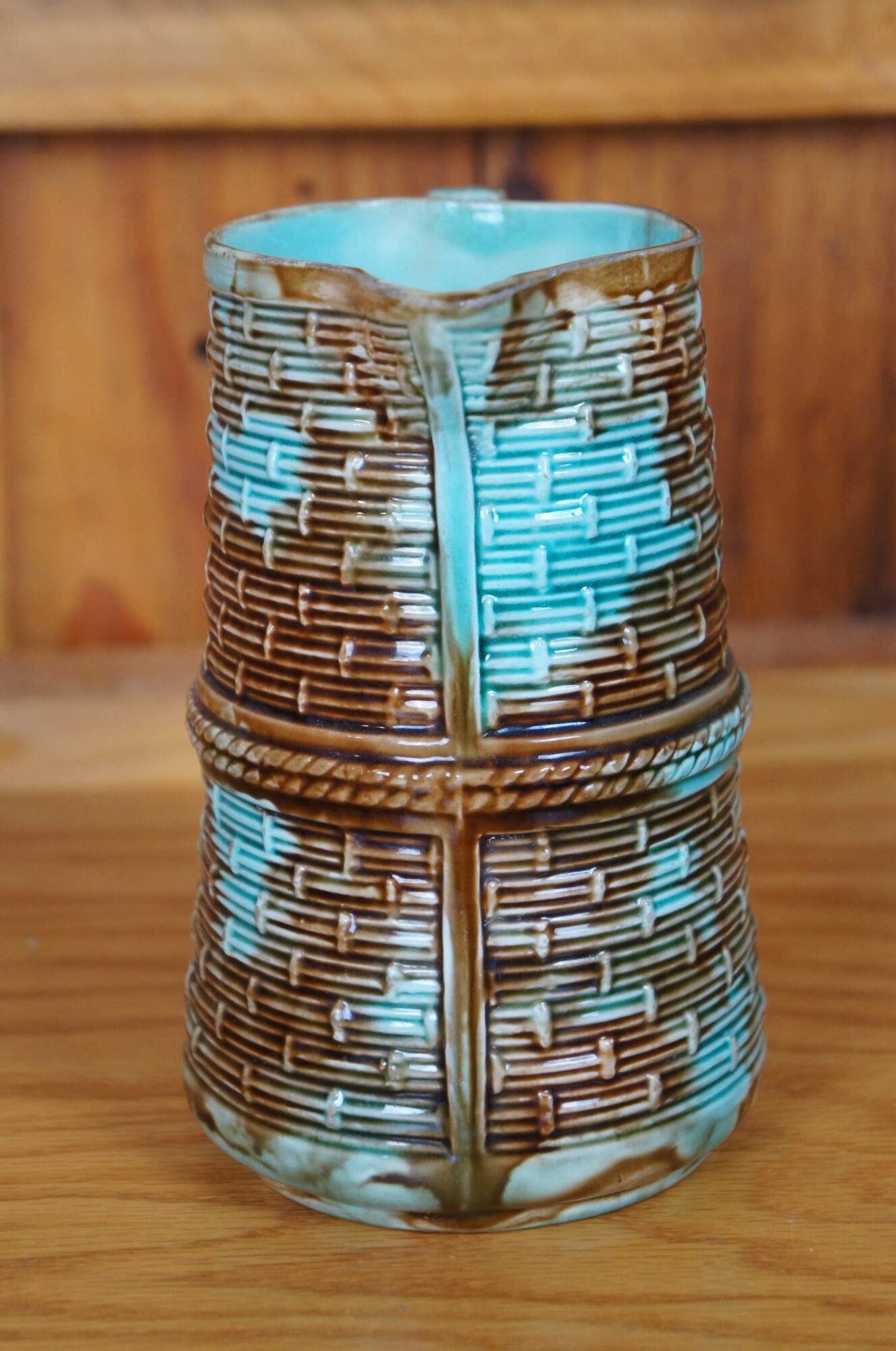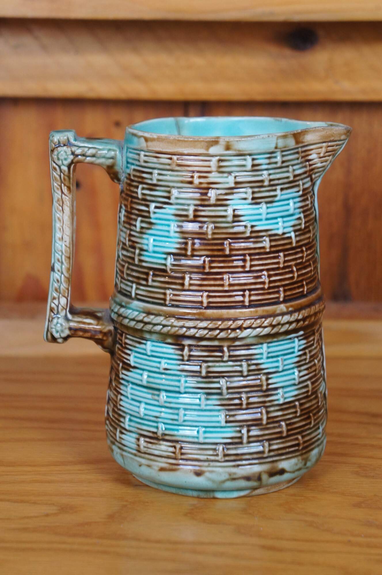 Antique Majolica basketweave creamer pitcher or jug featuring a woven basket design in Southwestern turquoise blue and mottled brown.