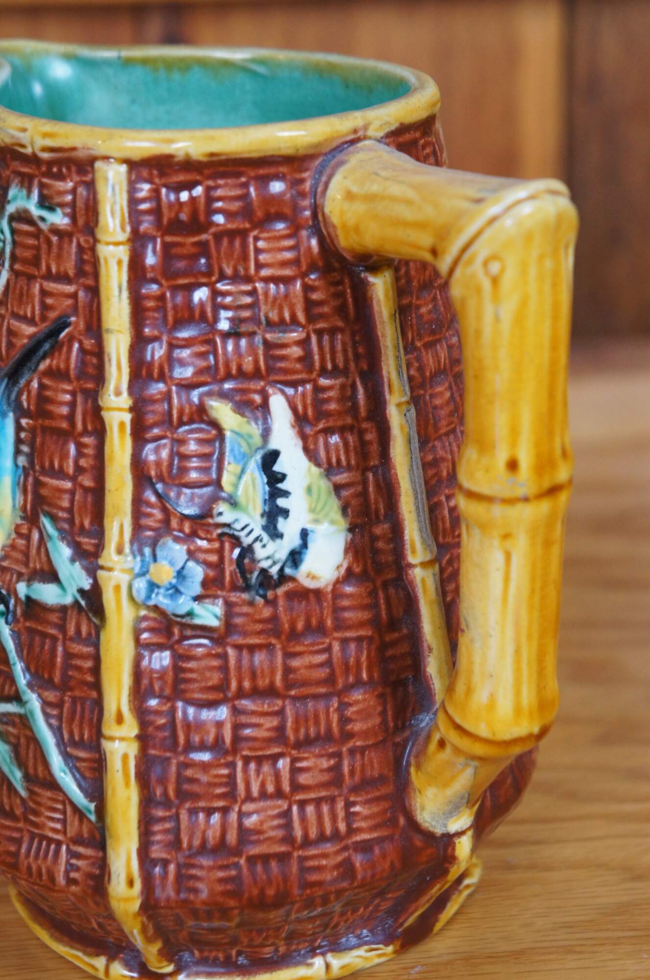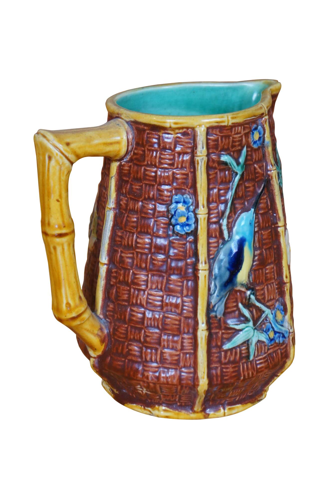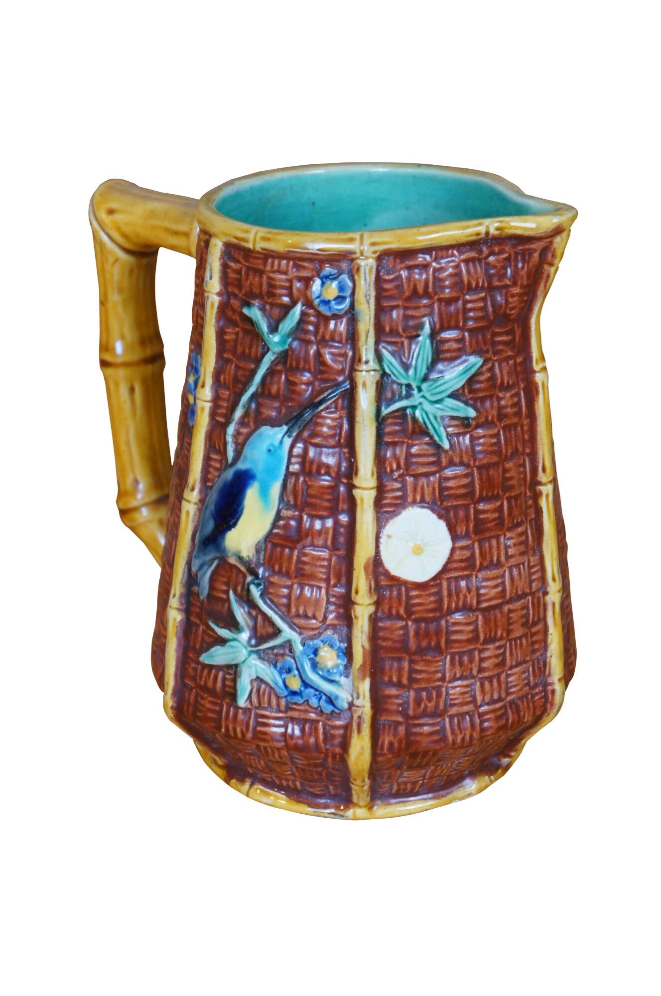 Antique English Aesthetic movement Majolica pitcher or jug featuring a bamboo and basketweave design with hummingbirds, butterfly and flowers, turquoise interior. British Registration mark on base.