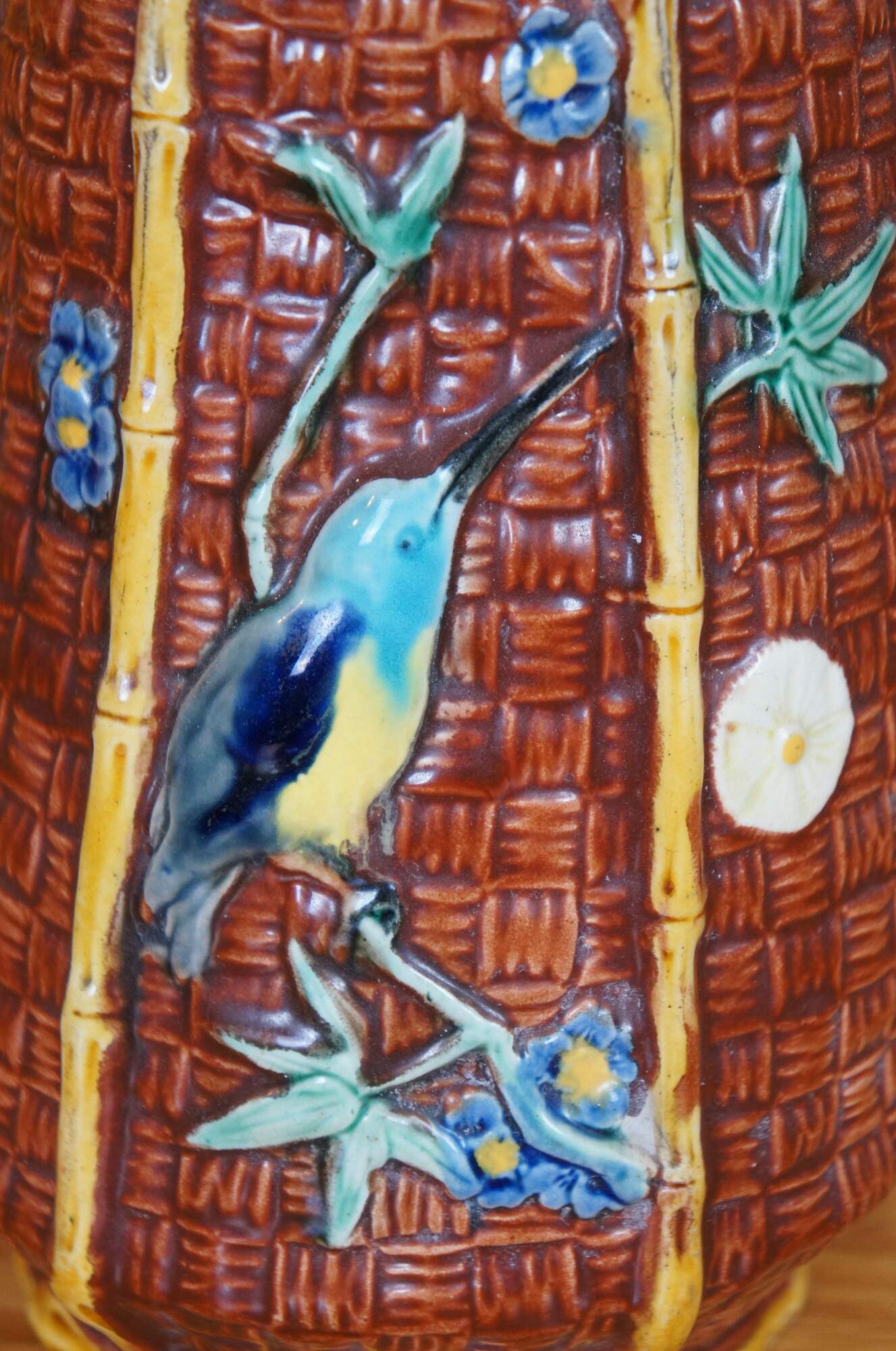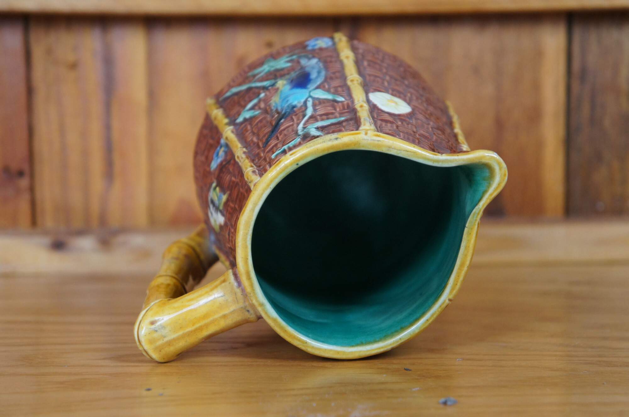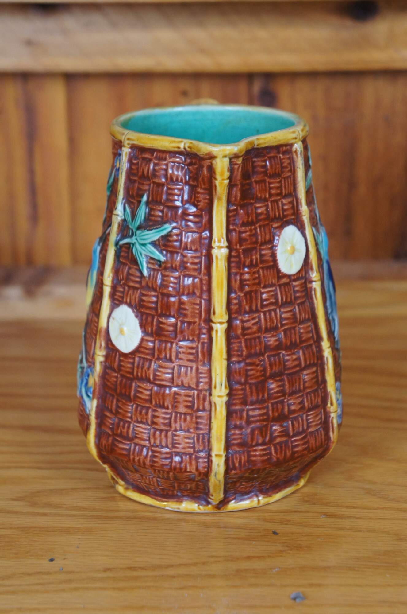 Antique English Aesthetic movement Majolica pitcher or jug featuring a bamboo and basketweave design with hummingbirds, butterfly and flowers, turquoise interior. British Registration mark on base.