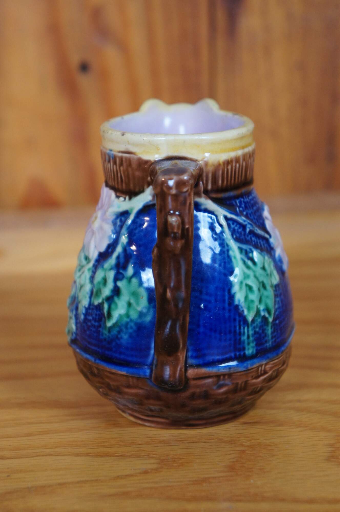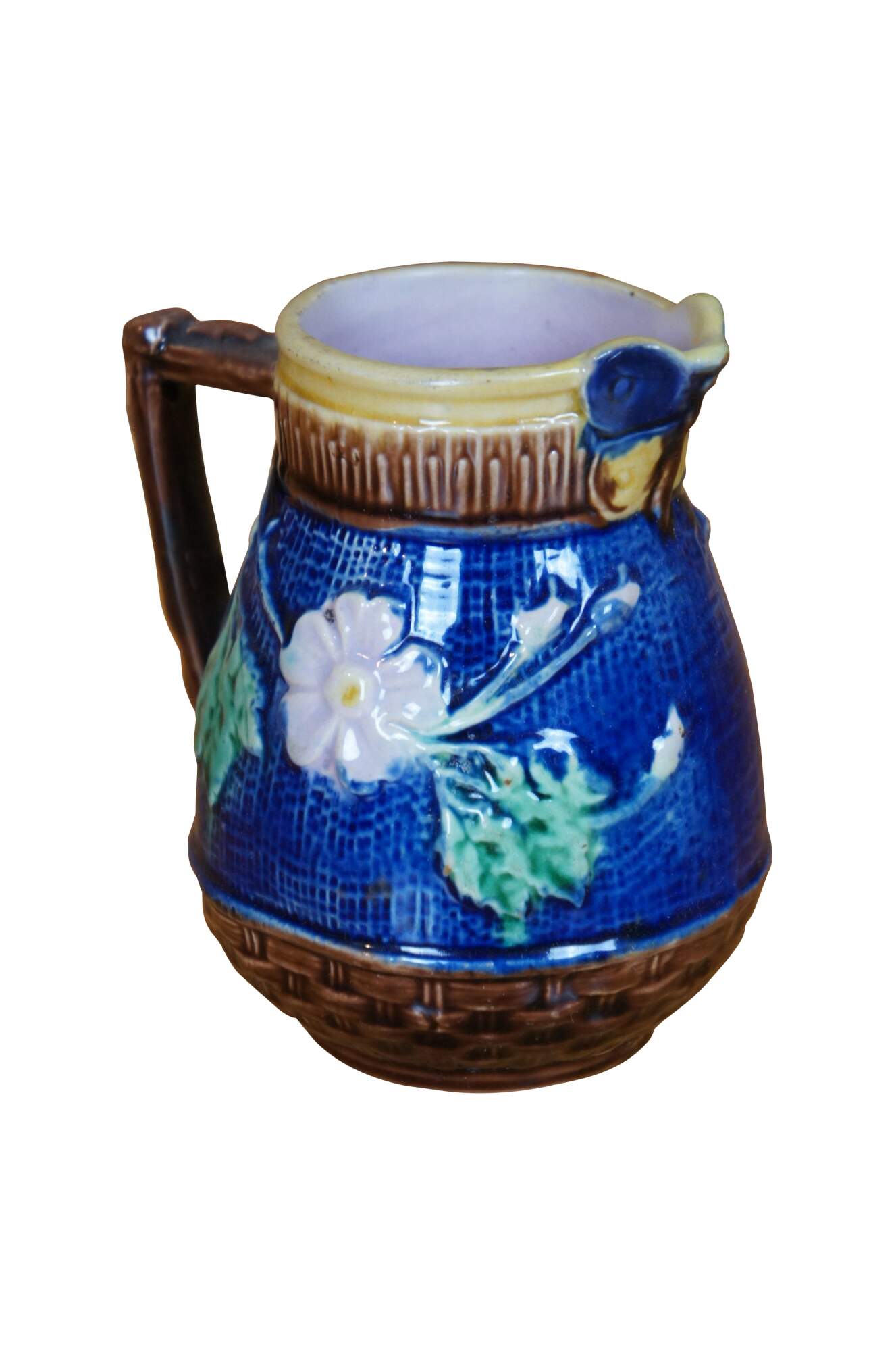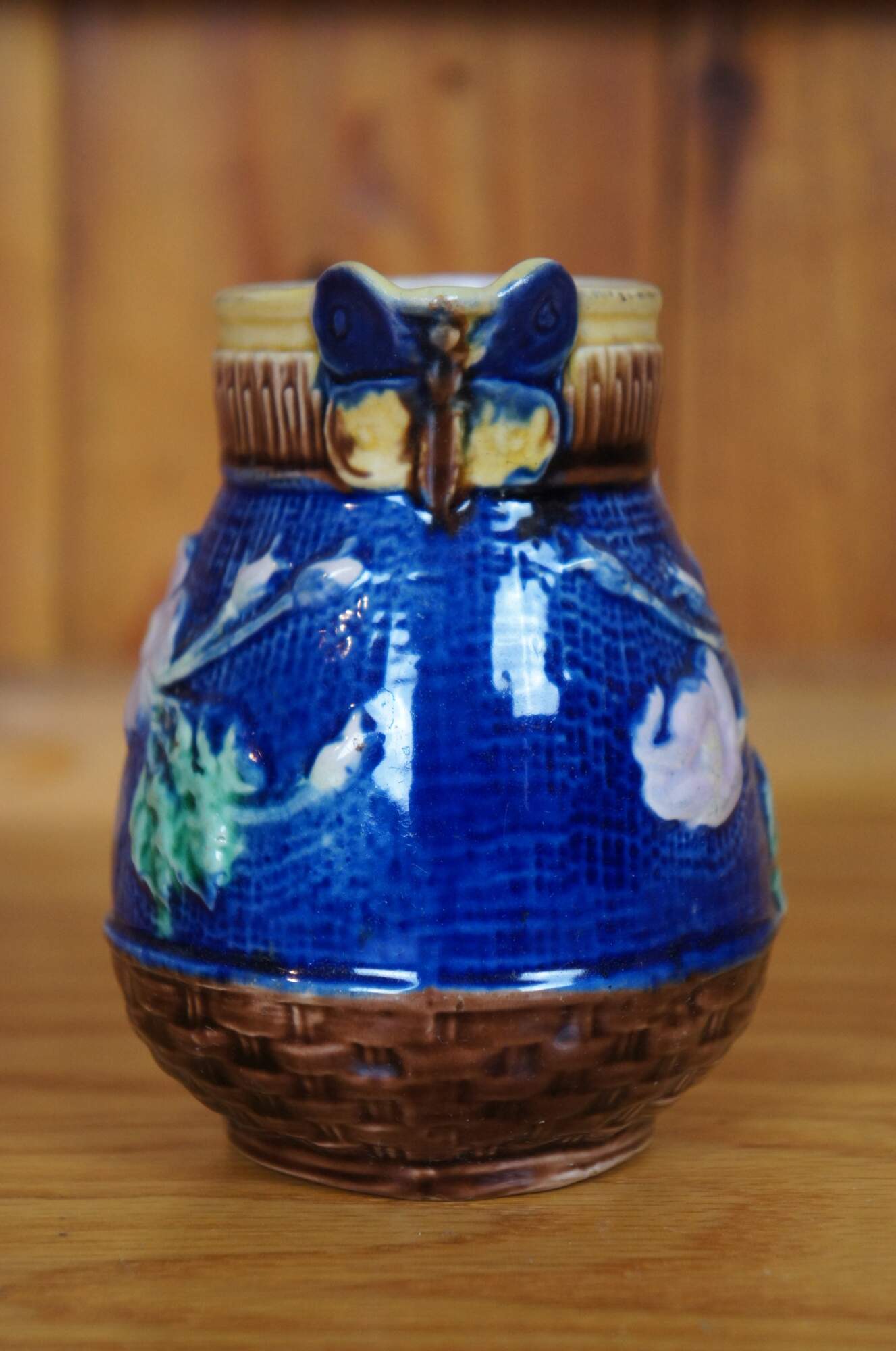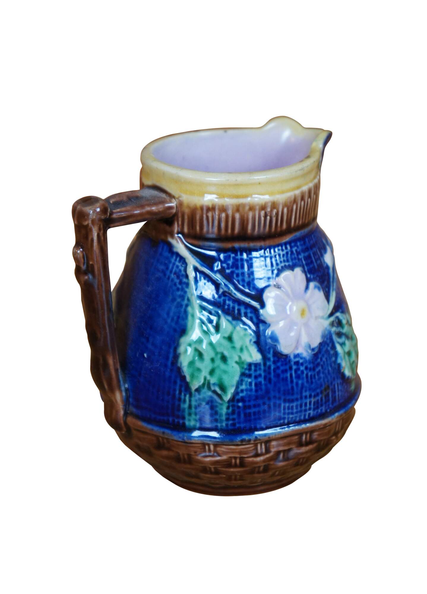 Antique Griffin Smith Hill Etuscan Majolica creamer pitcher featuring a floral theme with dogwoods flowers and butterfly spout, accented with basketweave base.