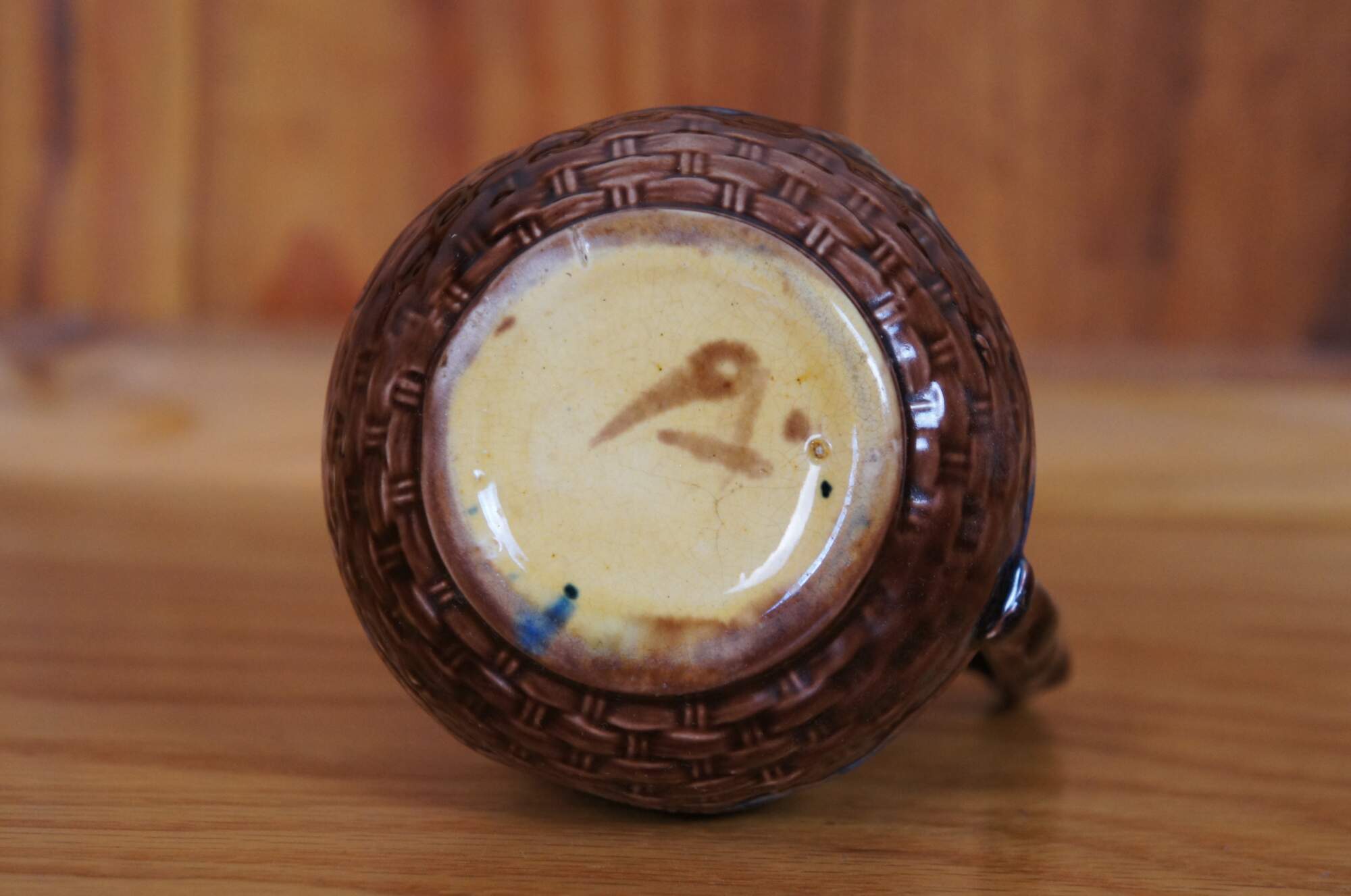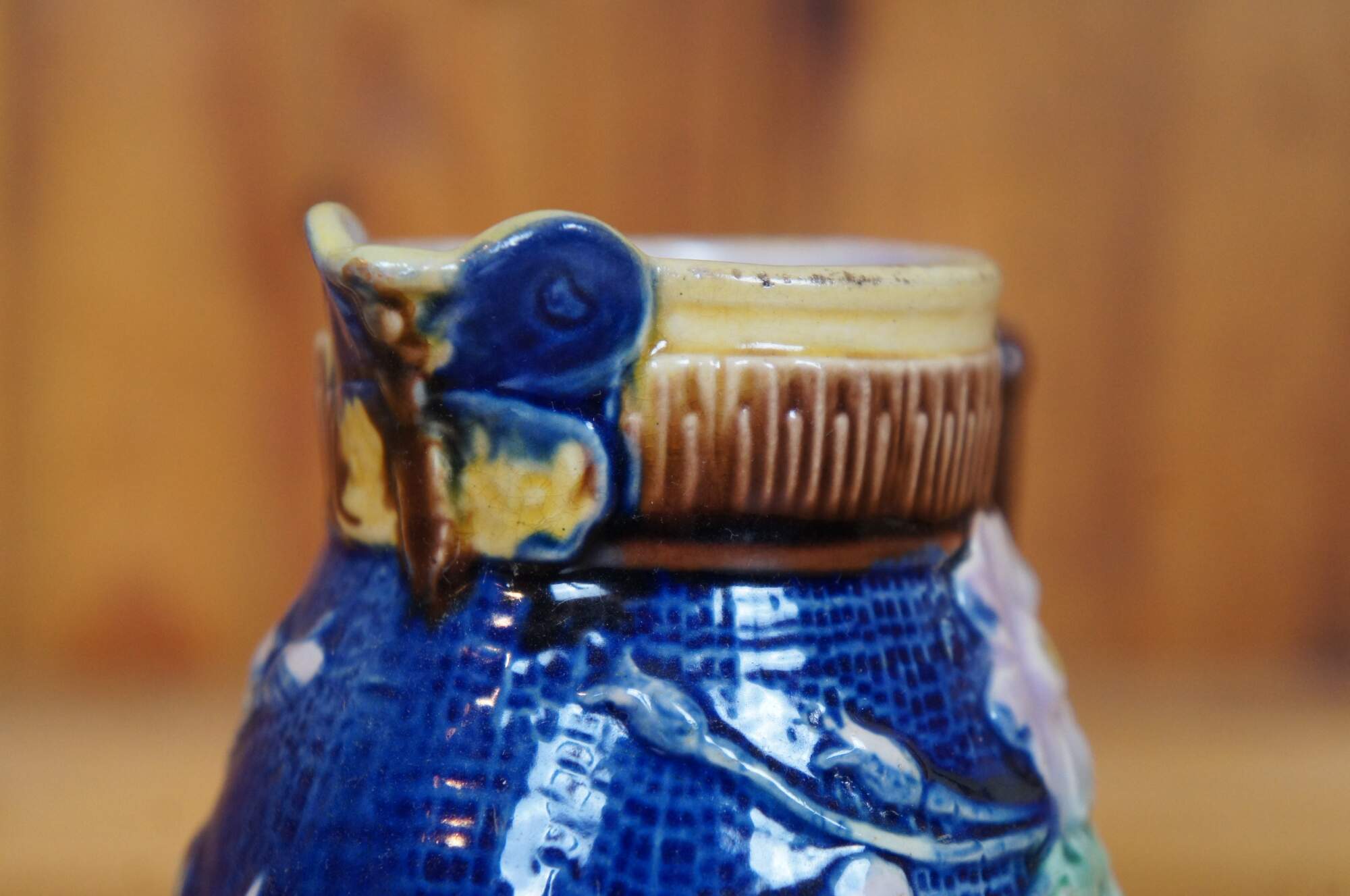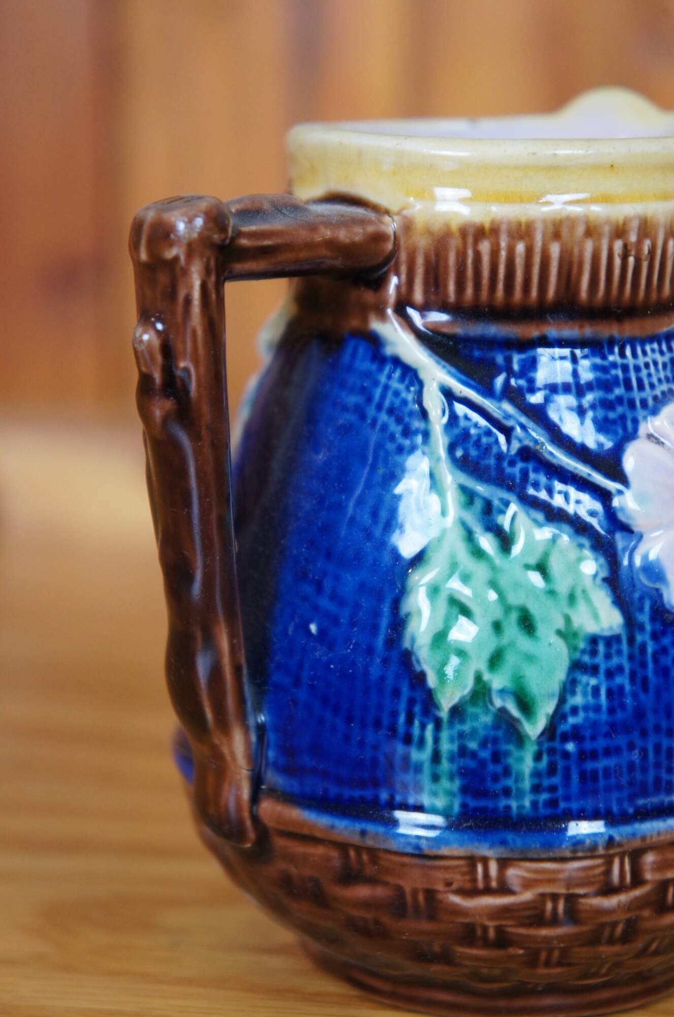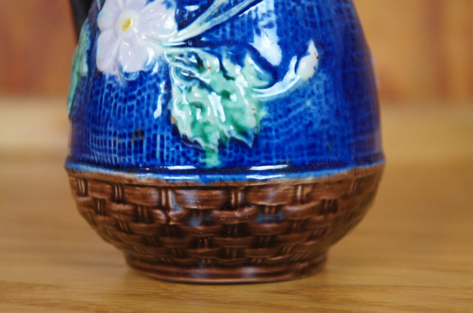Antique Griffin Smith Hill Etuscan Majolica creamer pitcher featuring a floral theme with dogwoods flowers and butterfly spout, accented with basketweave base.