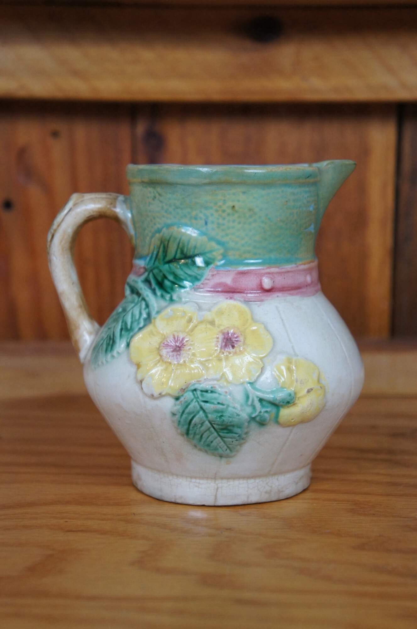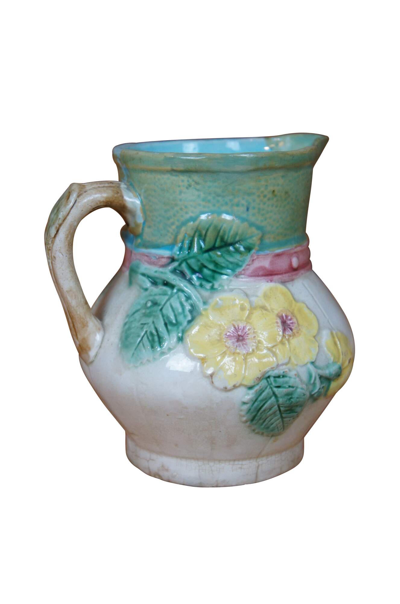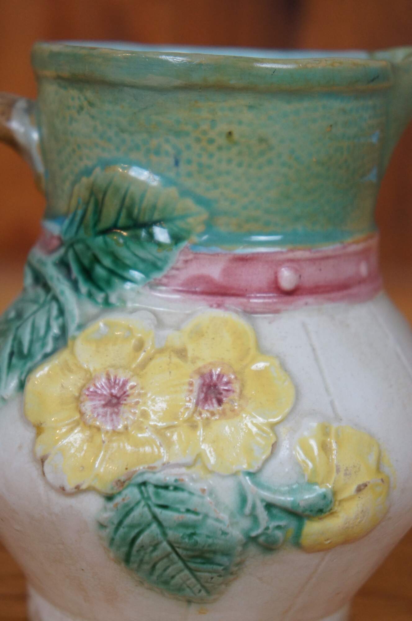 Antique Majolica creamer pitcher or milk jug featuring a multicolor basketweave pattern with pink and yellow flowers and rustic twig / branch handle.