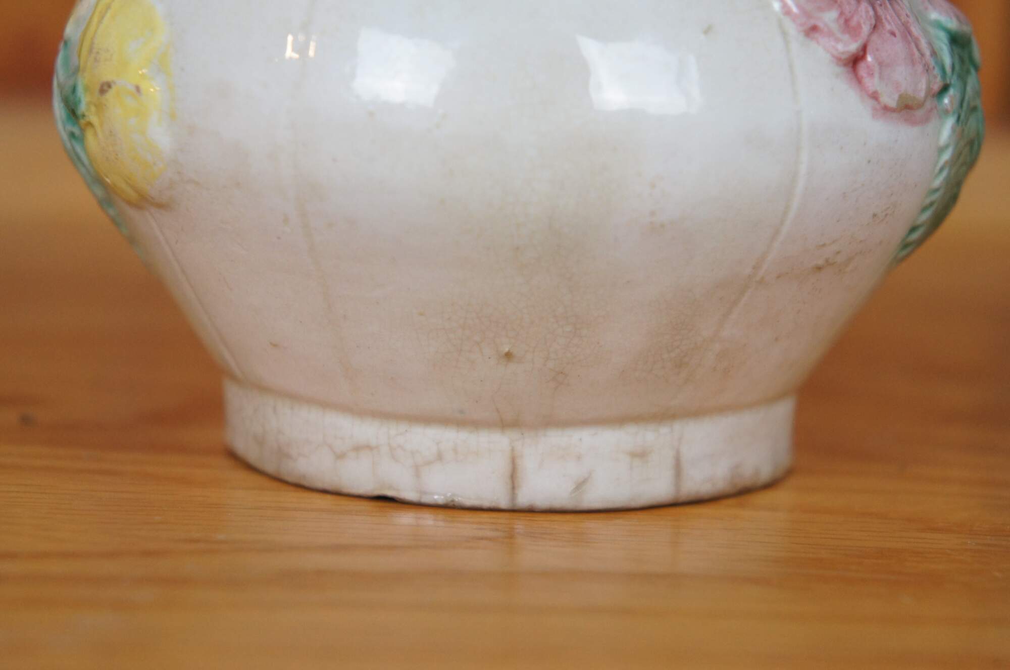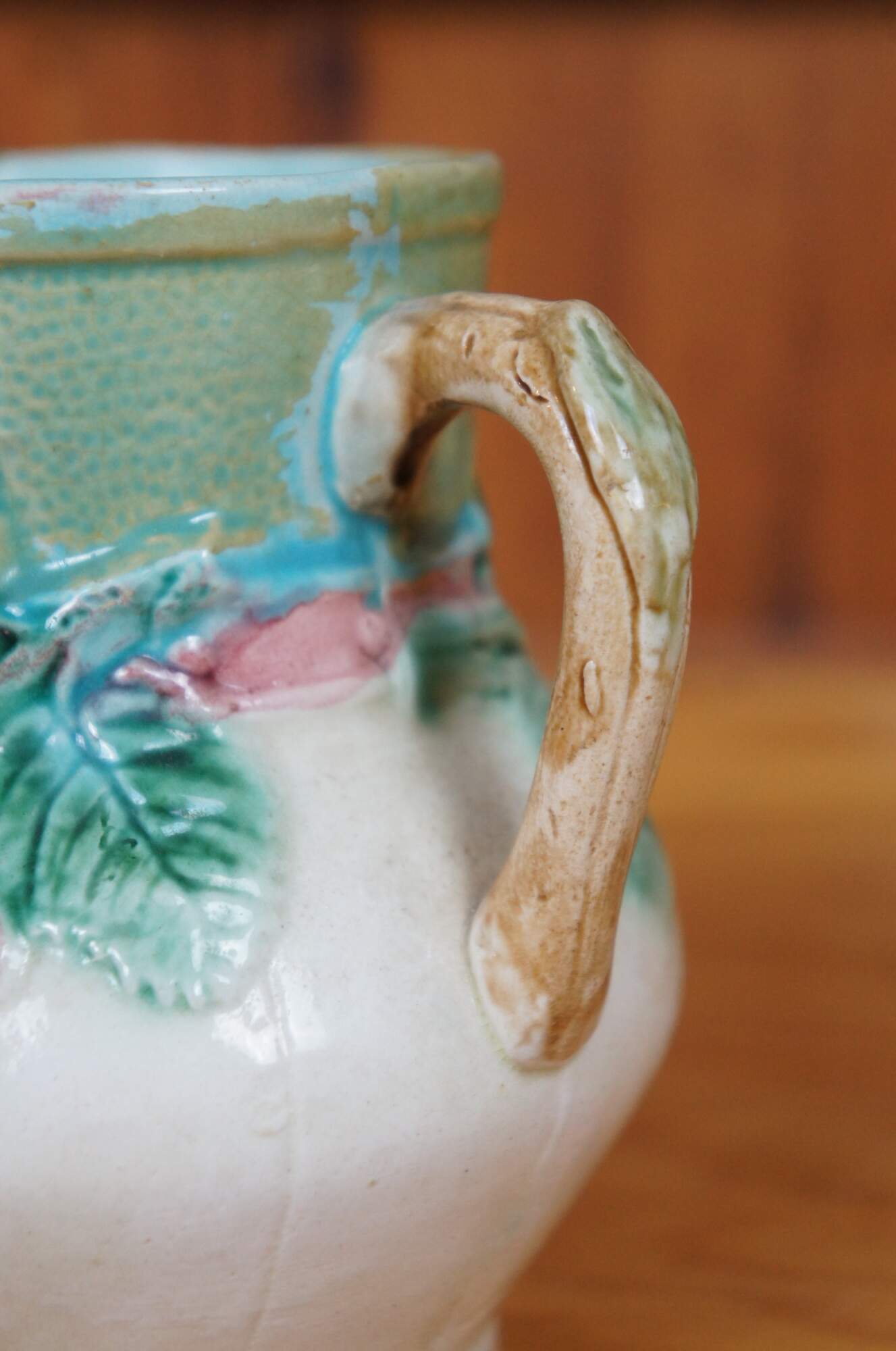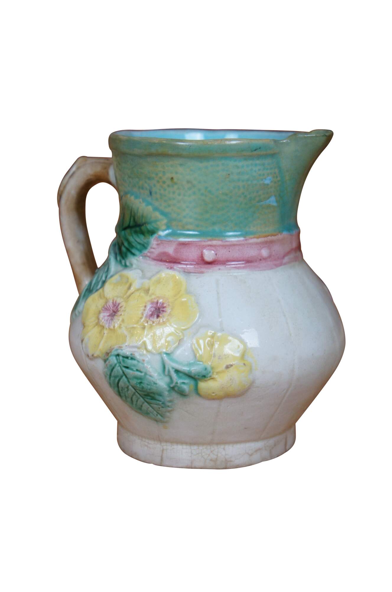 Antique Majolica creamer pitcher or milk jug featuring a multicolor basketweave pattern with pink and yellow flowers and rustic twig / branch handle.