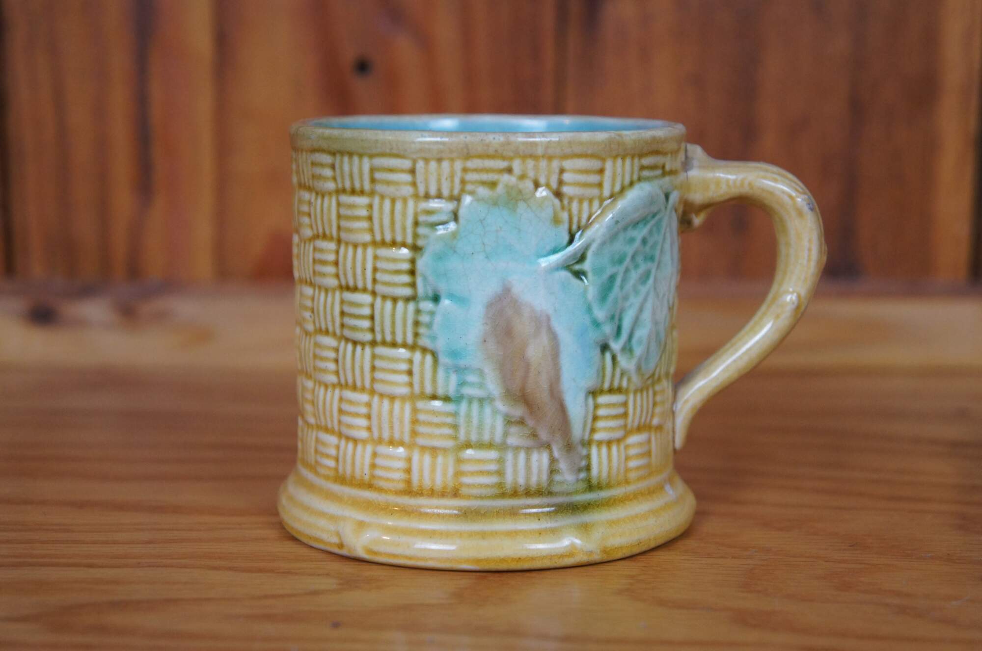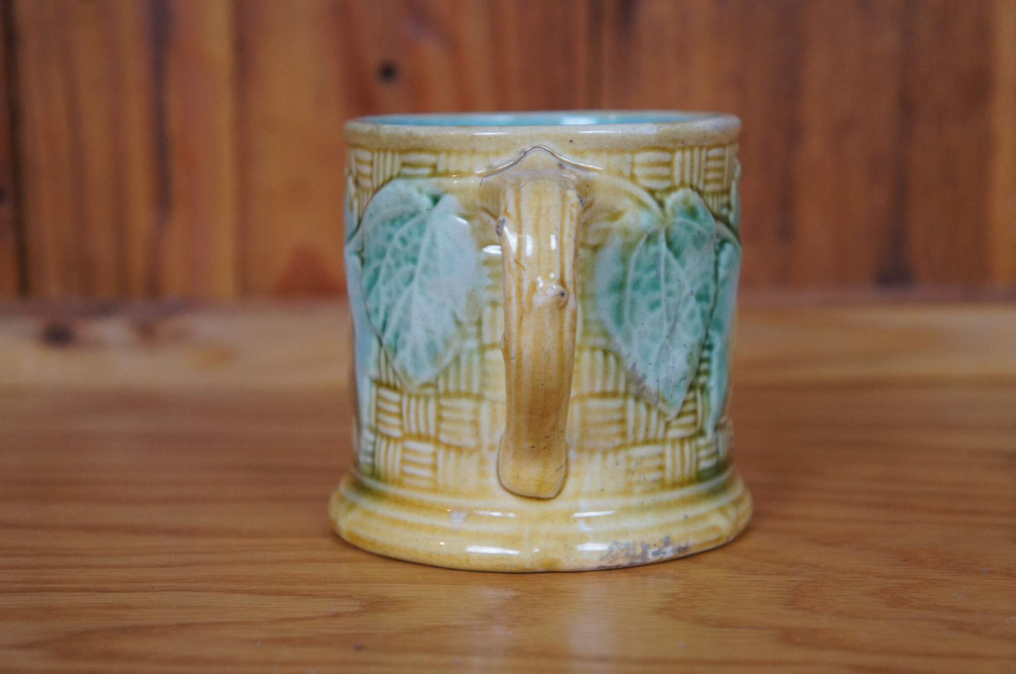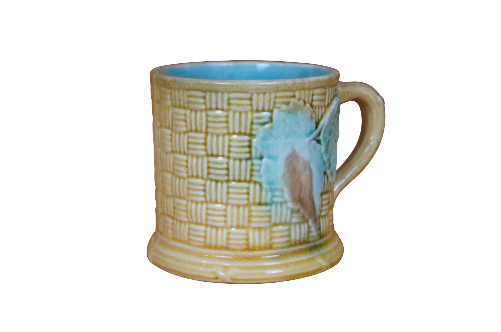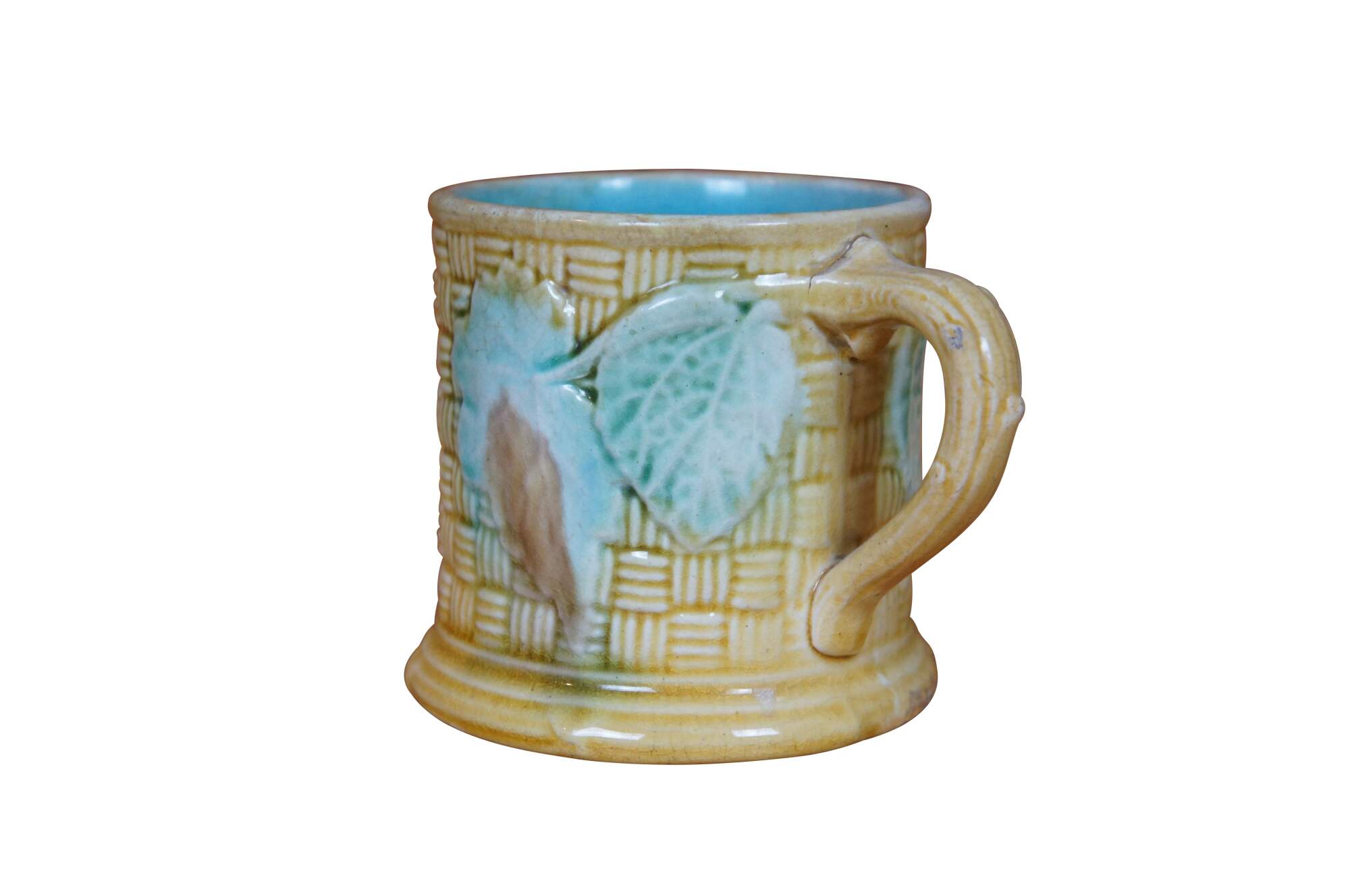 Antique Majolica mug or cup featuring a basketweave motif with Begonia / fern leaves and rustic branch / twig handle.