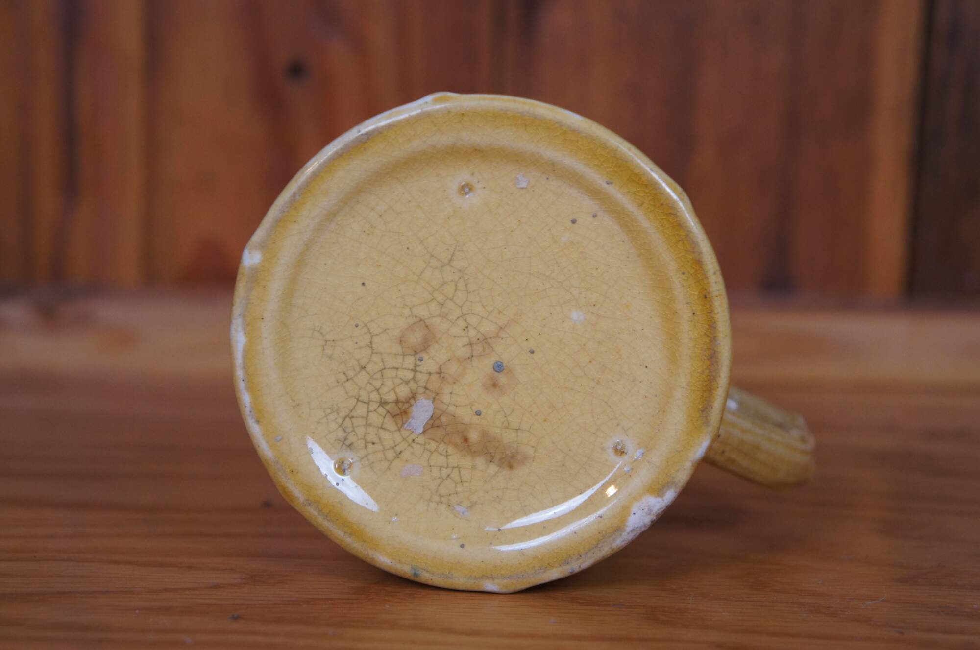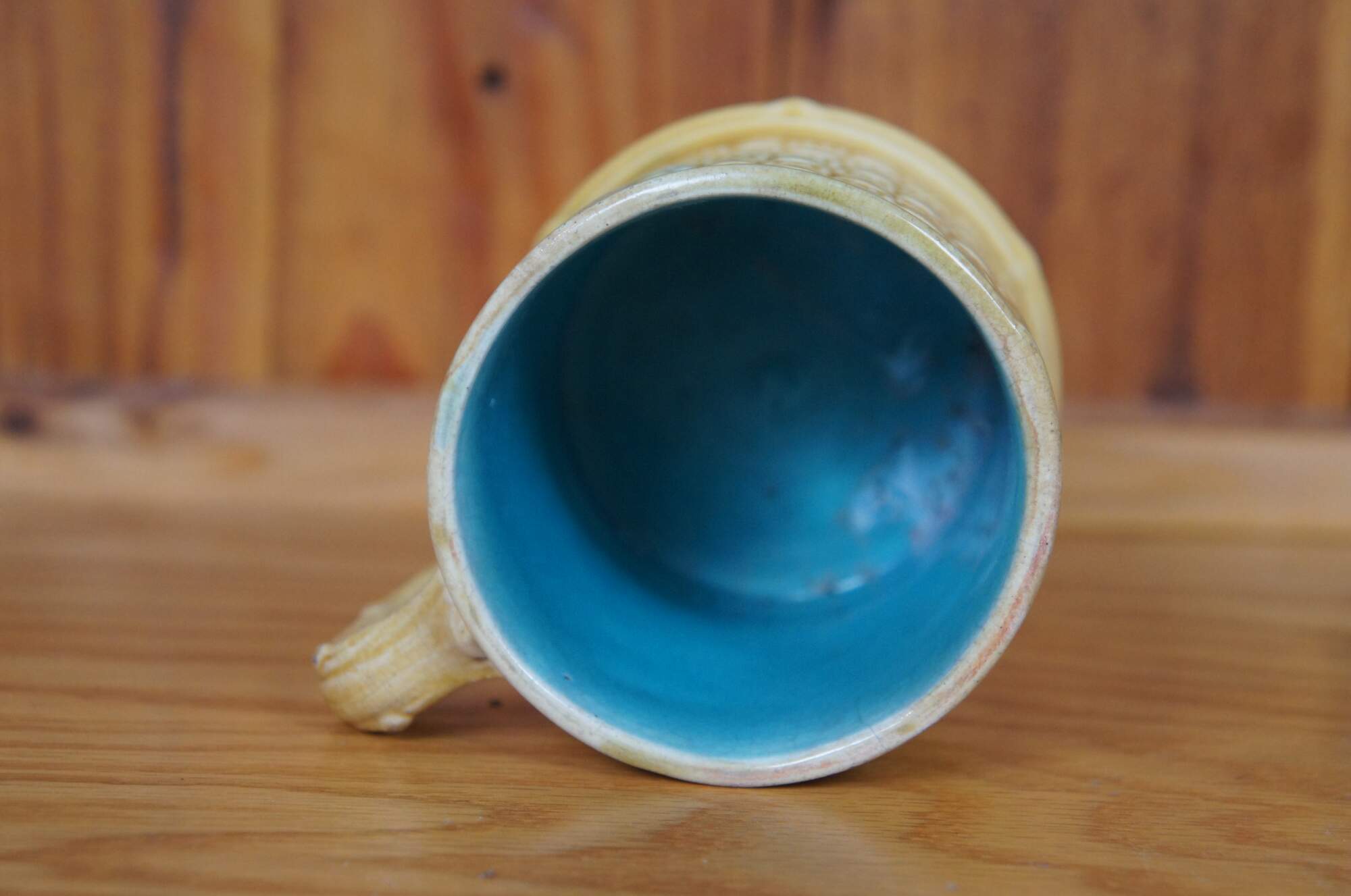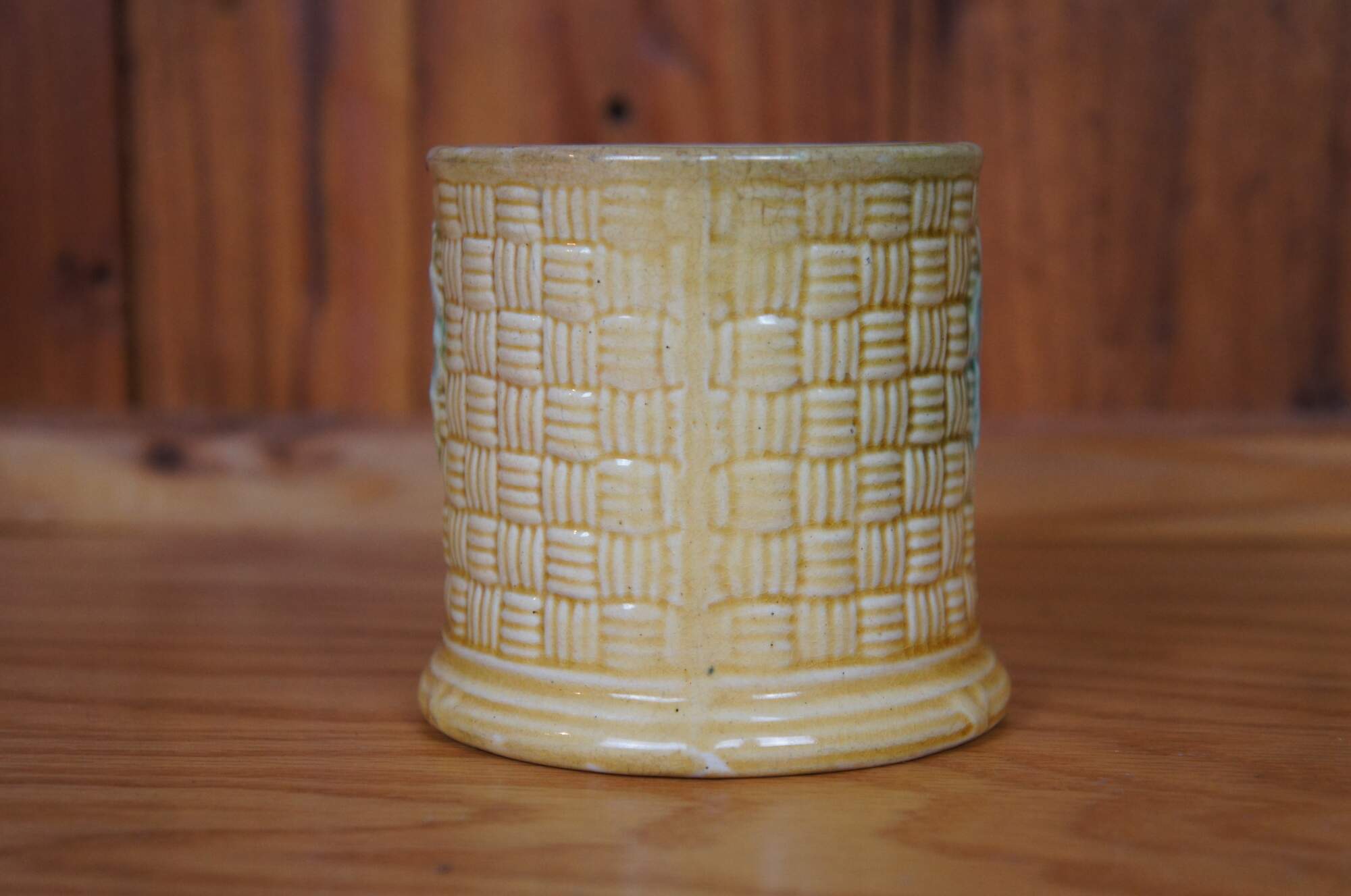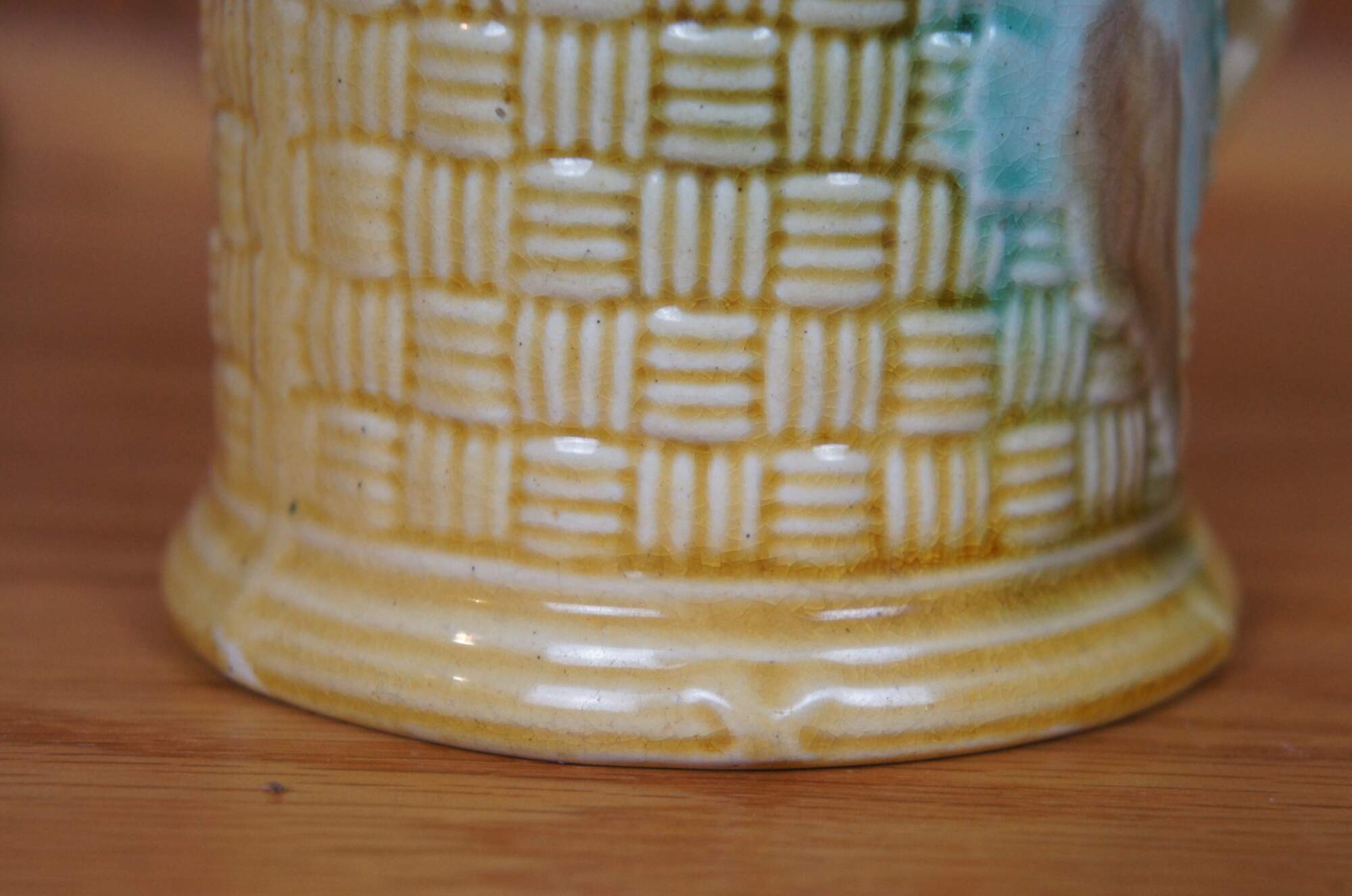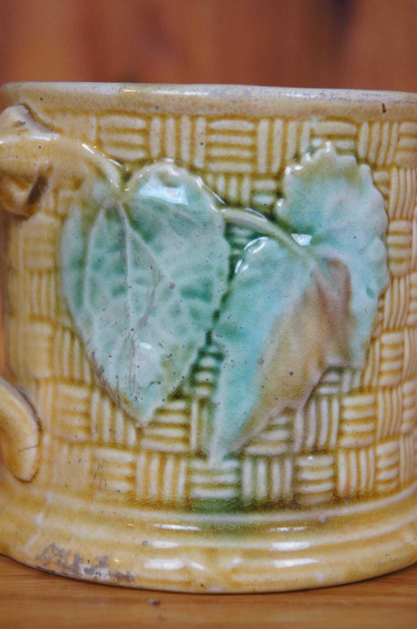Antique Majolica mug or cup featuring a basketweave motif with Begonia / fern leaves and rustic branch / twig handle.