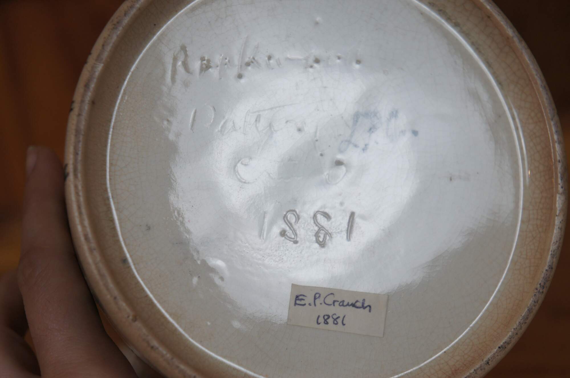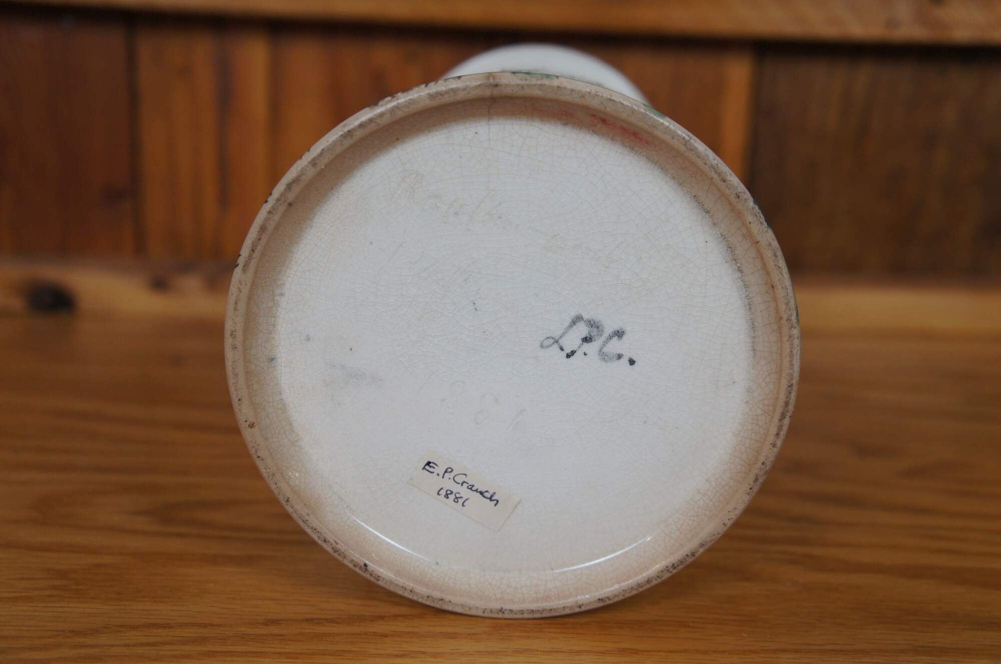 If it was Edward Pope Cranch, he was born in Washington DC on May 29, 1809, and moved to Cincinnati around 1831. He was an attorney by trade, but also an accomplished illustrator and lecturer. He occasionally decorated pottery for Rookwood between 1882 until his death in 1892. His artwork tends towards a single-colored outline, including farm scenes, owls, and vultures. His work is normally found on utility-ware such as dishes, mugs, tankards, and pitchers. His work is considered to have average collector value.