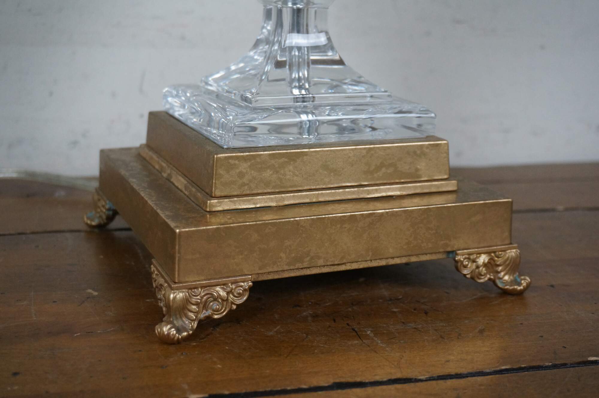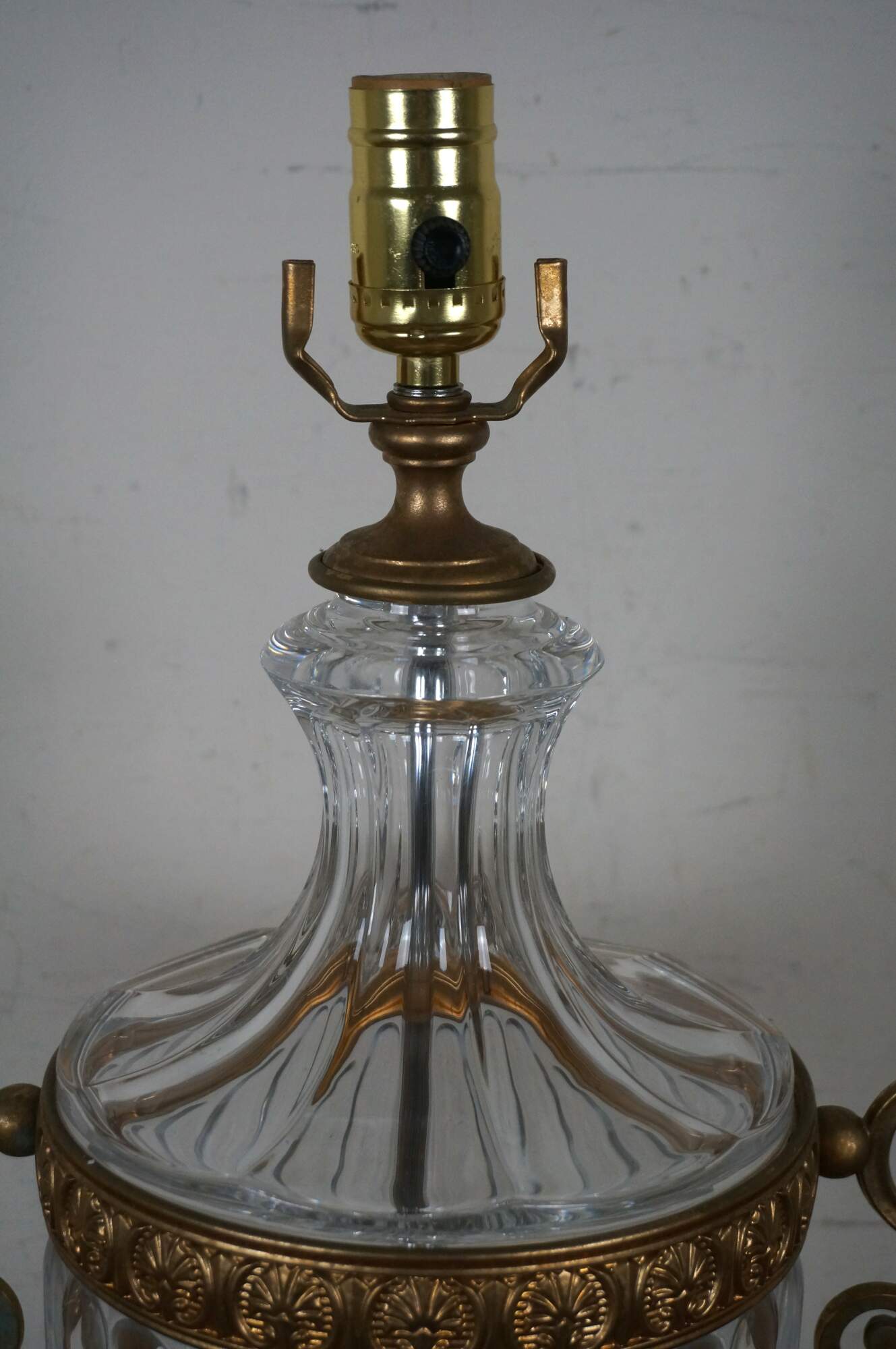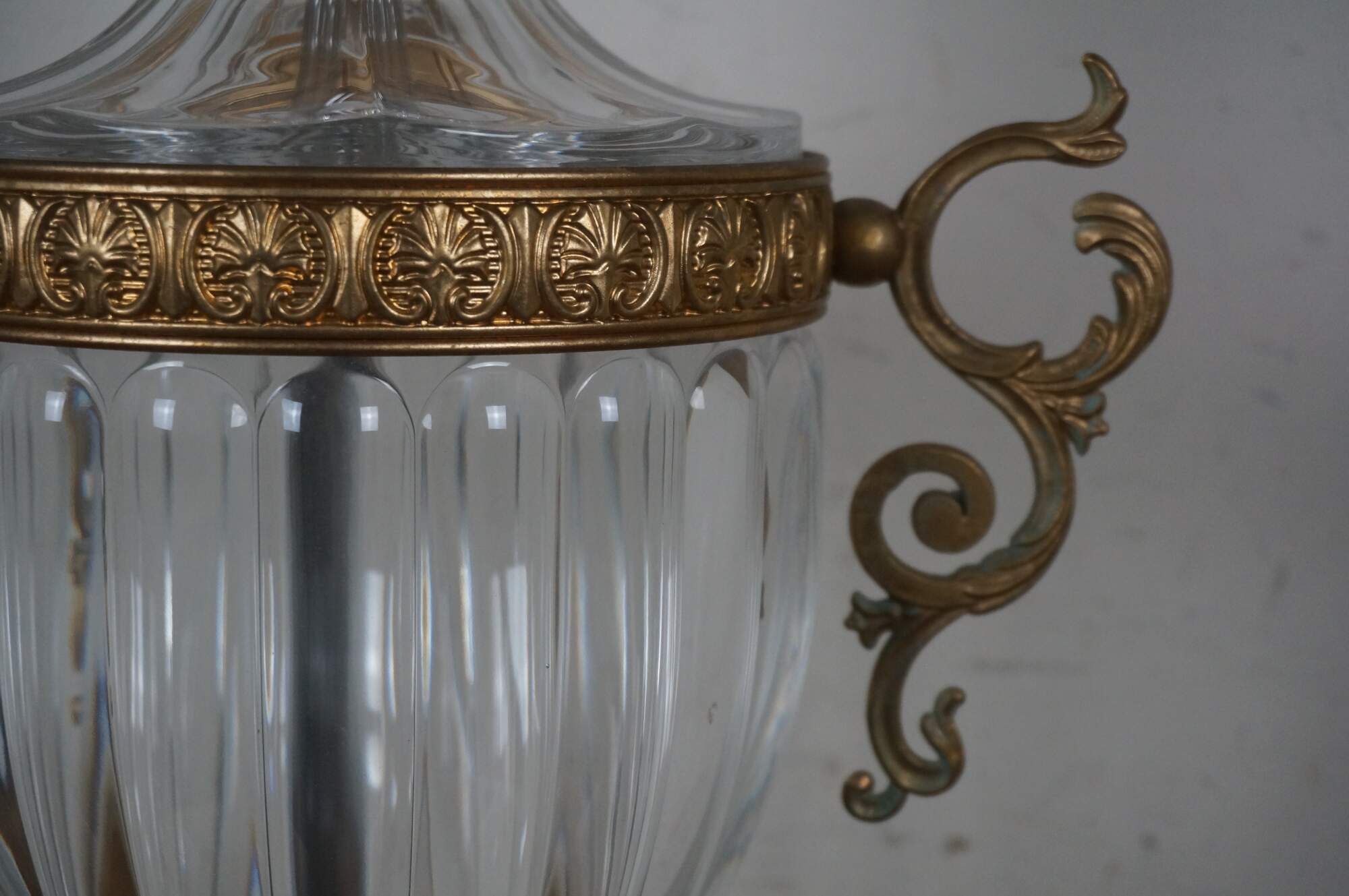 A large and impressive late 20th century fluted crystal trophy urn shaped table lamp featuring a square brass base with foliate feet, a scallop shell patterned band and scrolling foliate handles.