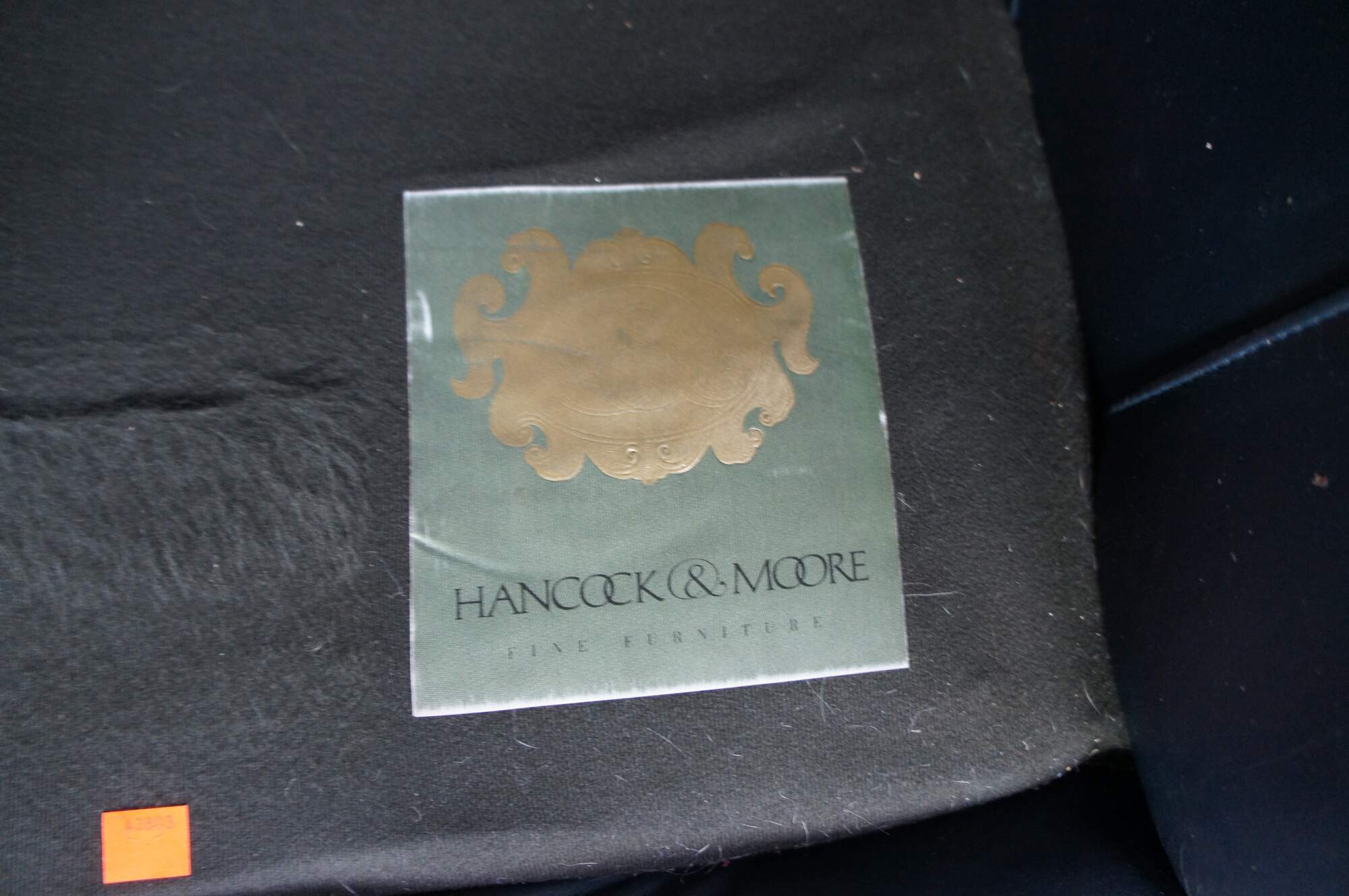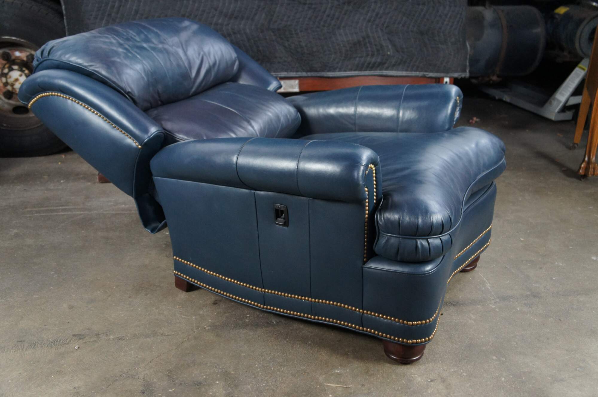 Early 21st Century Hancock & Moore Library Club Chair with Recliner. The Austin High Back features genuine Caress Dark blue leather upholstery with rolled arms, brass nailhead trim, and distressed walnut-finished bun feet. The chair reclines via a black switch on the right side beneath the arm. #2038NB