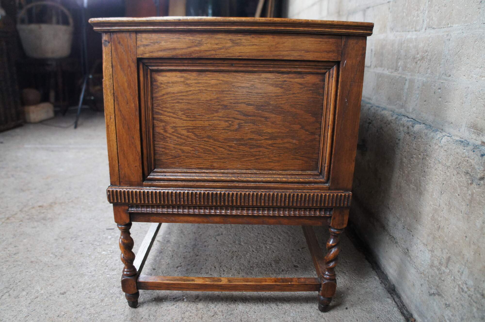 An exceptional American Victorian Oak blanket chest. French inspired with paneled front and sides over joined barley twist supports. The trunk opens via two large iron hinges.