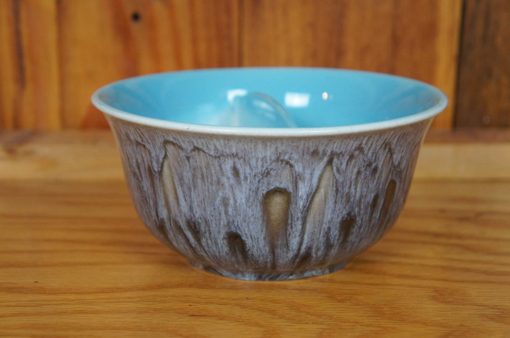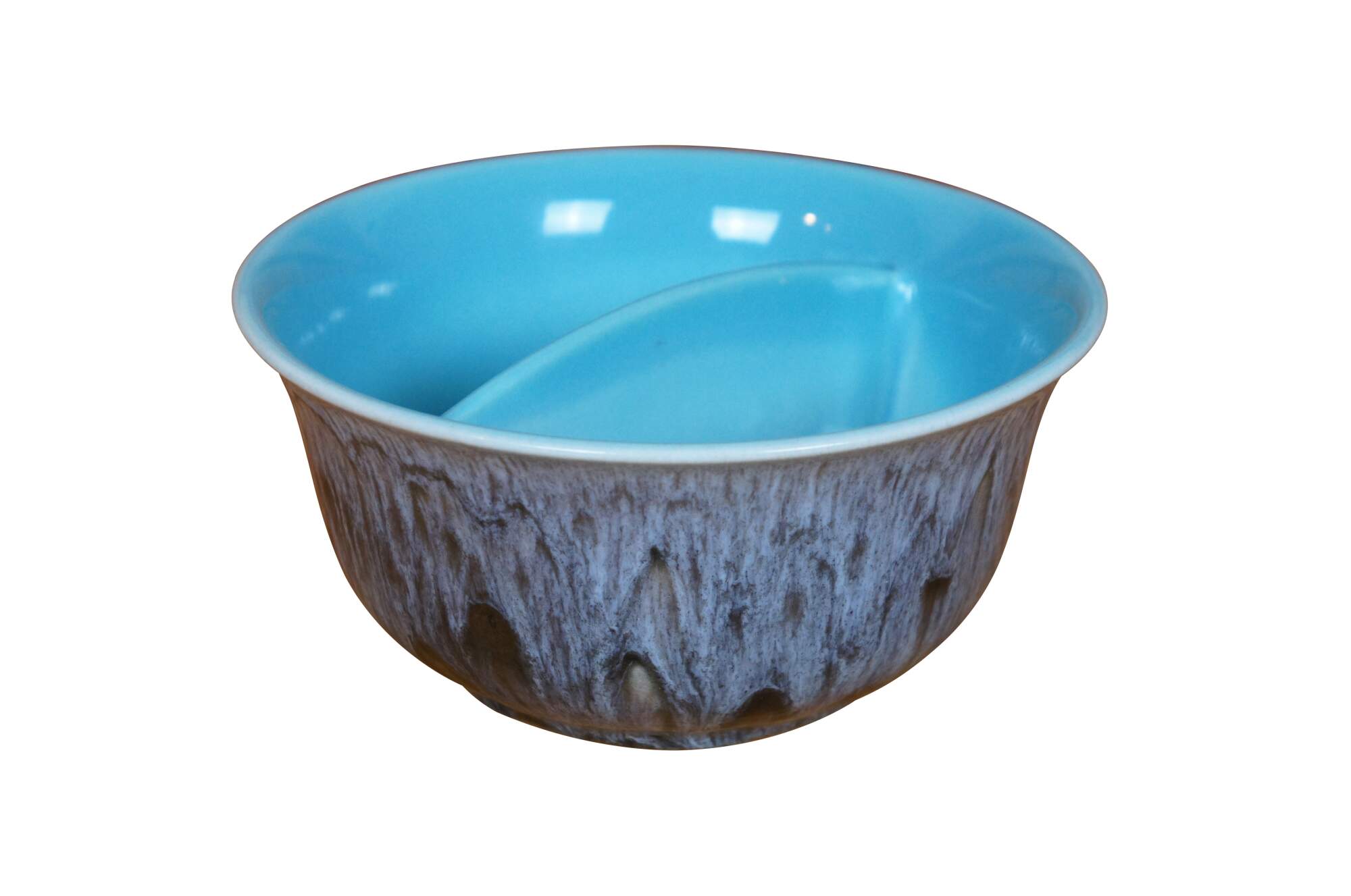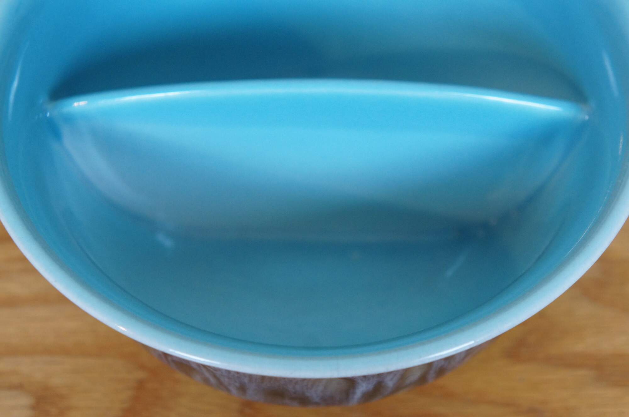 Rare mid-century Rookwood bowl or compote featuring a divided turquoise interior with grey-brown drip glaze body. Circa XLIX 1949, Shape 7024, size A.