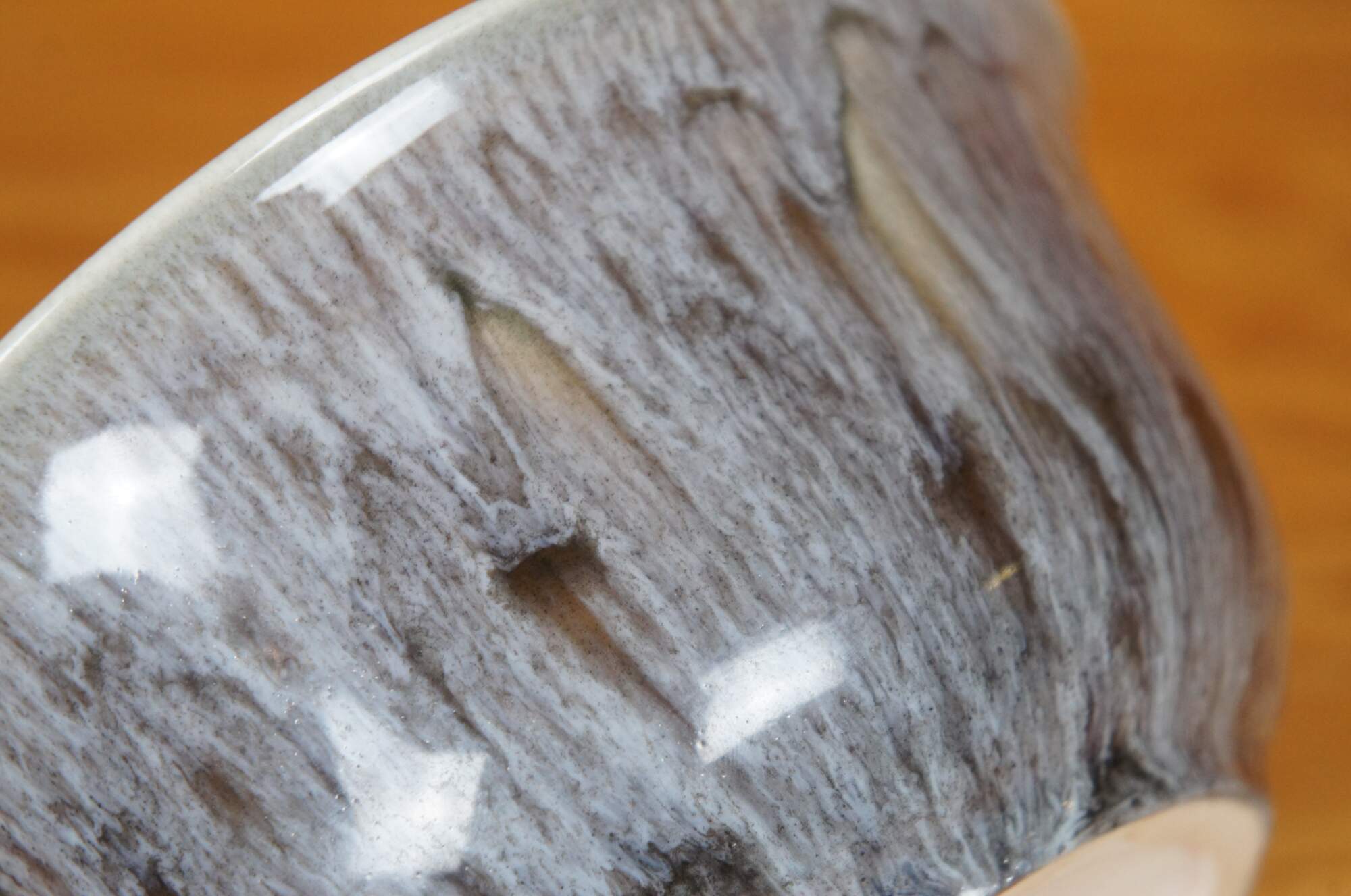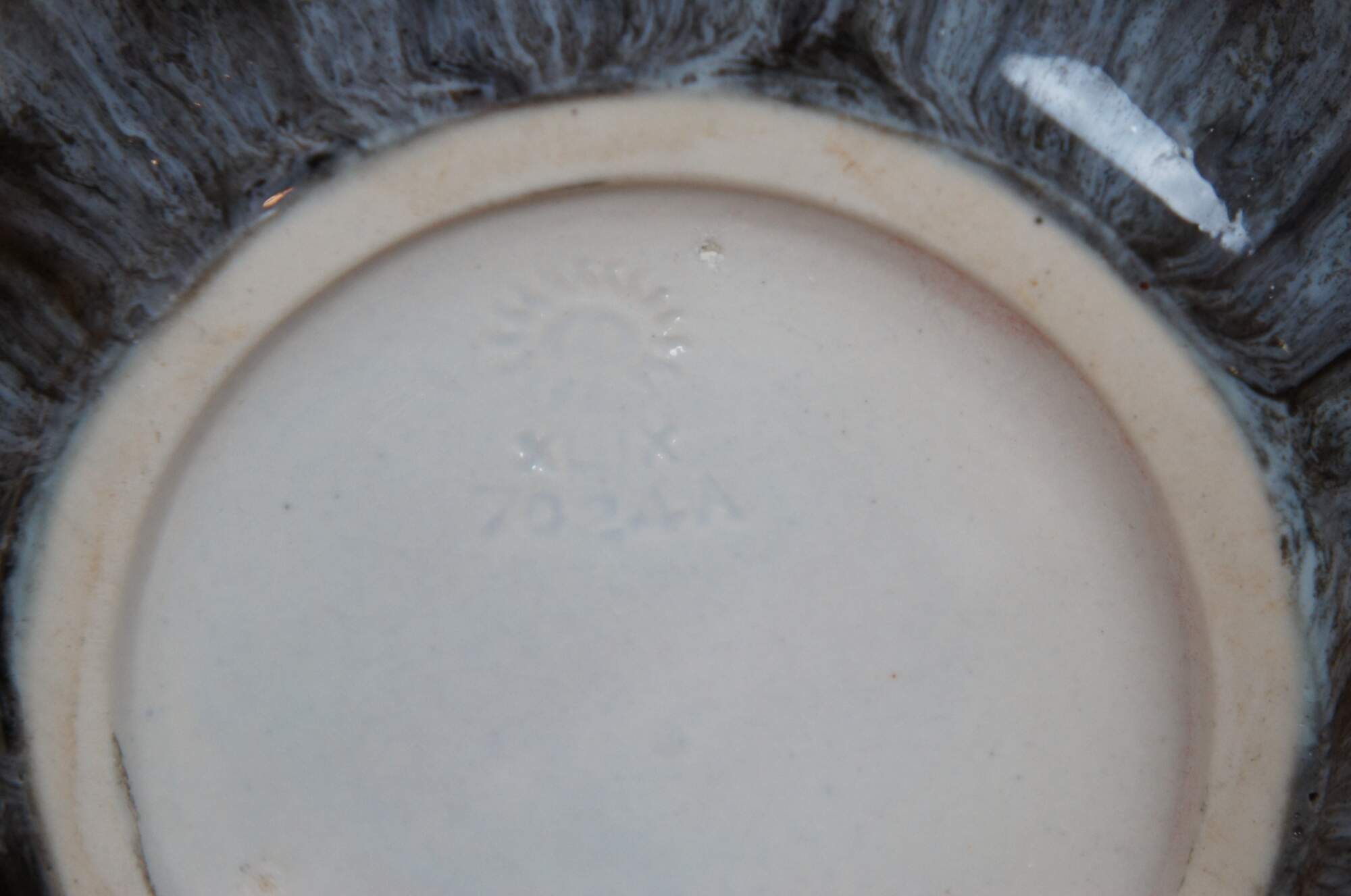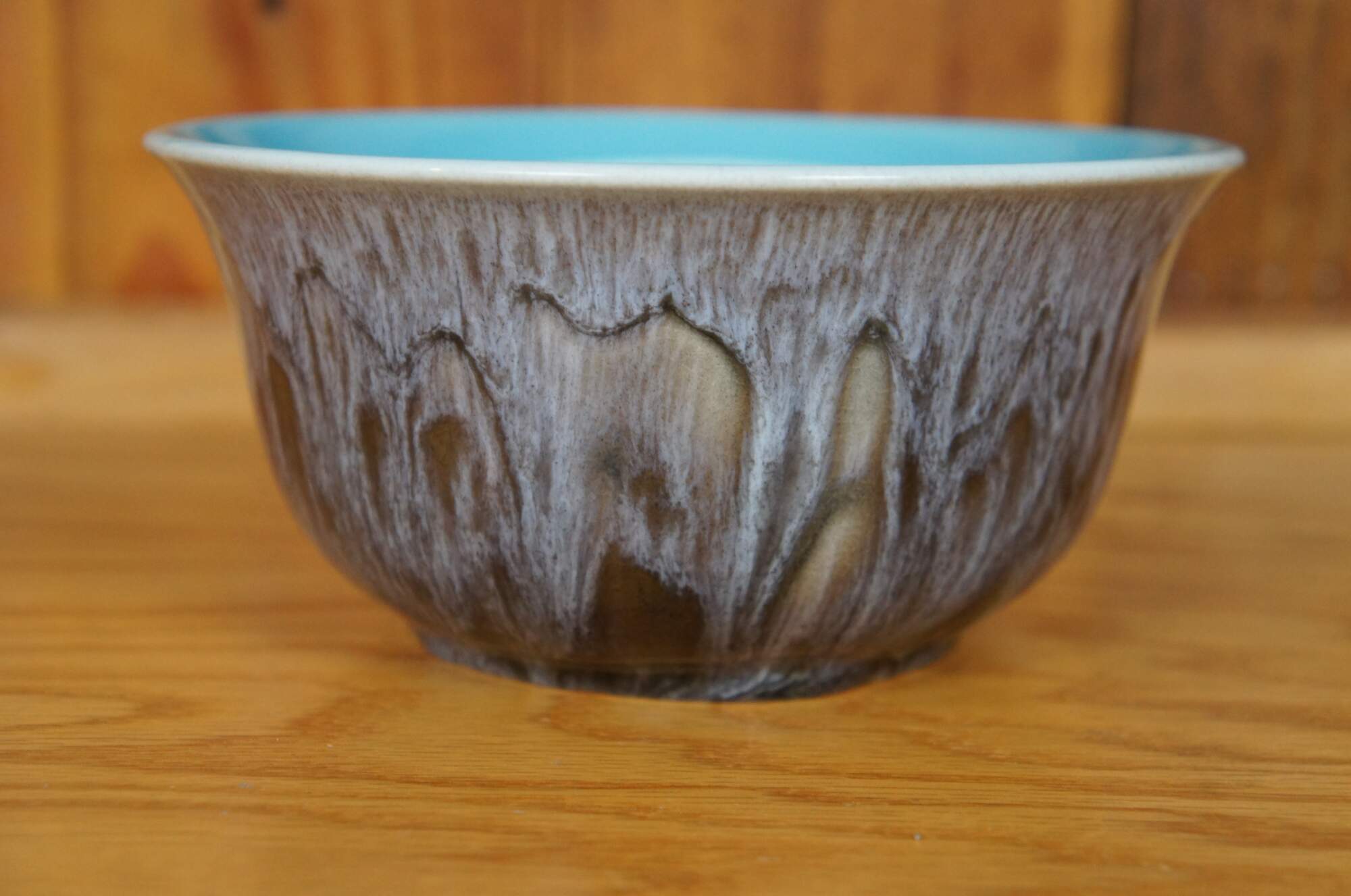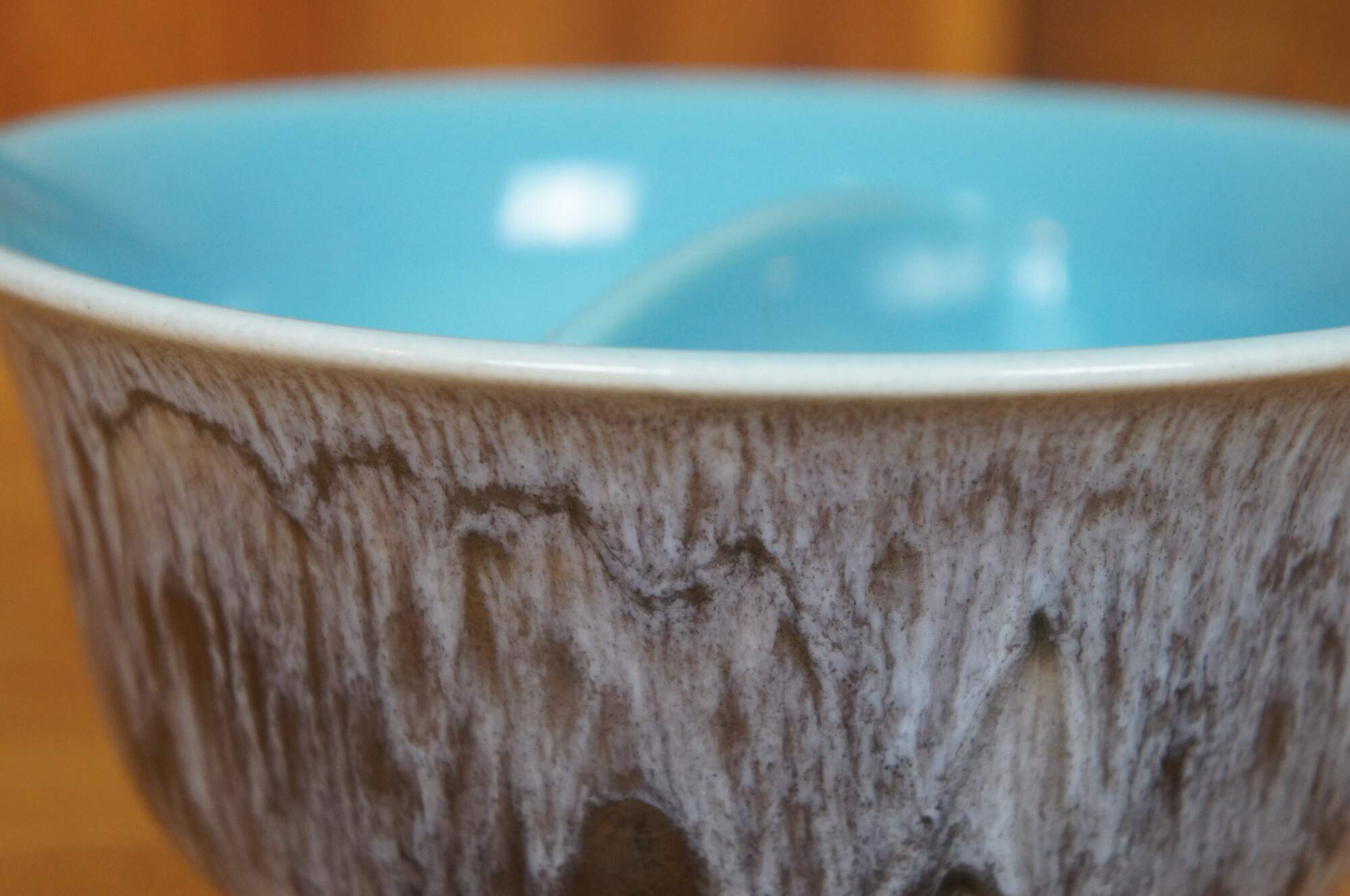 Rare mid-century Rookwood bowl or compote featuring a divided turquoise interior with grey-brown drip glaze body. Circa XLIX 1949, Shape 7024, size A.