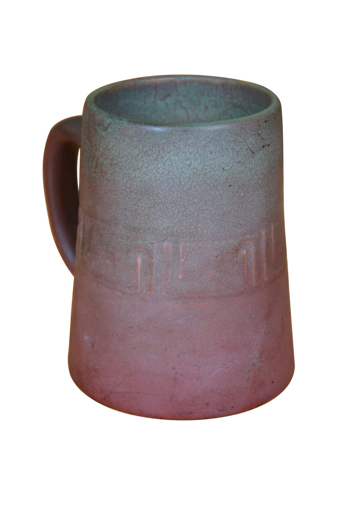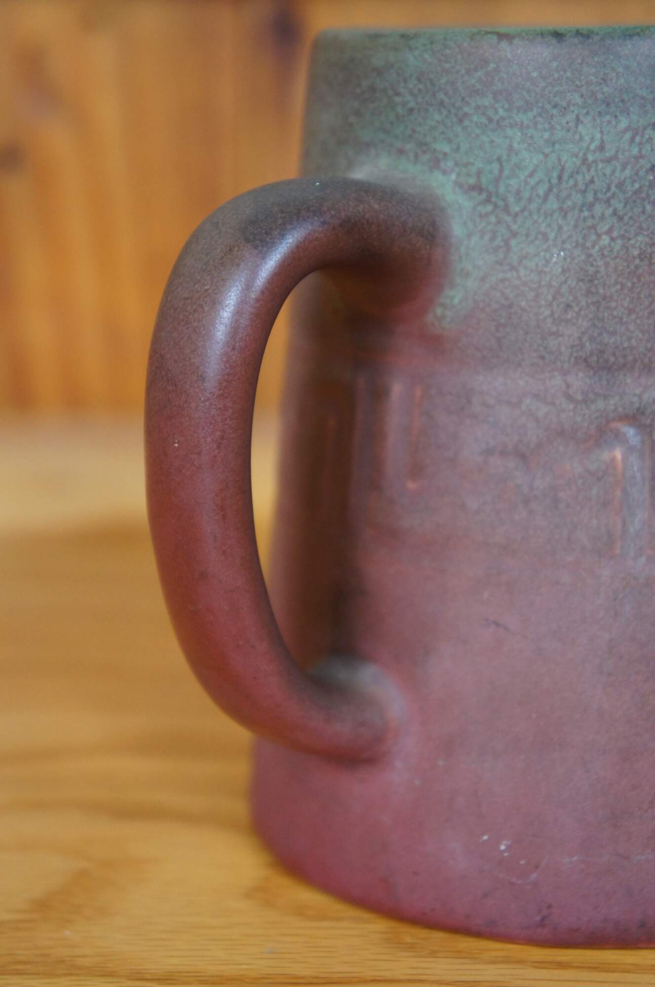 Antique Rookwood arts & crafts / art nouveau vellum glaze mug / stein featuring a mottled purple and blue undertone matte glaze cup with handle. Circa VII 1905, shape 587, size C.