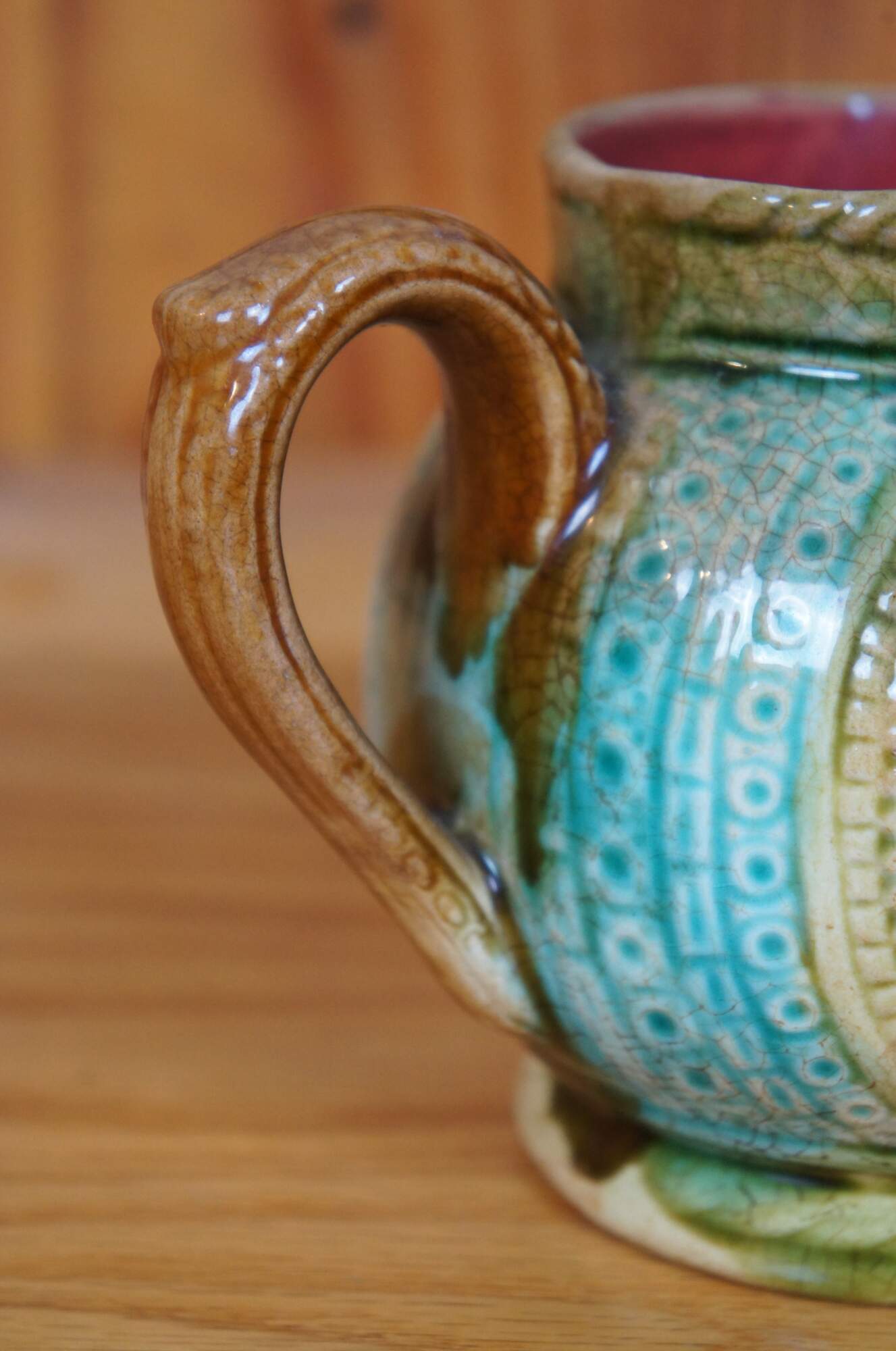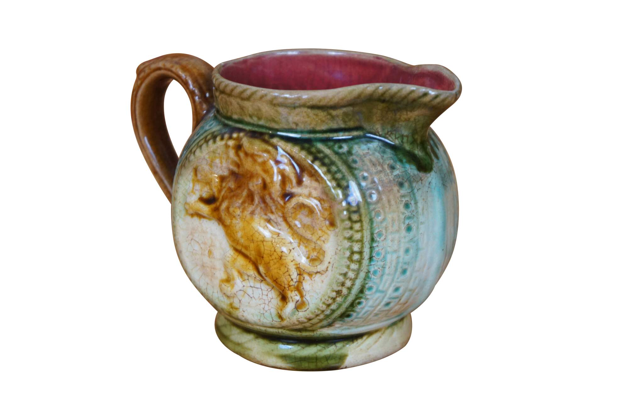 Antique Frie Onnaing Majolica pitcher featuring polychrome glaze with a heraldic lion on each side..