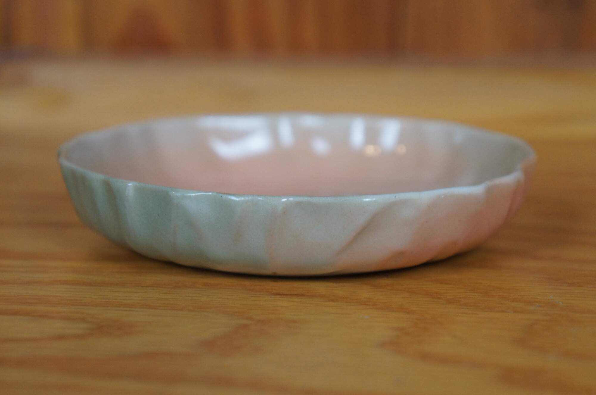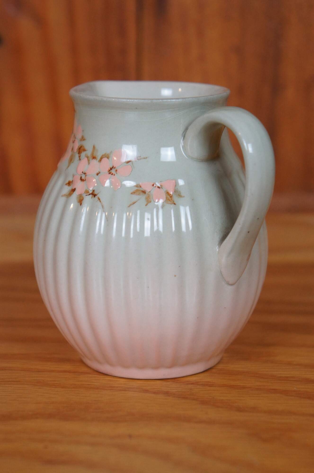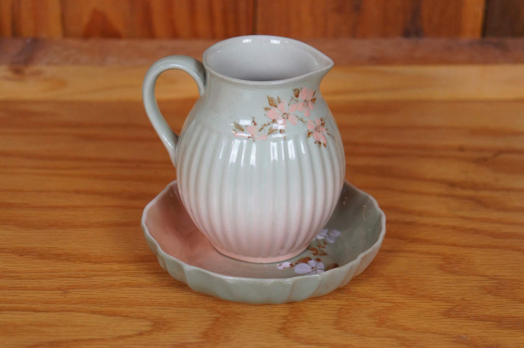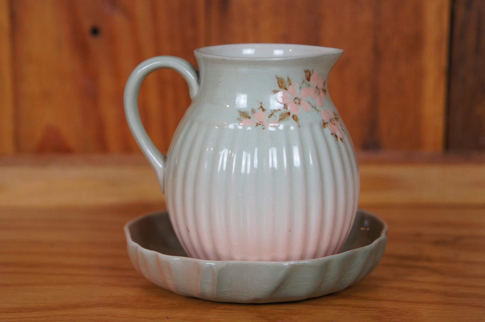 Antique Rookwood cream pitcher and underplate dish / saucer by Sallie Toohey. It features a floral themed iris glaze with pink and white flowers, and ribbed and scalloped accents. Circa 1888 / 1889, Shape 193 and 460.