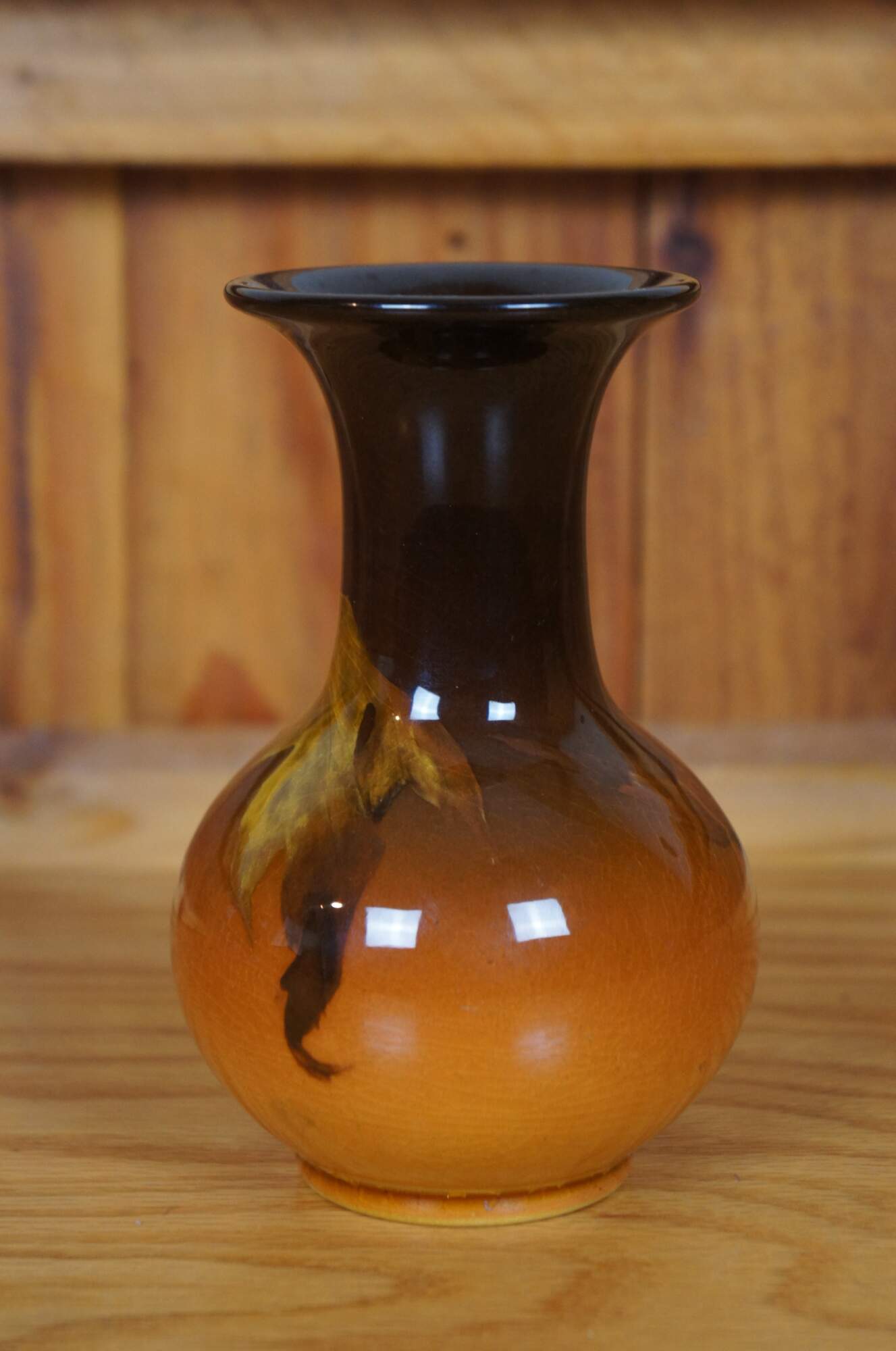 Antique Rookwood Irene Bishop vase or urn featuring Art Nouveau / Arts & Crafts styling with an Autumn Oak leaf motif of browns and orange glaze. Cirac 1901. Shape 40. Signed IB for Irene Bishop.