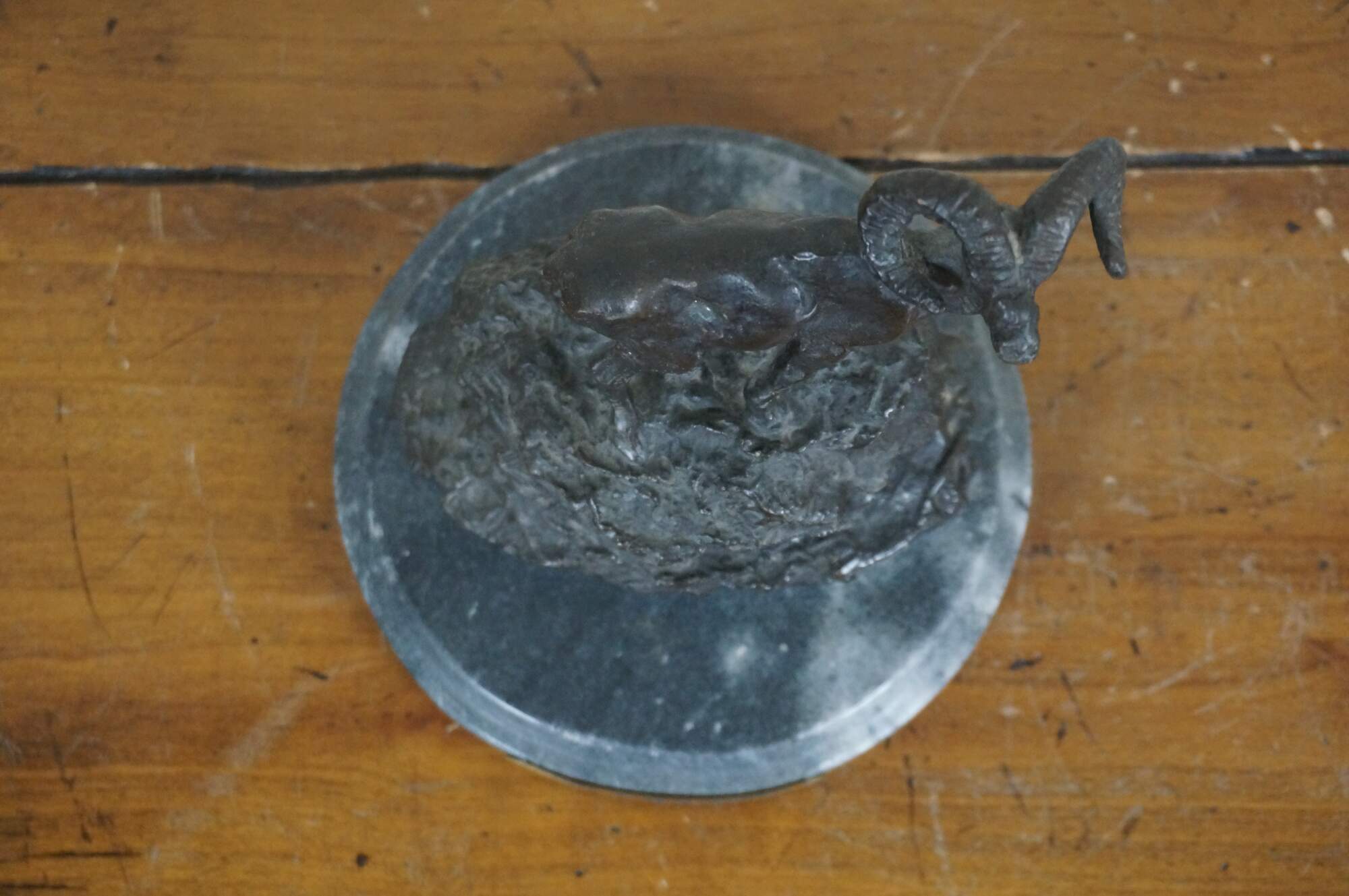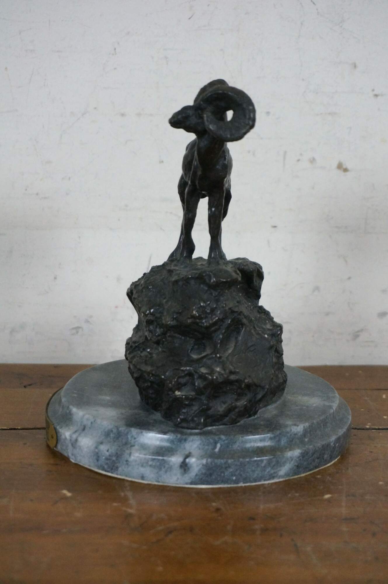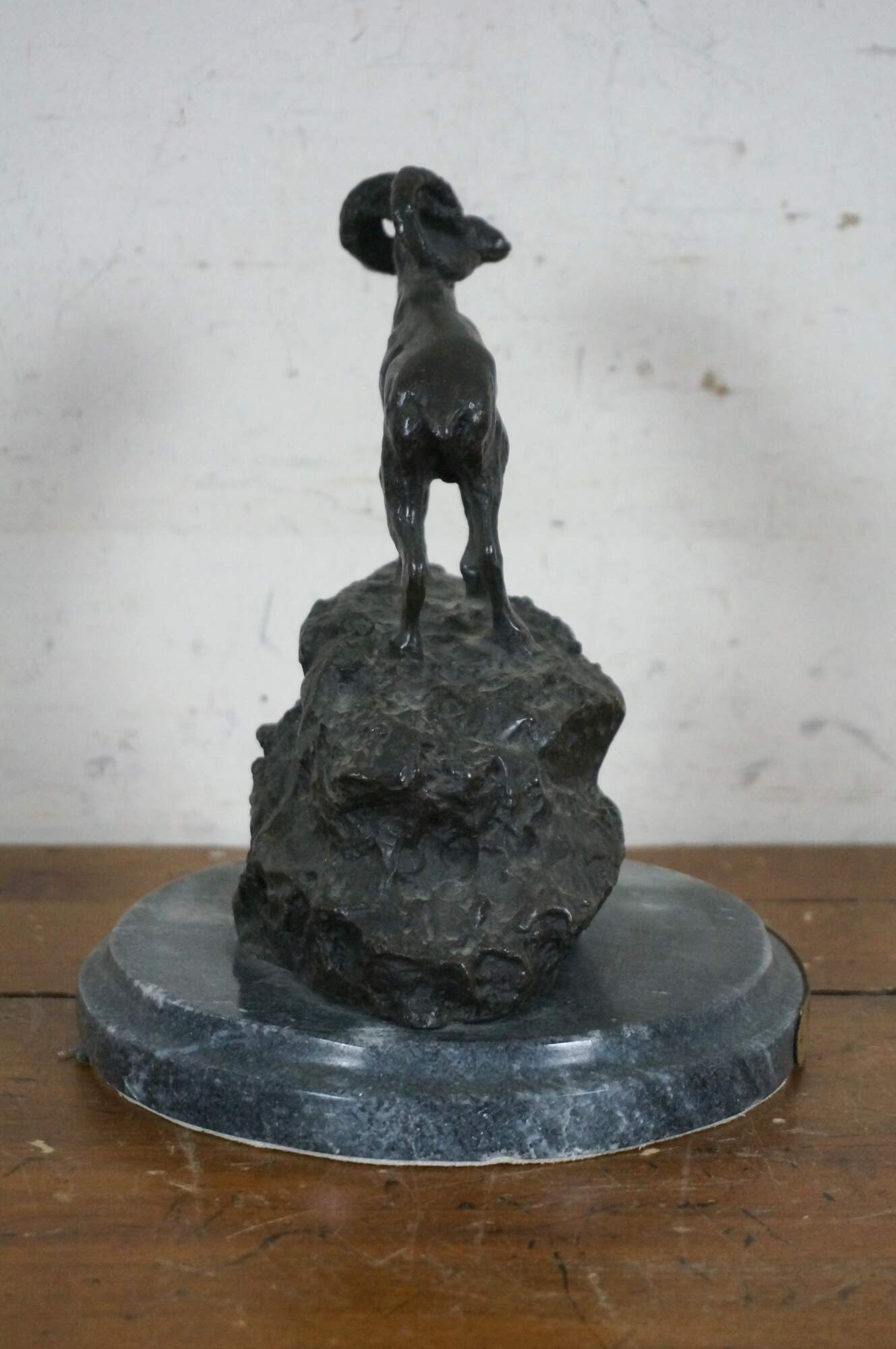 20th century bronze sculpture / figurine after "Big Horn Sheep" by C.M. Russell. Depicts a muscular big horn sheep standing proudly on a boulder. Marked CMR on one side. Gray marble base with felt bottom and brass name plate.