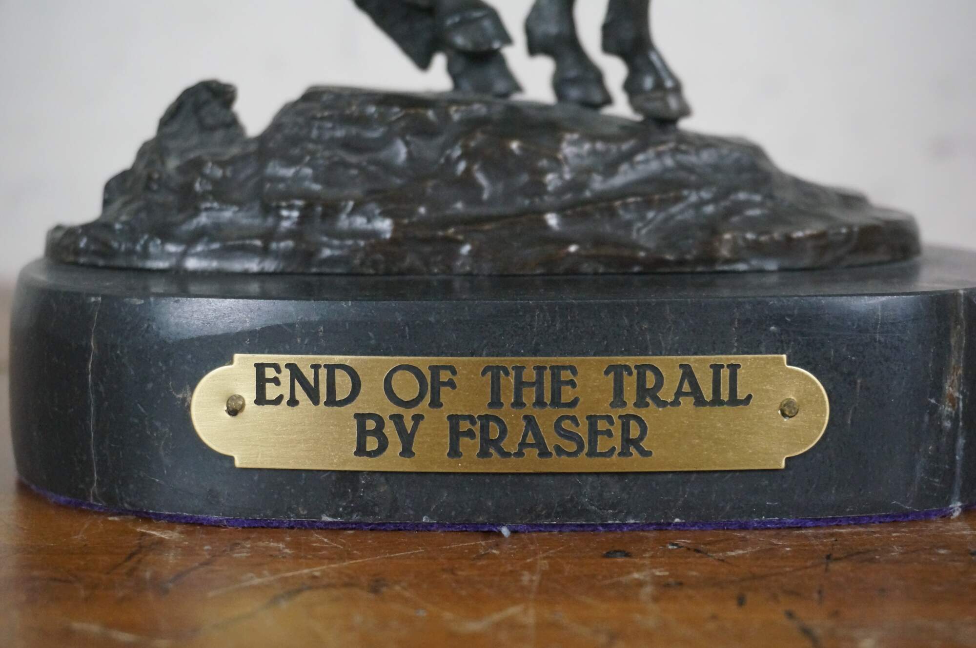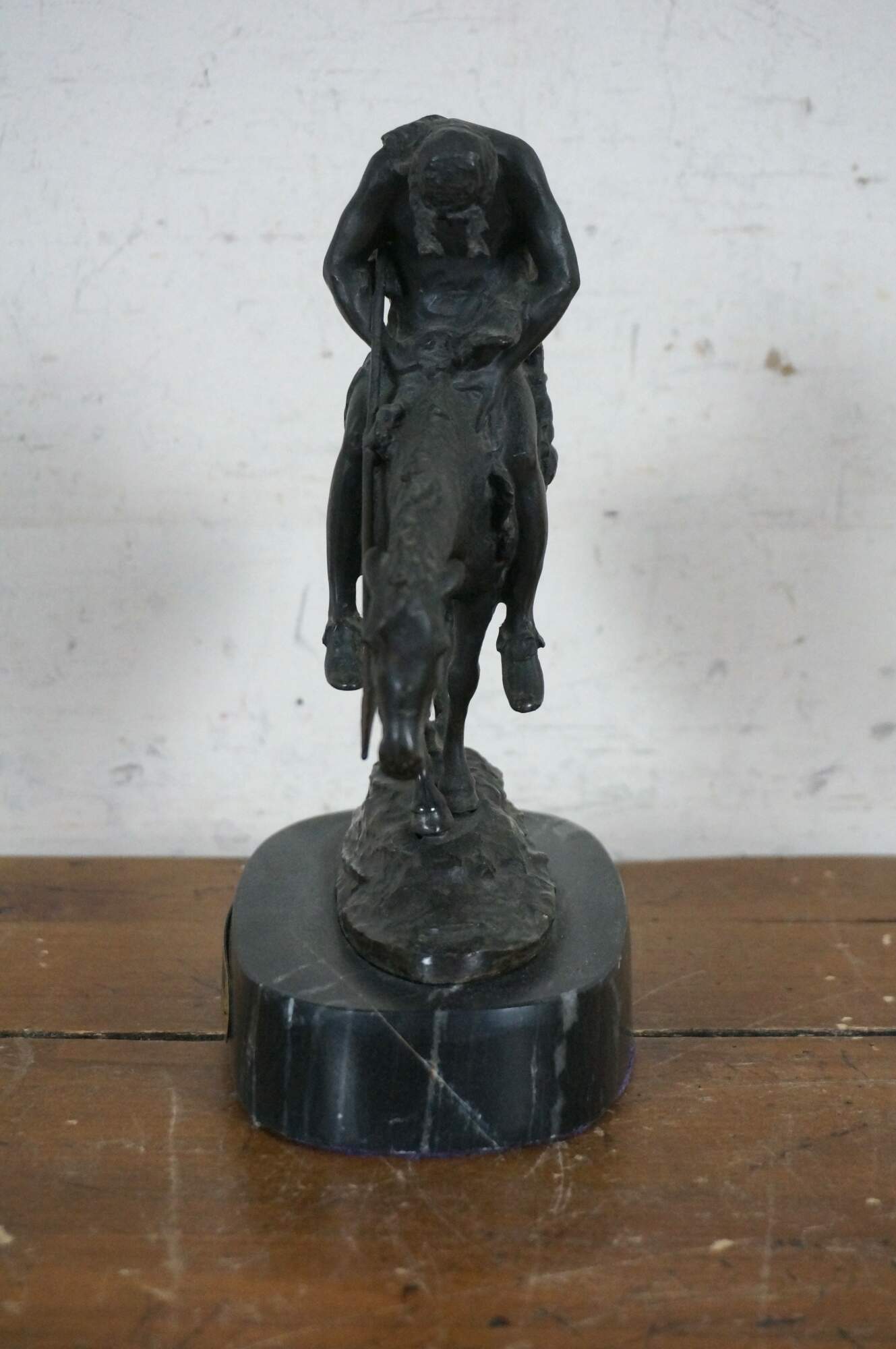 20th century bronze equestrian figurine / sculpture after "End of the Trail" by James Earle Fraser. Depicts a weary Native American man on an equally weary horse. Gray marble base with felt bottom and brass name plate.