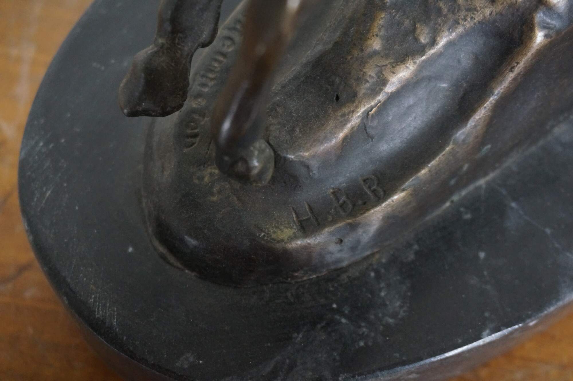 20th century bronze equestrian sculpture / figurine after "Arizona Cowboy" by Frederic Remington. Depicts an arizona cowboy / cavalry officer on a horse traversing a steep rock. Marked Frederic Remington 1897 H.B.B. around front hooves. Gray marble base with felt bottom and brass name plaque.