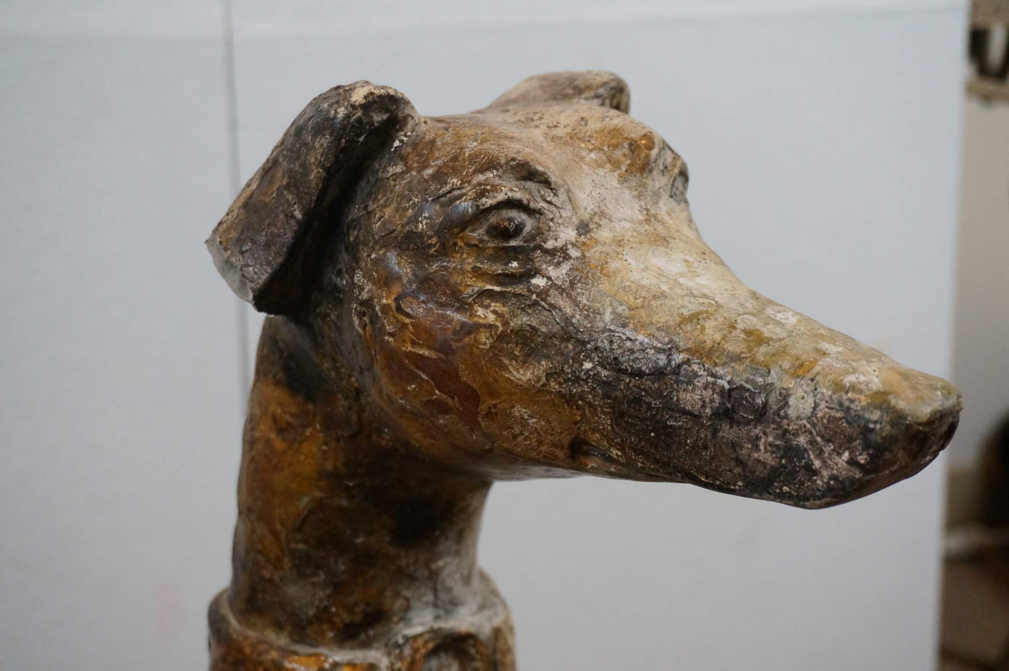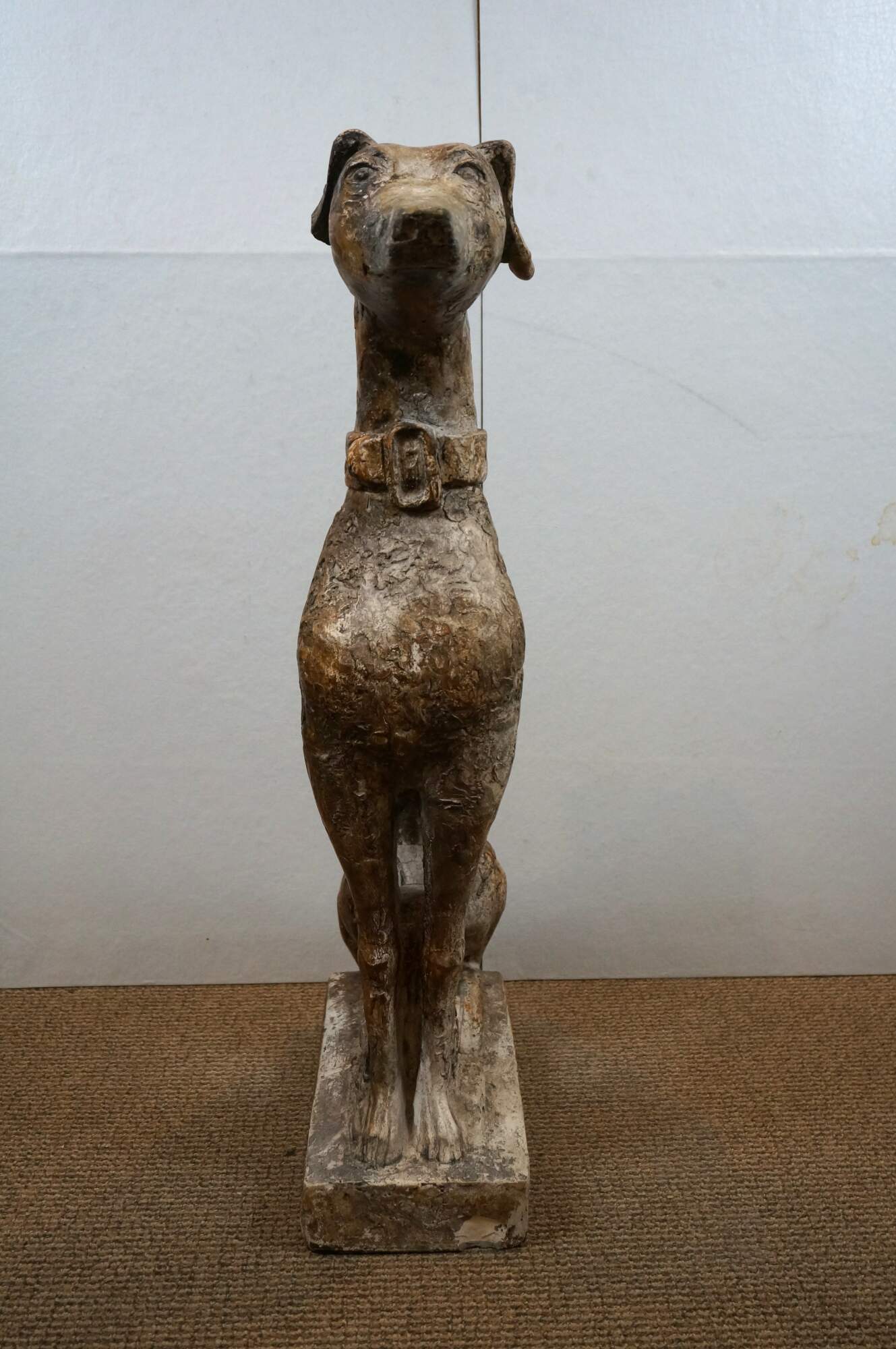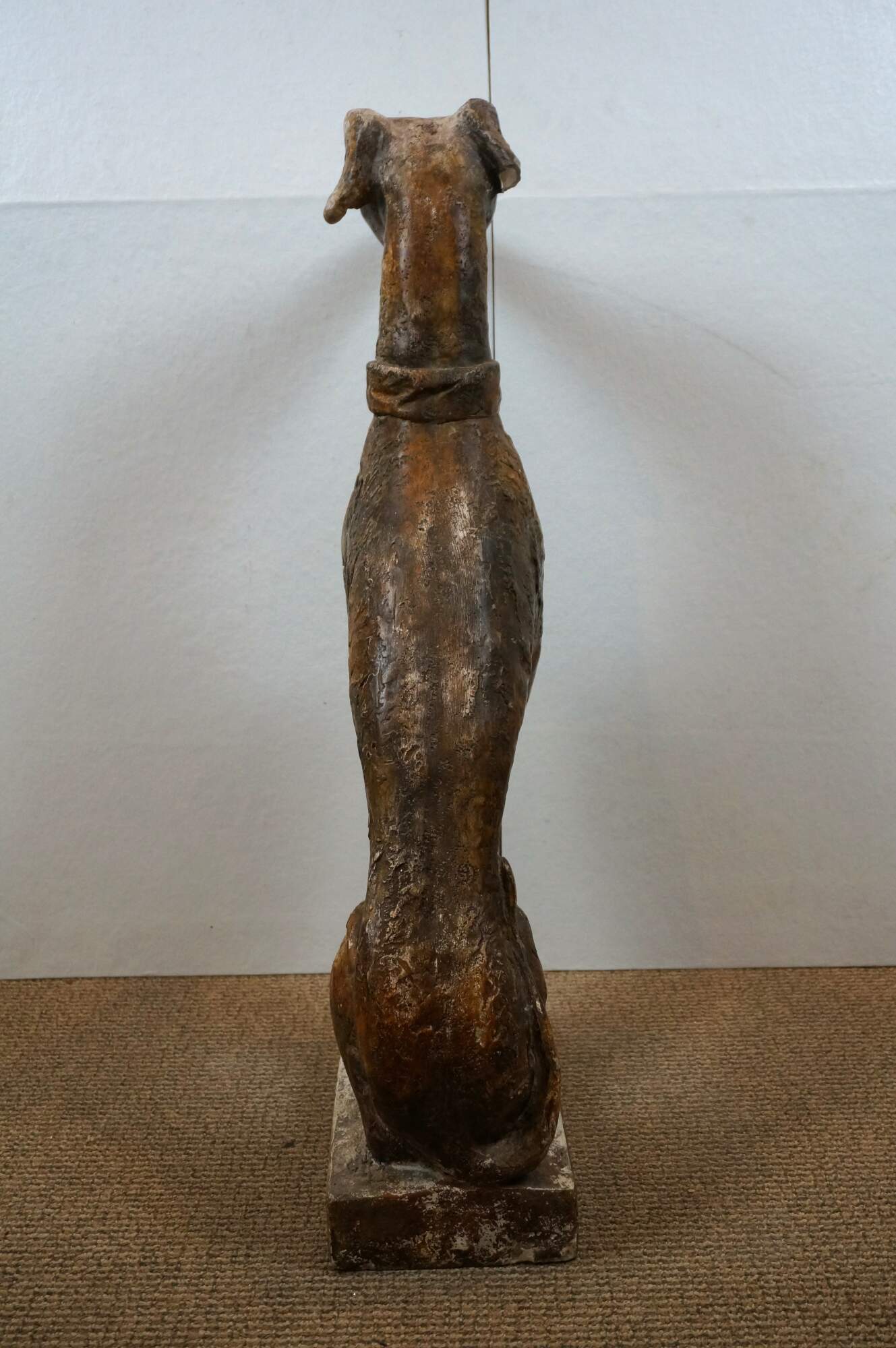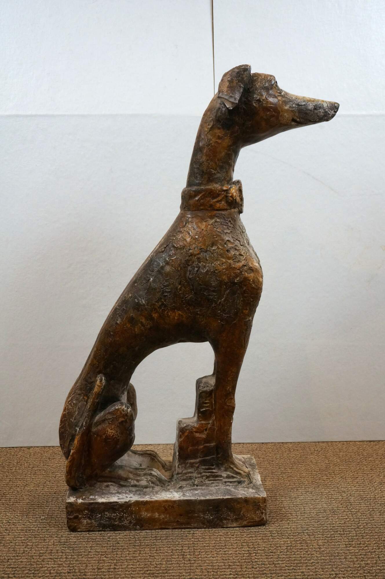 Late 20th century life sized composition sculpture depicting an Italian Greyhound or whippet wearing a wide collar, seated attentively on a rectangular base. Rough mottled brown finish. Not water resistant - for indoor display only.