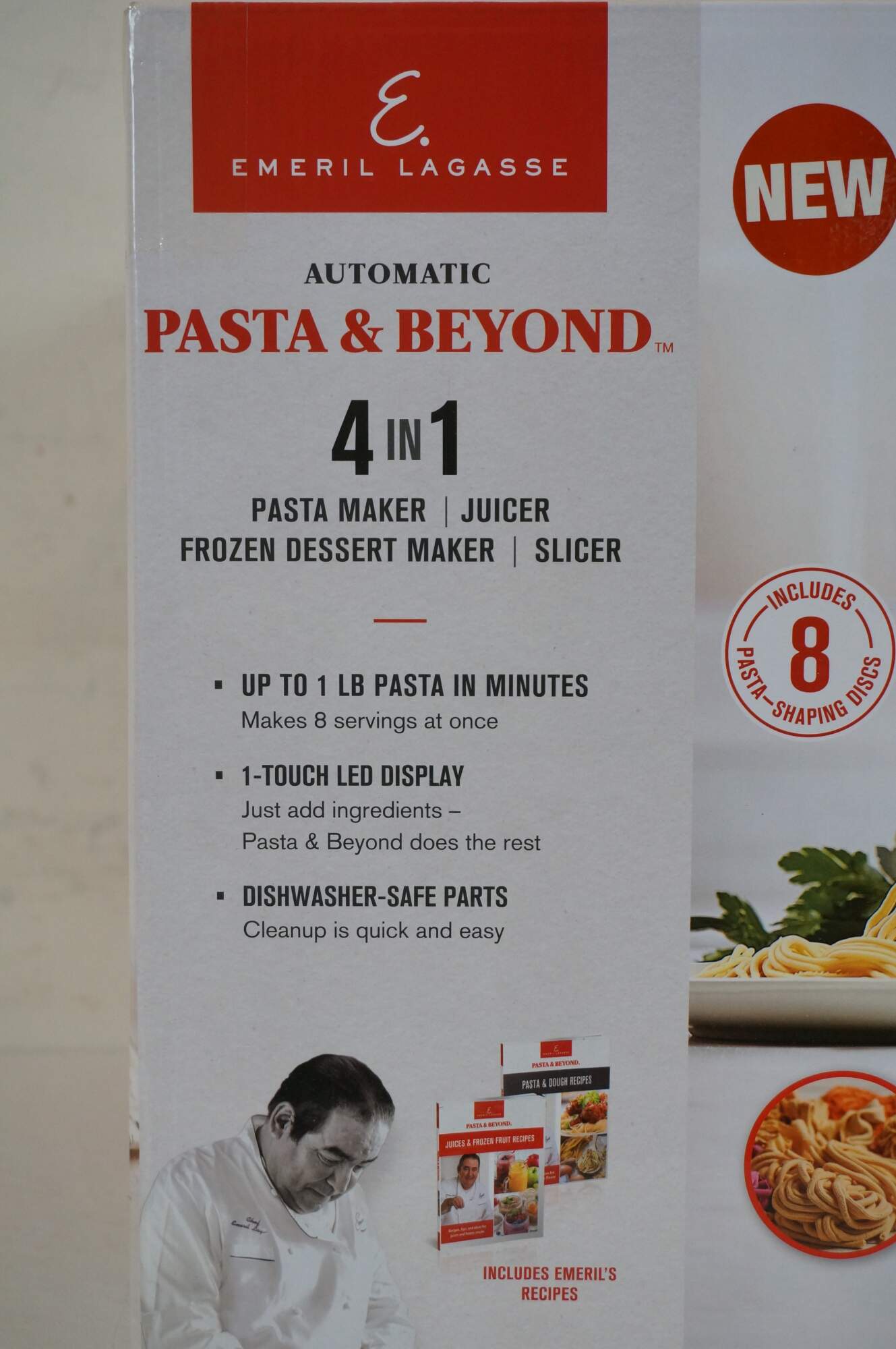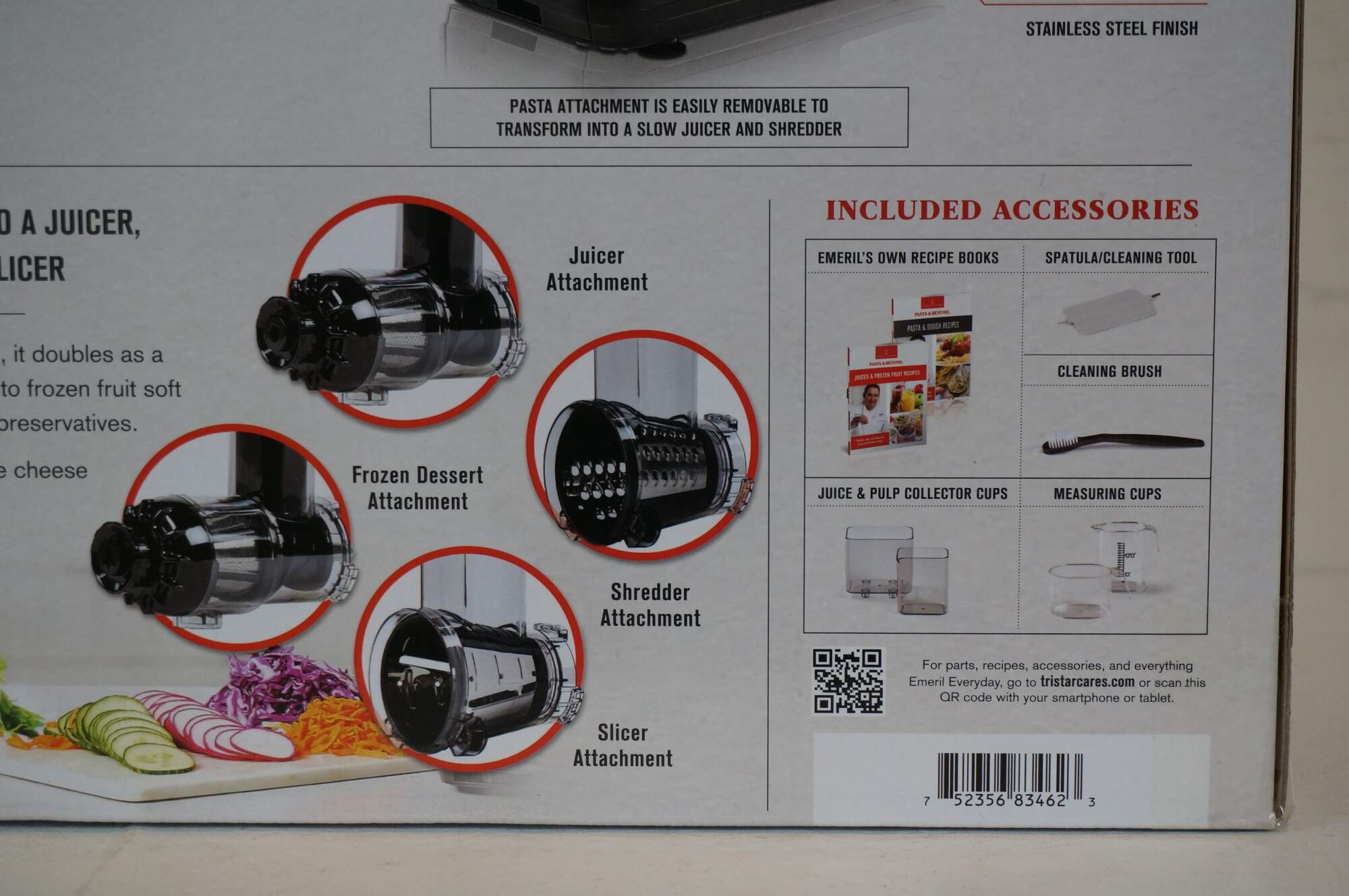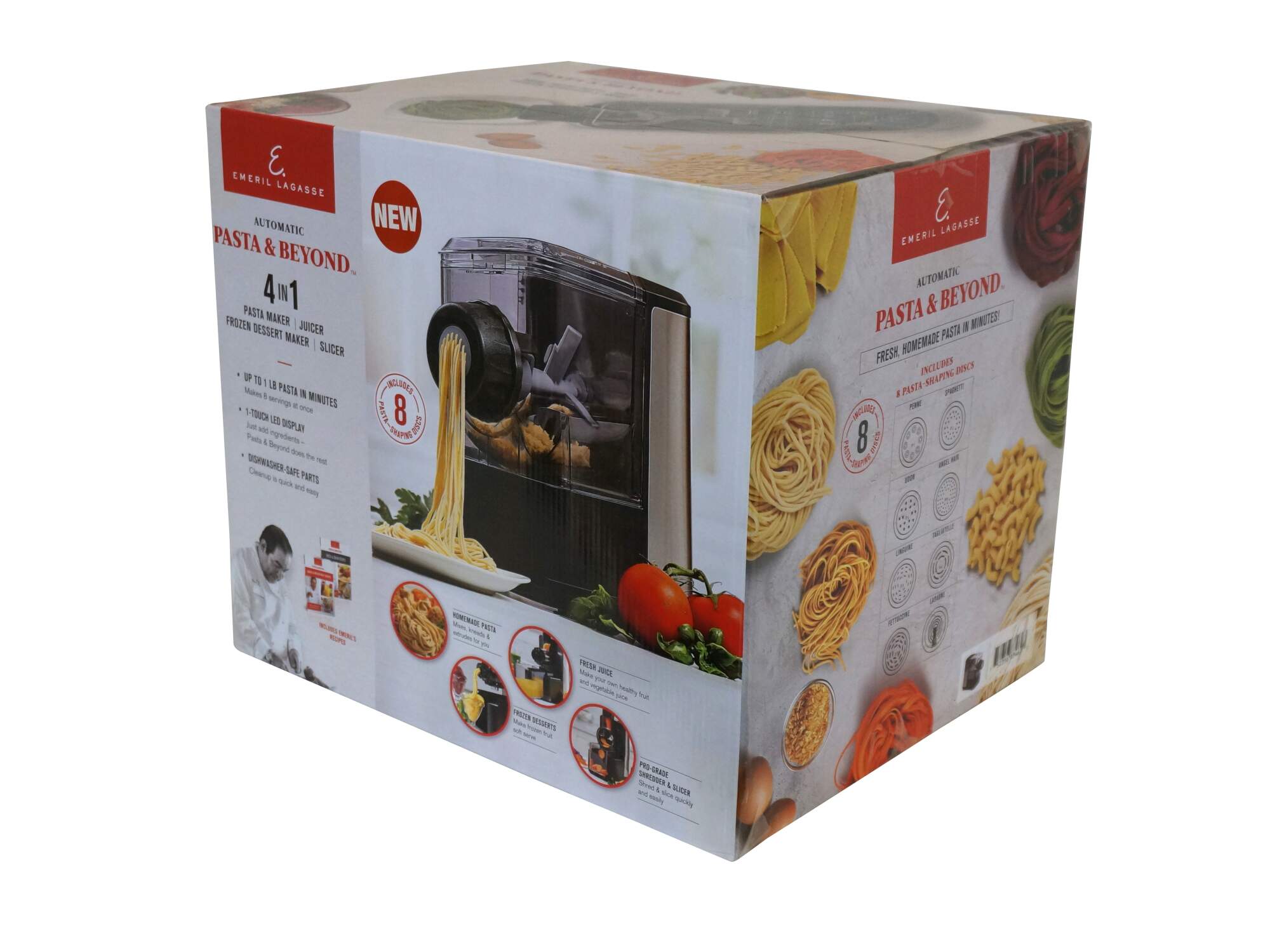 Emeril Lagasse Automatic Pasta & Beyond 4 in 1 pasta maker, juicer, frozen dessert maker, slicer. Stainless steel finish.